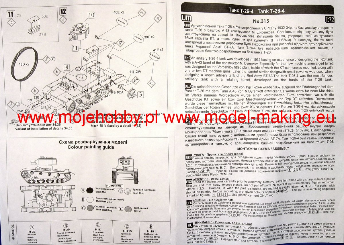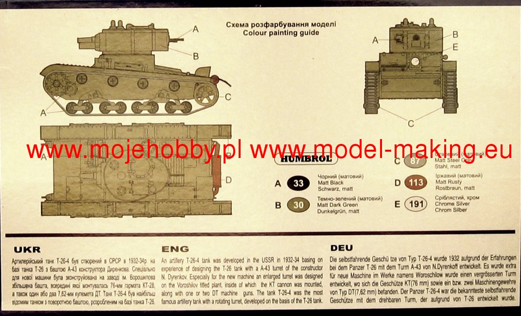 Т-26 советский лёгкий танк межвоенного периода и Великой Отечественной войны. Первые опытные образцы этой машины были изготовлены в 1931 году, а на вооружение машина поступила в 1931-1932 годах. За время производства было выпущено около 12 000 автомобилей этого типа, а также производные версии и специализированные автомобили! Боевая масса танка Т-26 в базовой версии составляла до 8,2 т. Привод обеспечивался одним 12-цилиндровым карбюраторным двигателем ГАЗ мощностью 90-91 л.с. Основное вооружение состояло из одной 45-мм пушки wz.1932 или wz.1934 и от 1 до 3 7,62-мм пулеметов ДТ. По сути, Т-26 был далеко идущим развитием британского Vickers 6-Ton. Машина также была основной советской машиной поддержки пехоты в 1930-х годах и в начале Второй мировой войны. Также стоит помнить, что первые прототипы машины и первые серийные партии имели две башни (Т-26 образца 1931 и 1932 годов), только с 1933 года танк выпускался в однобашенном варианте с 45-мм пушкой в качестве основного вооружение. В ходе производства было создано несколько вариантов Т-26 и специализированных модификаций, в том числе: Т-26 обр. 1938 г. (вариант с новой башней, с наклонными стенками), ЧТ-130 и ЧТ-133 (специализированные машины с огнеметы) и вагон СТ-26 (мостовой танк). Машины Т-26 принимали участие в многочисленных конфликтах 1930-х годов, включая пограничные инциденты в Маньчжурии в 1934-1945 годах и гражданскую войну в Испании (1936-1939 годы). Танки этого типа в значительных масштабах применялись также во время агрессии против Польши в сентябре 1939 г., в ходе Зимней войны (1939-1940 гг.), а также в войне с Японией 1939-1940 гг. Они также широко использовались на начальном этапе германо-советской войны в 1941 году. Стоит отметить, что существуют мнения о том, что последние модификации Т-26 (например, образца 1938 или 1939 года) мало чем уступали немецким танкам во время операций Барбаросса или Тайфун.
