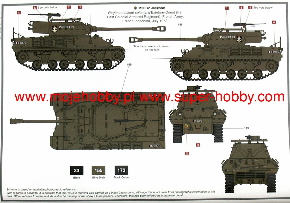 The M36 Jackson or Slugger is an American tank destroyer from the Second World War. The M36 entered combat in the second half of 1944. Despite such a late deadline, he managed to be famous for destroying a large number of enemy vehicles, especially during the German offensive in the Ardennes. Most of the design was based on the proven M10, but a typical turret was introduced that worked in conjunction with the best 90mm M3 anti-tank gun from the American arsenal of the time. Together with the newly introduced new HVAP missiles, it was able to penetrate all German armor without exception. In fact, the M36 Jackson was the only American armored vehicle capable of dealing with the German Tigers and Panthers on its own. The effect of effectiveness was high demand and production, which reached 1,400 units in less than a year. After World War II, M36 continued to be used in fighting in Korea, India's war with Pakistan, and even the Balkan conflicts. In addition to the basic version, two others were produced: M36B1 (turret mounted on the Sherman M4A3 body) and M36B2 (M10 with M36 turret and diesel engine). Technical data: length (with a barrel): 7.46m, width: 3.05m, height: 3.28m, weight 29t, engine power: 450KM, speed: 42km / h, armament: 1 90mm M3 cannon, 1 12.7mm Browning HB M2 machine gun.