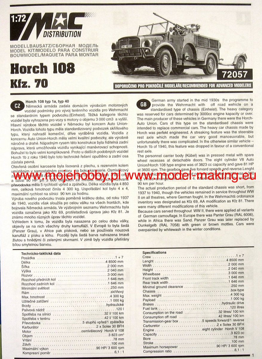 The Horch 1A (or: Horch 108) was a German off-road passenger car from the interwar period and World War II. The first prototypes of this car were built in the mid-1930s, and serial production started in 1938 and lasted until 1941. The length of the vehicle was 4.85 m, with a height of 2.04 m and a width of 2 meters. The curb weight was up to 3,600 kilograms. The drive was provided by a single, 8-cylinder Auto-Union engine with a capacity of 3.8 liters and power up to 81 HP. With time, however, the Ford engine (produced in Germany) with a capacity of 78 HP was used. The Horch 1A was developed for the needs of the German armed forces, which, along with its rapid growth after 1933, aimed at obtaining a universal, light and possibly reliable passenger-off-road vehicle. The Horch plant met these needs by developing the vehicle presented below. The vehicle uses such solutions as, for example, all-wheel drive, independent suspension of each wheel or the possibility of turning all wheels. Anyway, the last solution turned out to be highly unsuccessful in the course of operation. It is worth noting that already in the course of World War II, the design of the car was simplified, which was manifested by, for example, the abandonment of the recesses in the fuselage for spare wheels. Horch 1A served in the German armed forces on virtually all fronts until 1945.