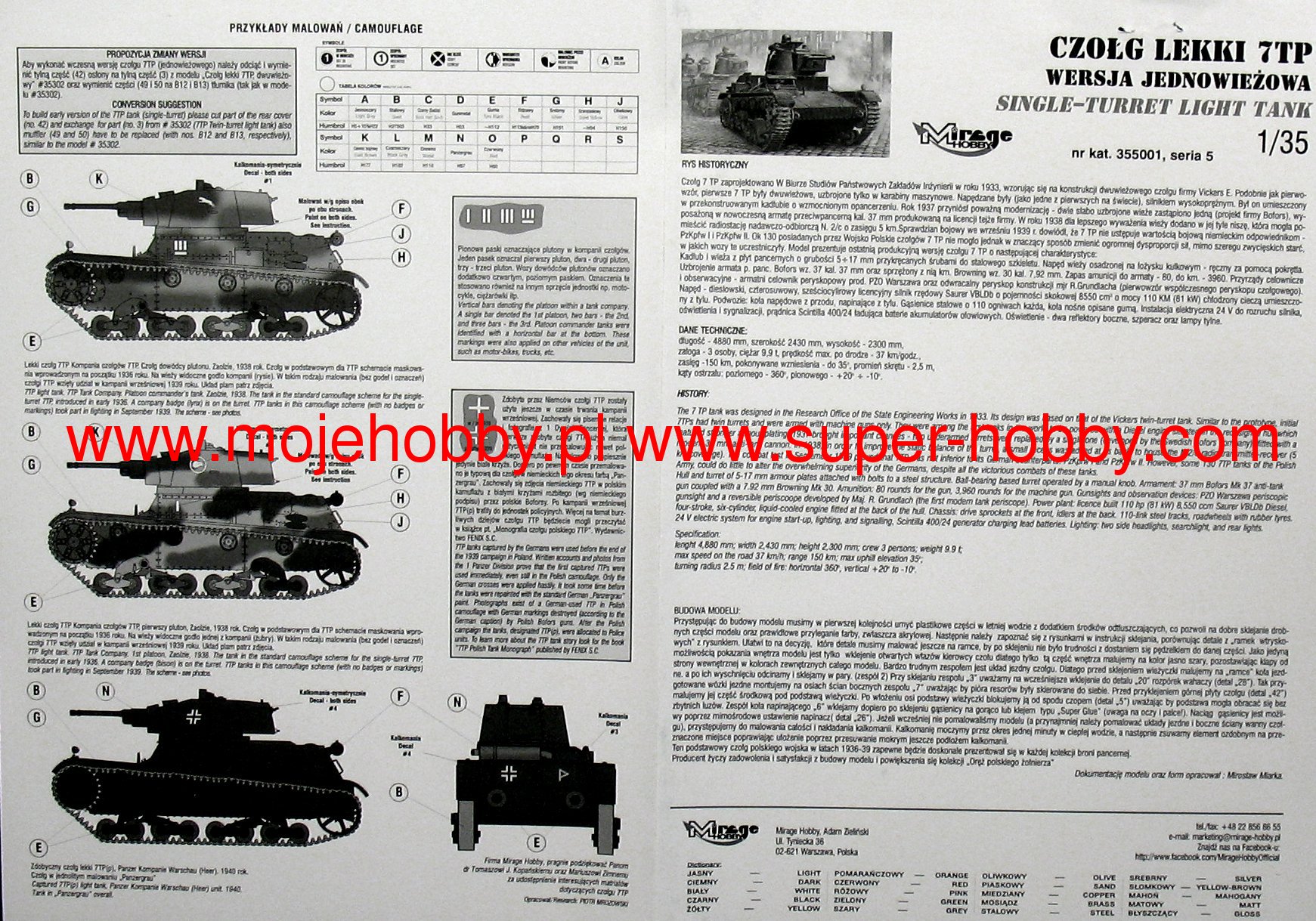 Download Mirage Hobby PDF cataloguePolish light tank from the beginning of World War II. The 7TP tank, along with the tankettes (e.g. TKS), was the basic element of the Polish armored forces in 1939. 7 TP was designed at Państwowe Zakłady Inżynierii in Ursus, where it was also produced since 1935. The tank is a development of the British Vickers E, the license of which was acquired by Poland in the early 1930s. The first 24 examples of the 7TP were twin-turret vehicles, the next serial ones (built from 1937) already had one turret, and the main armament was the anti-tank gun. 37mm by Bofors. The 7TP tank was a technically advanced design for its time. It was one of the first in the world to have a diesel engine, a reversible periscope, and in some copies also radio stations (RKBc 2N / C) with a range of up to 25 km. During the September campaign, around 130 tanks of this type of all variants were used. The 7TP proved itself on the battlefields of September 1939 as an opponent towering over the German Pz.Kpfw I and II, and at least equal to the Pz.Kpfw III and IV. Technical data: weight 9.4-9.9t, engine power: 110HP, speed: 37km / h, armament (single turret version): 1 Bofors 37mm cannon, 1 machine gun wz. 30 cal. 7.92mm.