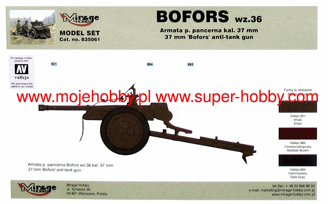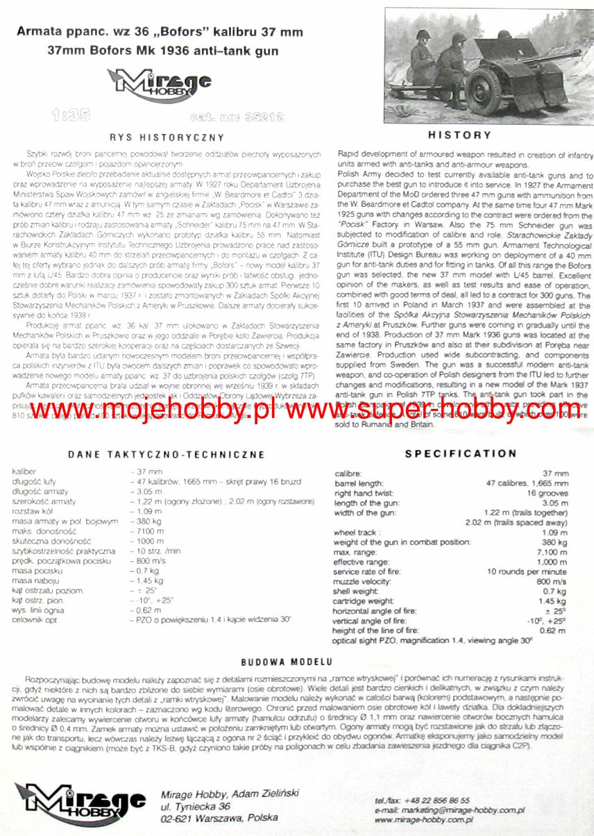 Download Mirage Hobby PDF catalogueBofors wz. 36 (full name: 37 mm wz. 36 gun or 37 mm Bofors L / 45 / M ) is a Polish 36mm anti-tank gun, produced under a Swedish license from the interwar period and World War II. The own weight of the weapon was 930 kilograms, with a barrel length of 166.5 centimeters. With a well-trained crew, the gun rate of fire was up to 10 shots per minute. The maximum range was about 7,000 meters. The Bofors wz.36 gun was adopted by the Polish Army in 1936 as the basic anti-tank weapon for infantry and cavalry units. The weapon had many advantages. First of all, it was small, which greatly facilitated its transport and masking in the field. It was also relatively light. It could also penetrate armor up to 40 mm thick from a distance of 100 meters, which in the conditions of the September 1939 campaign turned out to be at least a good result. In the interwar period, the Bofors wz.36 gun enjoyed a very good reputation in the Polish Army, and its achievements in the September campaign also confirmed its high efficiency.