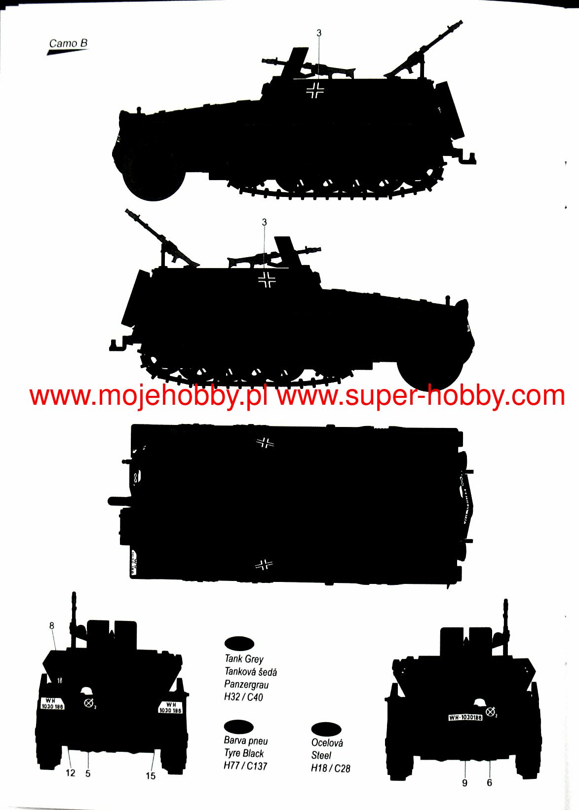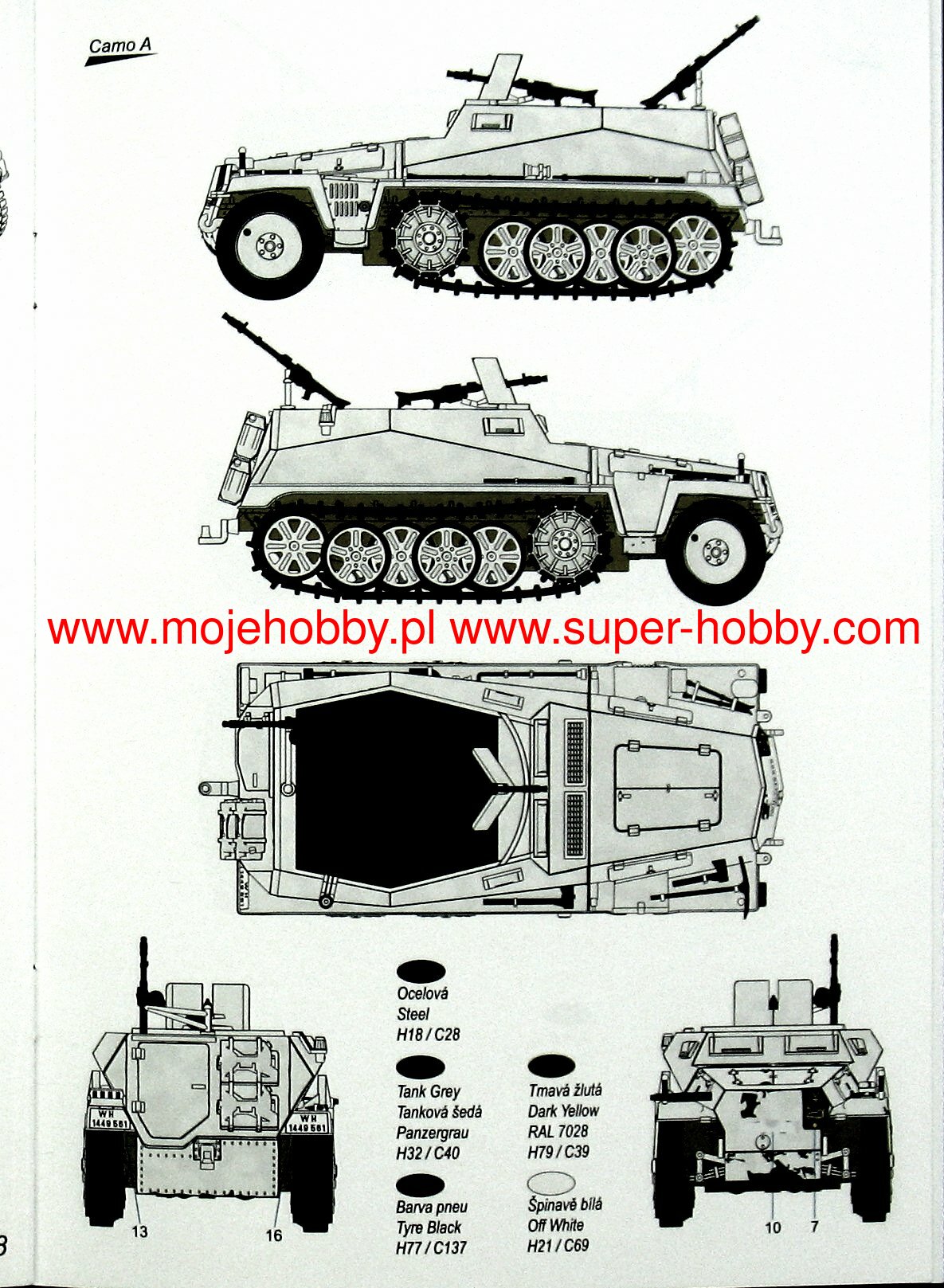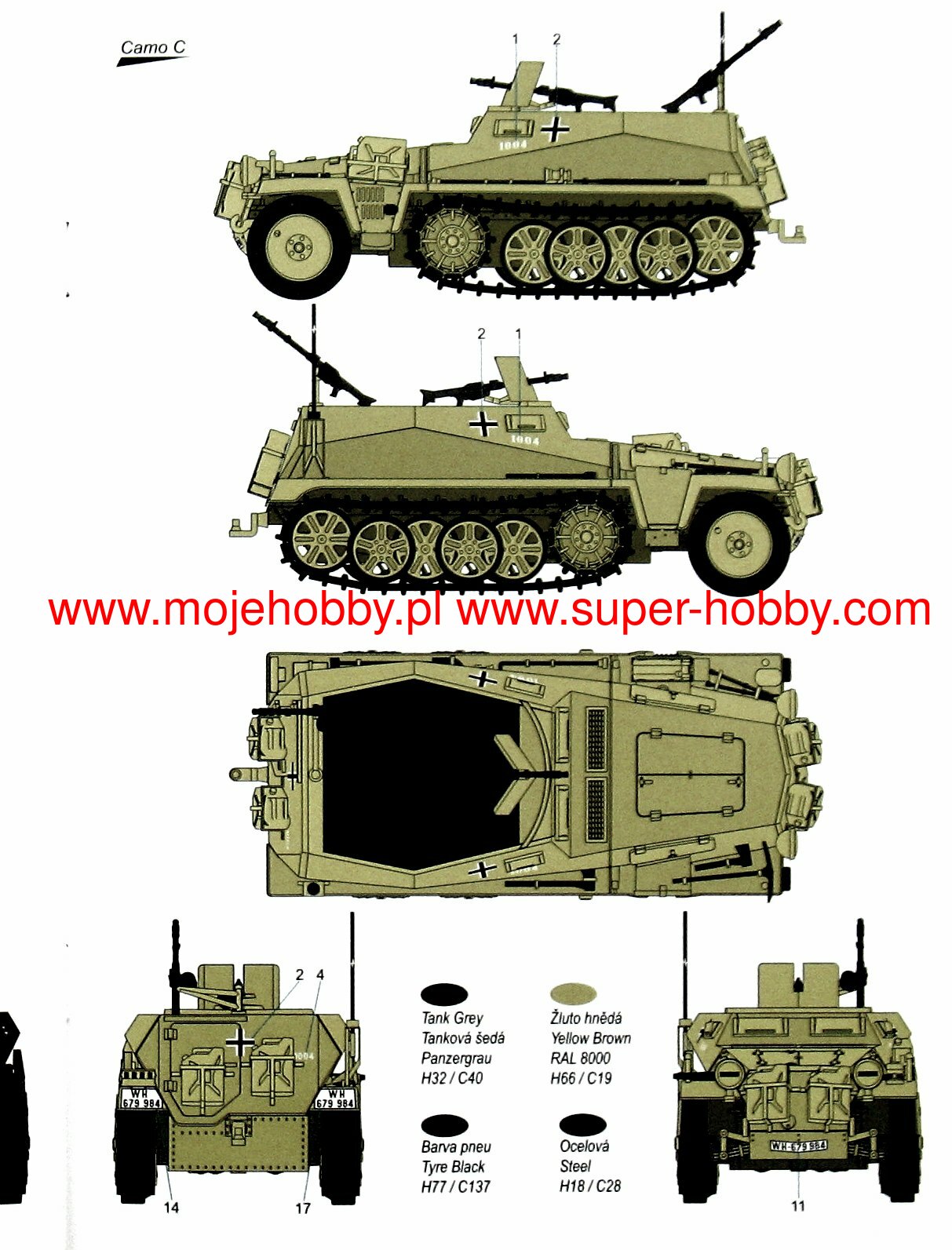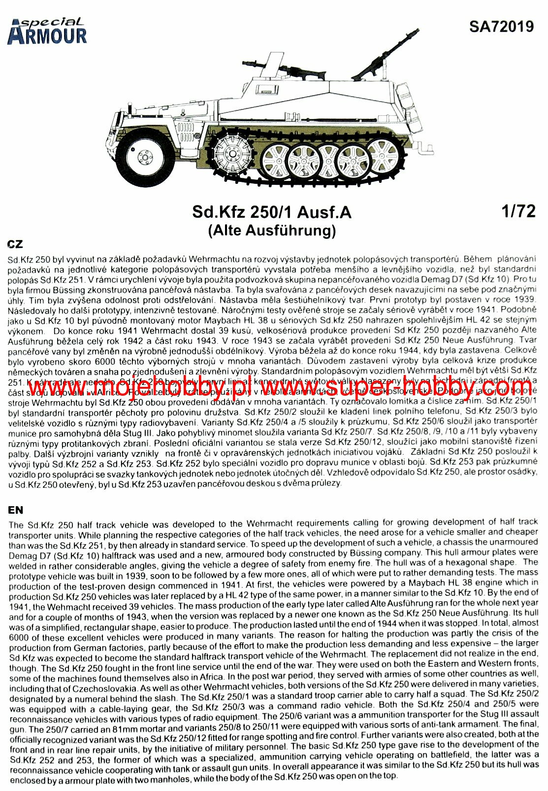 Sd.Kfz 250 was a German light, half-track armored transport from the Second World War. The first prototypes of the vehicle were created in 1939, and serial production continued in the period 1940-1944, ending with the production of about 6,700 units. The Sd.Kfz 250 was powered by a six-cylinder engine Maybach HL 42 TRKM with 100 hp . The Sd.Kfz 250 was developed as a light reconnaissance and multipurpose vehicle for the German armored divisions and panzer grenadiers. In the course of serial production, two versions of the Sd.Kfz 250 hull were created: the first (called "alt") had undercut side hull plates and a broken armor plate at the front of the hull. In 1943, the "neu" version was introduced, which was simplified: the hull sides were flat, as was the armor plate on the front of the car. During the Second World War, several variants and versions of the Sd.Kfz 250 were created. The first chronological version was the Sd.Kfz 250/1, which was the basic version and could function as a light infantry transporter or reconnaissance vehicle. Later, the Sd.Kfz 250/3 version appeared, which was a command version with a long-range loop antenna and a long-range radio. Later, a version armed with an 80 mm mortar (Sd.Kfz 250/7), a 28 mm anti-tank gun (Sd.Kfz 250/11) or a reconnaissance vehicle with a 20 mm cannon in a rotating turret (Sd. Kfz 250/9). Cars Sd.Kfz 250 of all versions were used primarily in armored divisions and armored grenadiers on virtually all fronts of World War II.