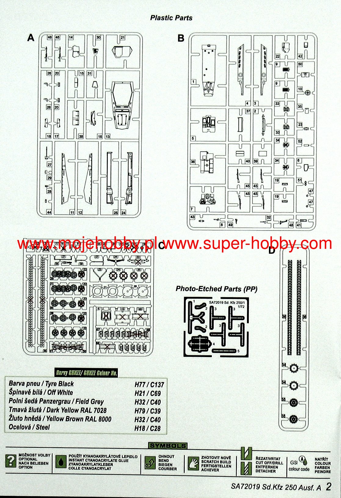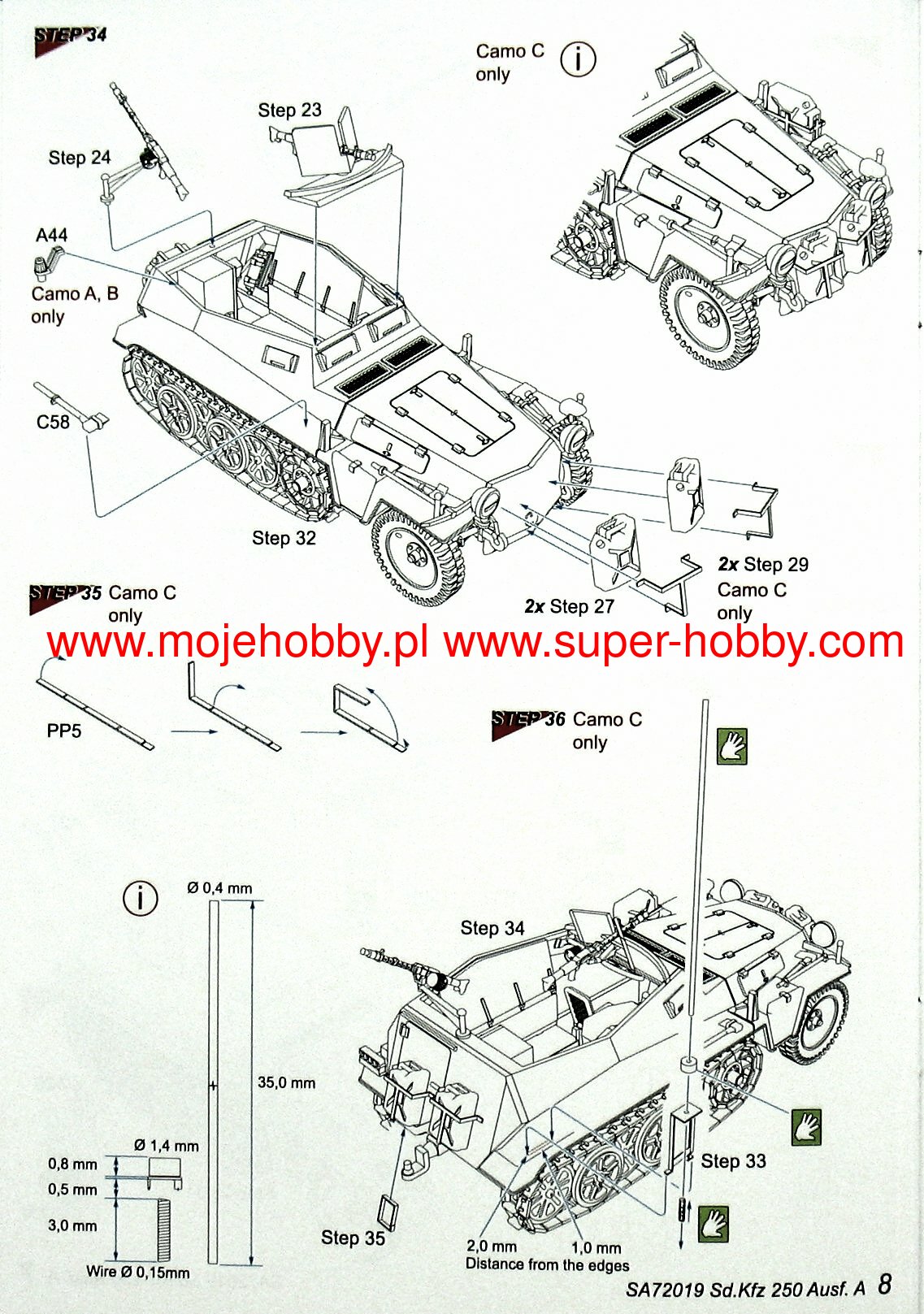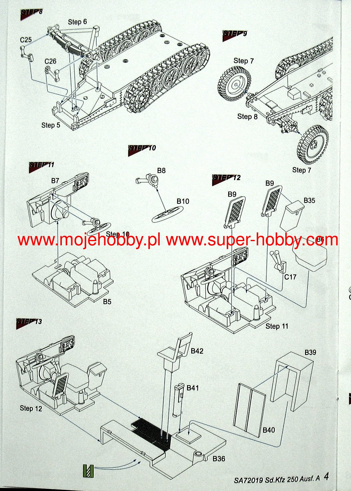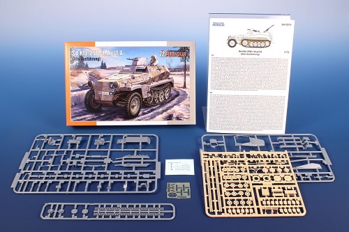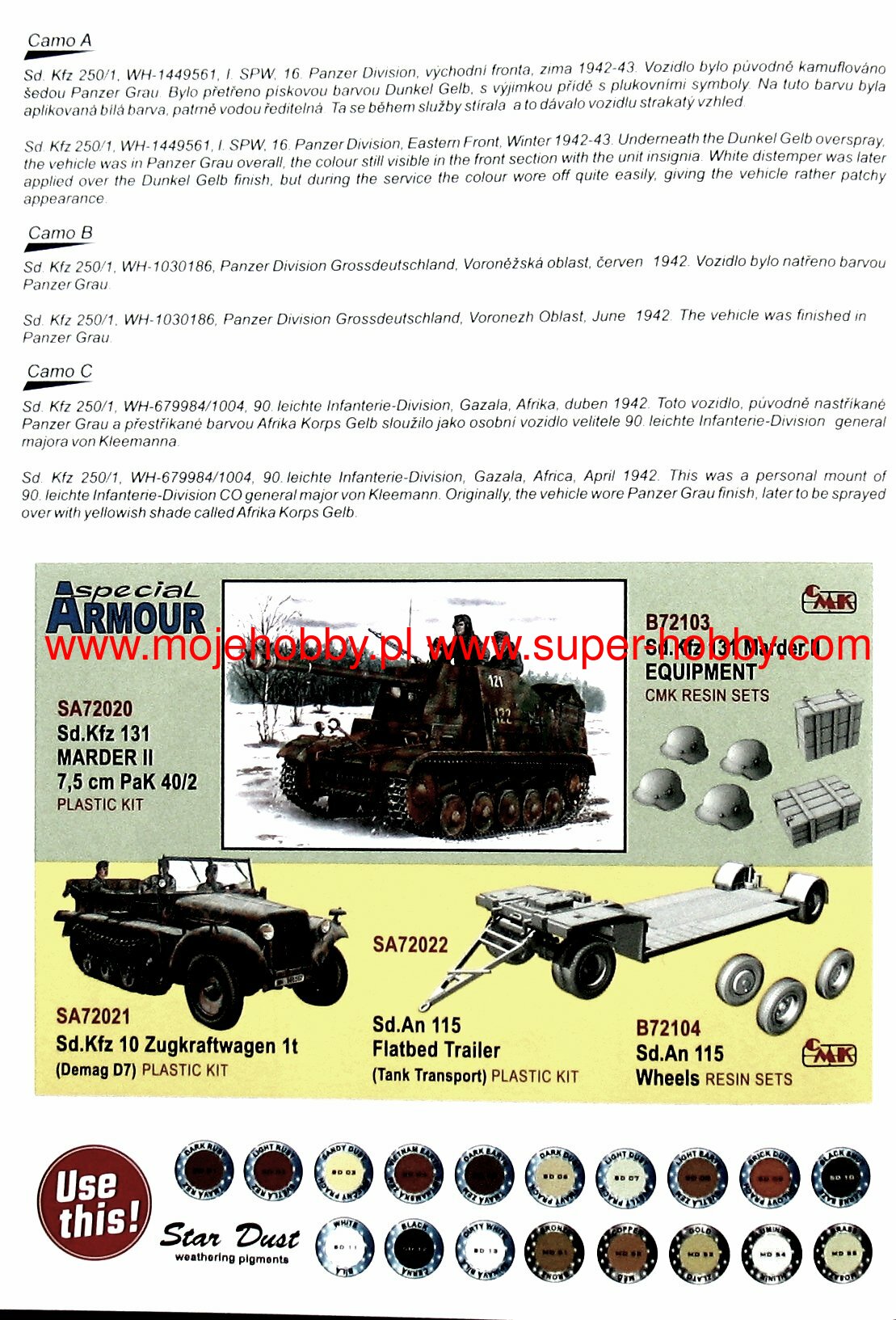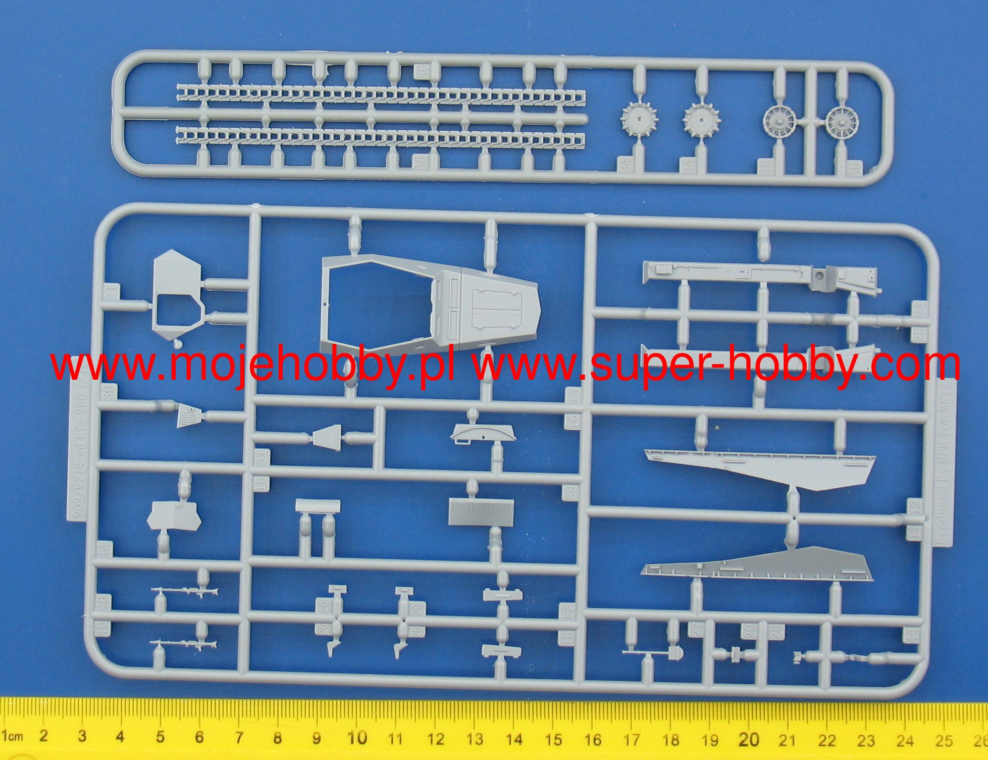 Sd.Kfz 250 was a German light, half-track armored transport from the Second World War. The first prototypes of the vehicle were created in 1939, and serial production continued in the period 1940-1944, ending with the production of about 6,700 units. The Sd.Kfz 250 was powered by a six-cylinder engine Maybach HL 42 TRKM with 100 hp . The Sd.Kfz 250 was developed as a light reconnaissance and multipurpose vehicle for the German armored divisions and panzer grenadiers. In the course of serial production, two versions of the Sd.Kfz 250 hull were created: the first (called "alt") had undercut side hull plates and a broken armor plate at the front of the hull. In 1943, the "neu" version was introduced, which was simplified: the hull sides were flat, as was the armor plate on the front of the car. During the Second World War, several variants and versions of the Sd.Kfz 250 were created. The first chronological version was the Sd.Kfz 250/1, which was the basic version and could function as a light infantry transporter or reconnaissance vehicle. Later, the Sd.Kfz 250/3 version appeared, which was a command version with a long-range loop antenna and a long-range radio. Later, a version armed with an 80 mm mortar (Sd.Kfz 250/7), a 28 mm anti-tank gun (Sd.Kfz 250/11) or a reconnaissance vehicle with a 20 mm cannon in a rotating turret (Sd. Kfz 250/9). Cars Sd.Kfz 250 of all versions were used primarily in armored divisions and armored grenadiers on virtually all fronts of World War II.