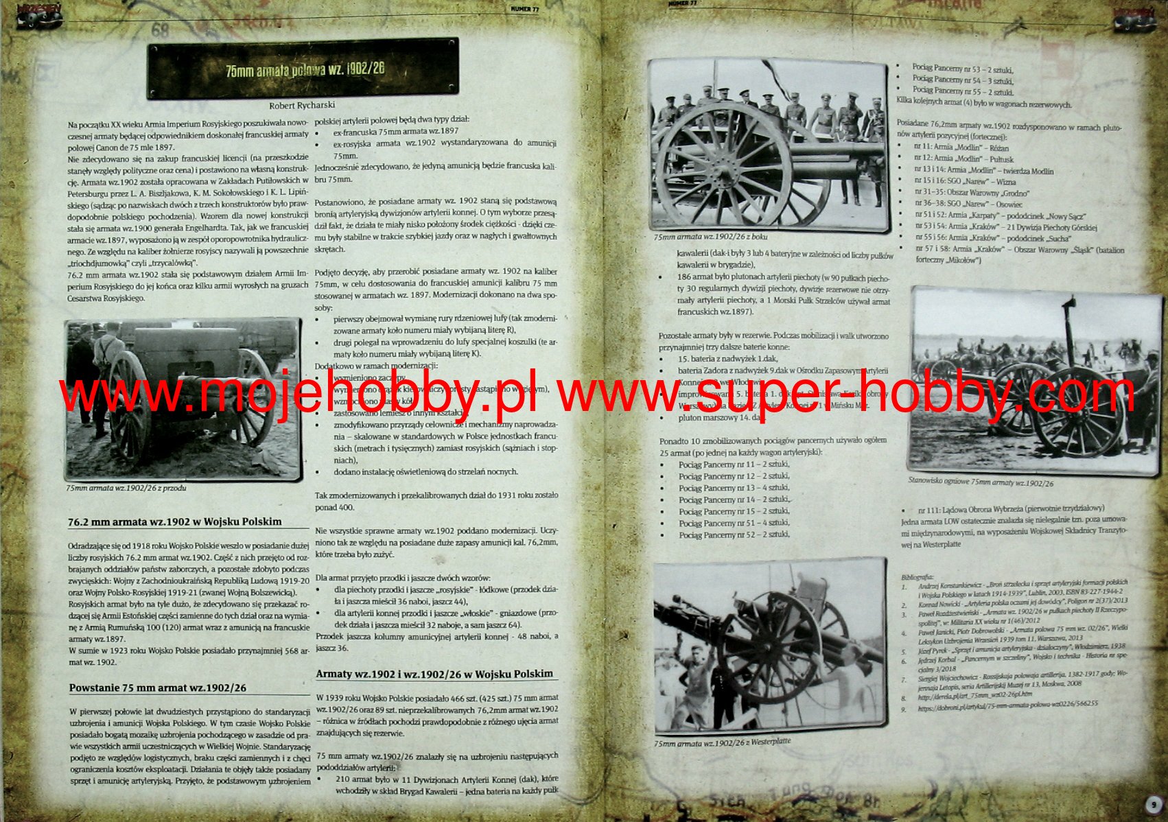 3-inch division cannon wz. 1902 was a Russian and Soviet 76.2 mm towed field gun from the First World War and the interwar period. Its first prototypes were built at the beginning of the 20th century, and serial production was carried out in the years 1903-1931. The initial velocity of the high-explosive shell fired from this gun was up to 588 m / s, and the rate of fire of 10-12 rounds per minute, with a maximum range of 6,500 meters. Division gun wz. 1902 was developed on the basis of many solutions of the great French 75 mm mle 1897 cannon. It was a relatively light gun, small in size and - at the beginning of the 20th century - with a good rate of fire, although lower than its French counterpart. The gun was mass-produced at the Putilovsky plant in St. Petersburg, and in order to make production cheaper, the use of metals such as nickel or manganese was reduced to a minimum, which, however, affected the service life of the serial guns. Division gun wz. 1902 was the main infantry support cannon in the Russian army throughout World War I. After the creation of the Soviet Union, the gun was still produced, and its extension was the wz.1902/30 gun. Division gun wz. 1902 also found its way to the equipment of the Polish Army, with a large number of it recalibrated from 76.2 mm to 75 mm in the 1920s.