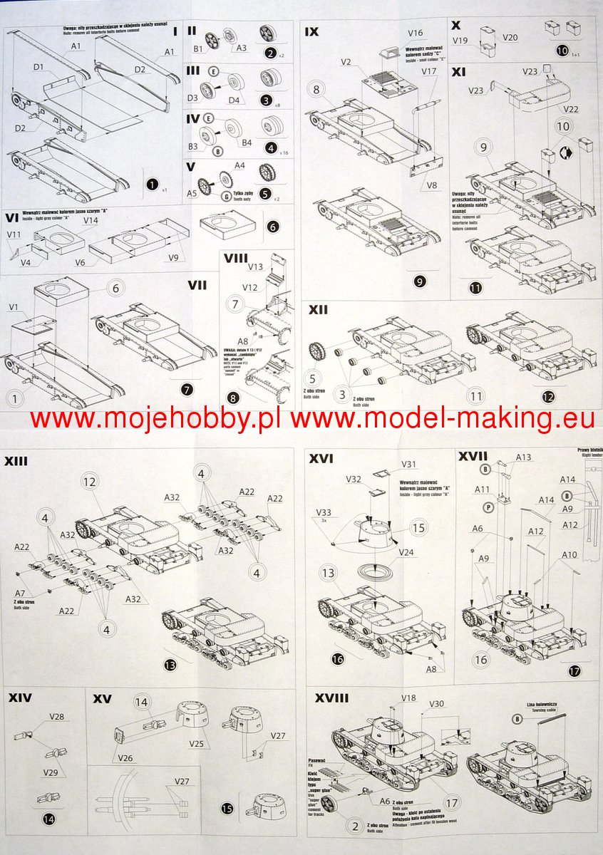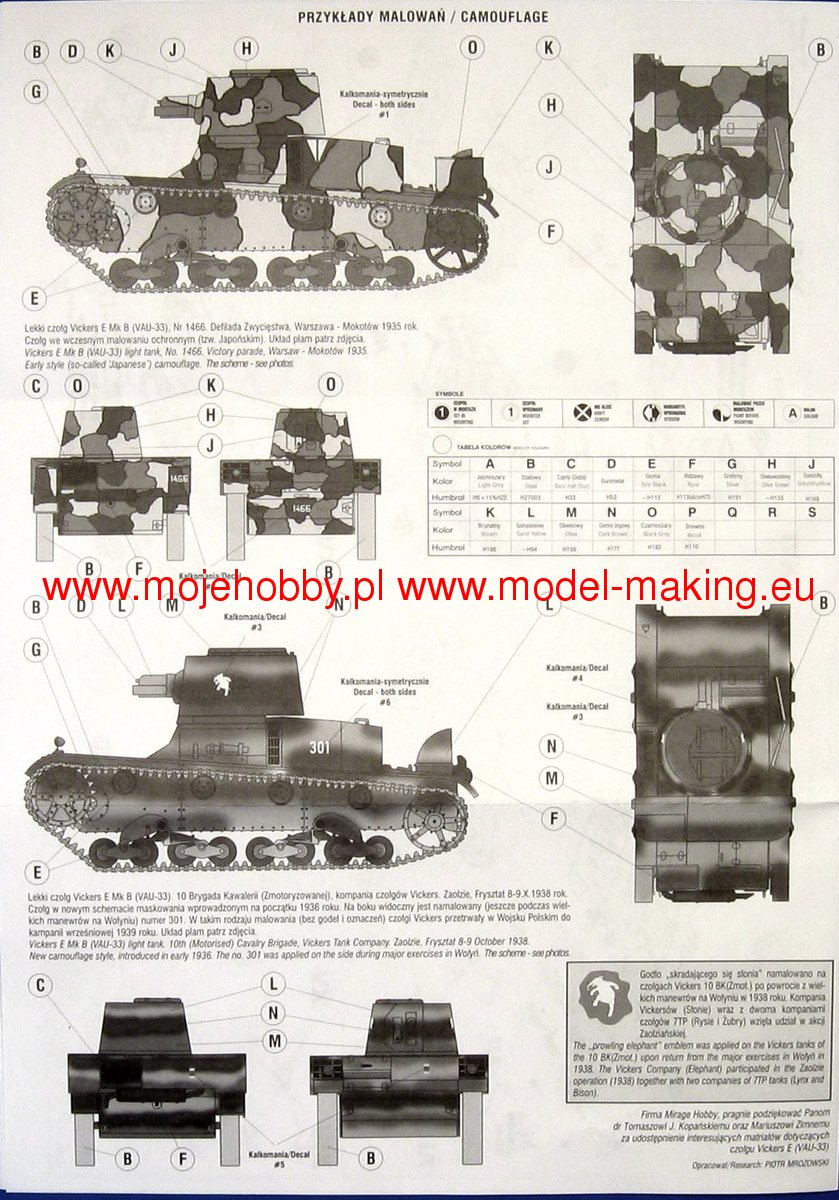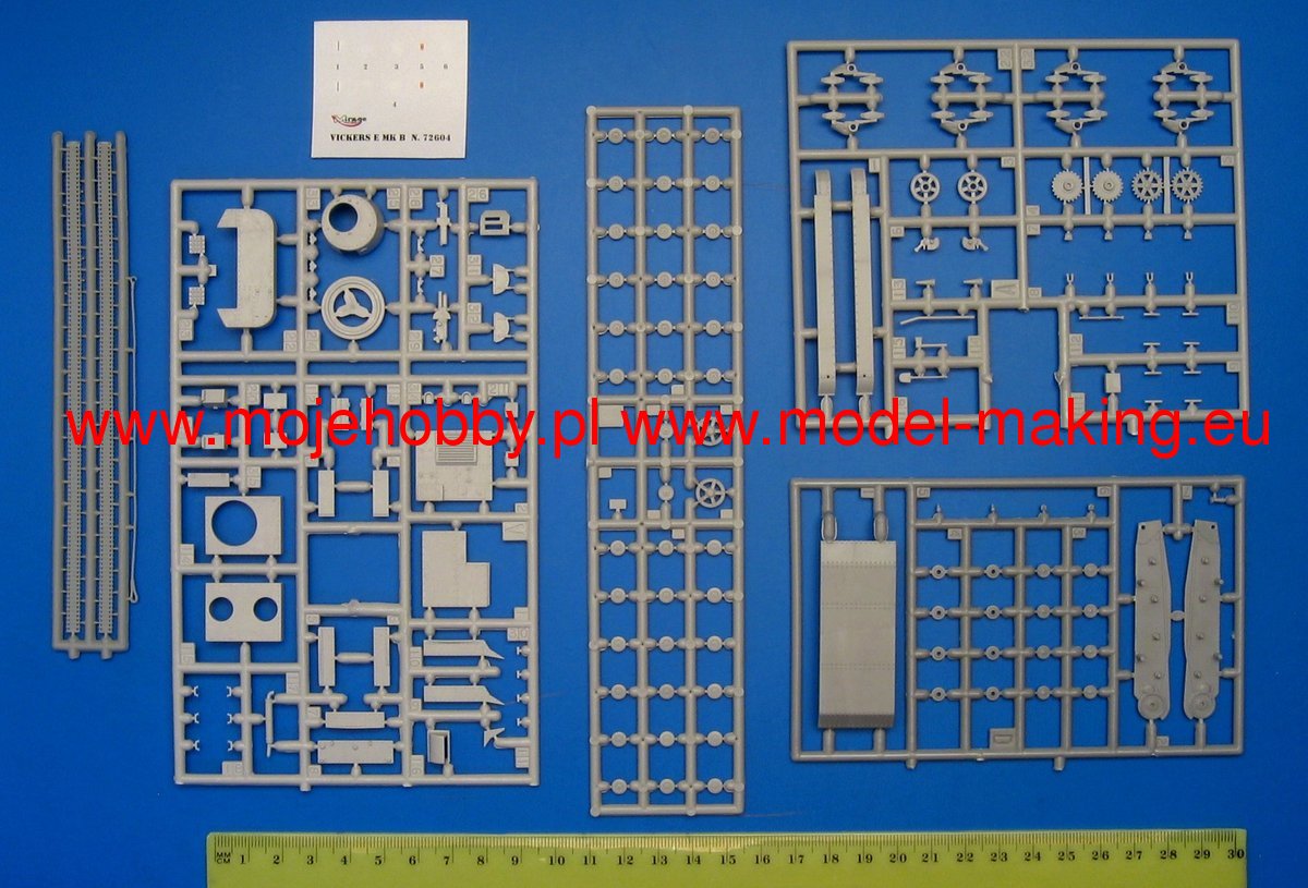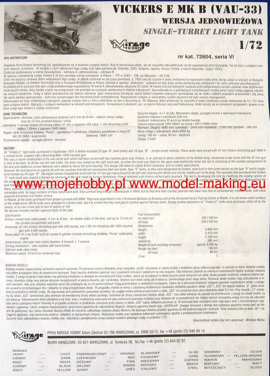 Download Mirage Hobby PDF catalogueThe Vickers E tank (Mark E or Vickers 6-ton) became an export hit to countries where the armaments industry did not produce its tanks. The prototype was built in 1928. It was originally offered to the British Army but rejected it. The tank was built in a twin-turret version as type A and in a single-turret version as type B. For the export version, the turret with the 47 mm gun was moved to the left side (which relieved the driver) and the middle part of the hull was shortened. Countries that purchased the Vickers E could also purchase a license for the tank components that were manufactured at Vickers-Armstrong. Poland managed to obtain such licenses without a special surcharge. The tank was used in the armies of Afghanistan, Bolivia, Estonia, Finland, the USSR, and even Greece, Siam or Japan. On the basis of this design, the Polish 7TP tank and the Soviet T-26 were created. Technical data (version B): length (with a barrel): 4.88m, width: 2.41m, height: 2.16m, engine power: 80-98KM, range: 160km, maximum speed (on the road): 35 km / h, armament: 1 Vickers-Amstrong Mk. E cal. 47 mm, 1 Vickers machine gun cal. 7.7 mm.