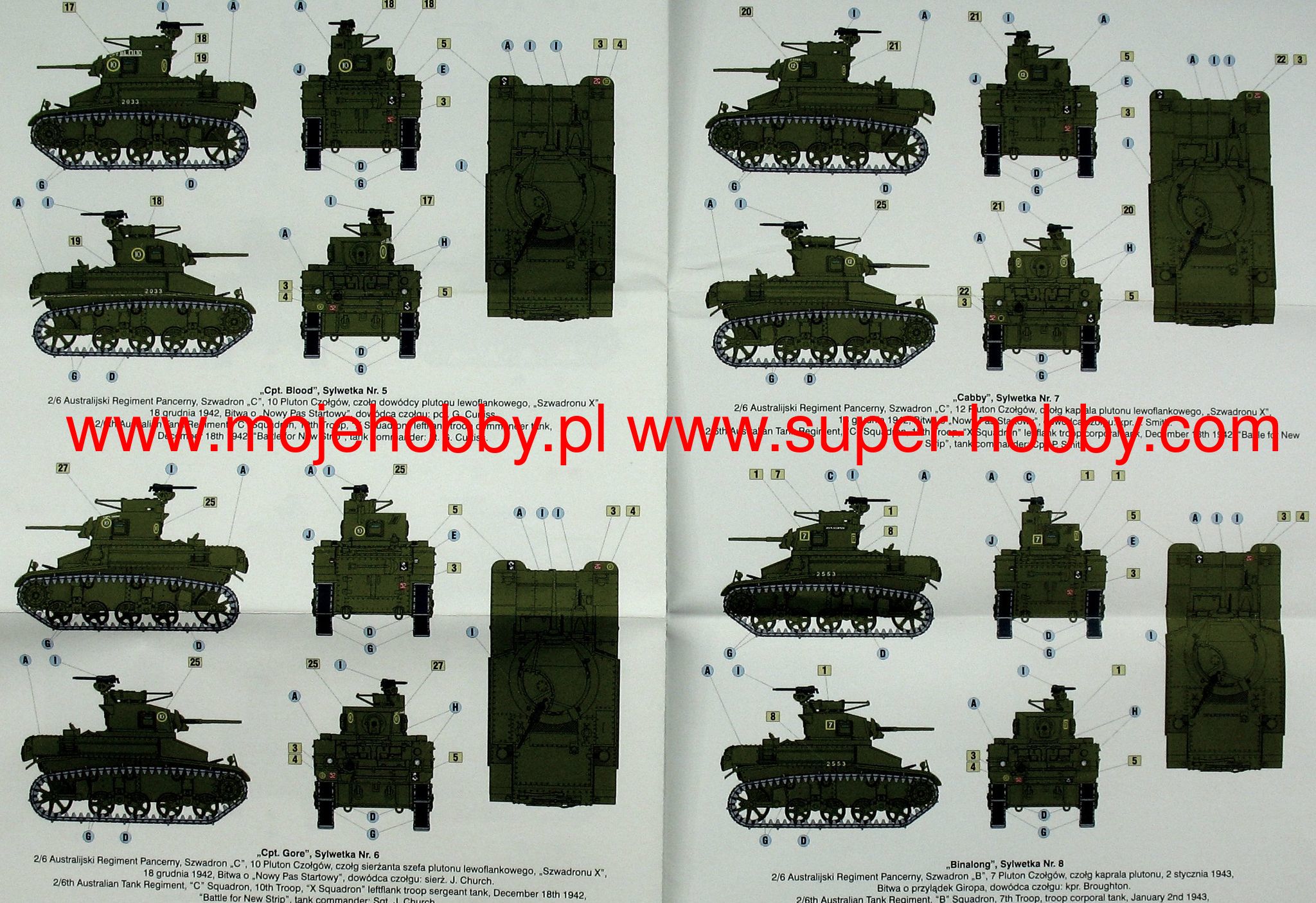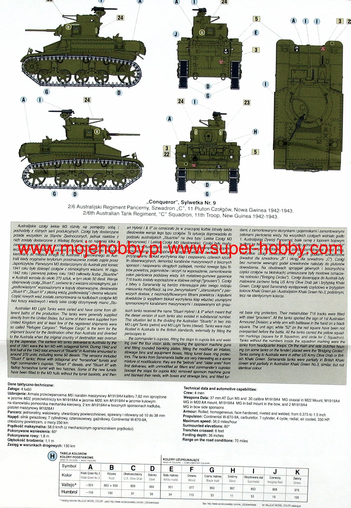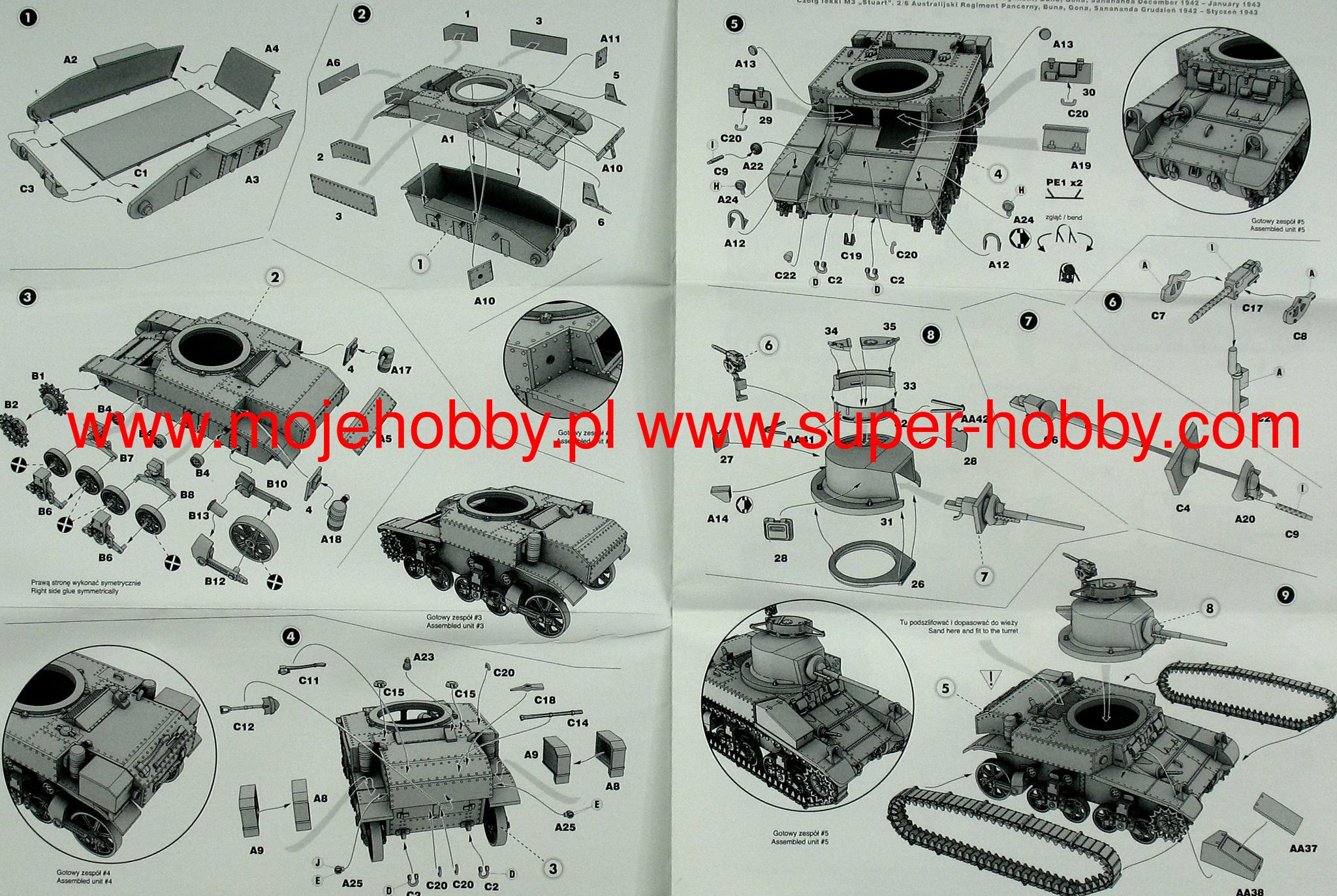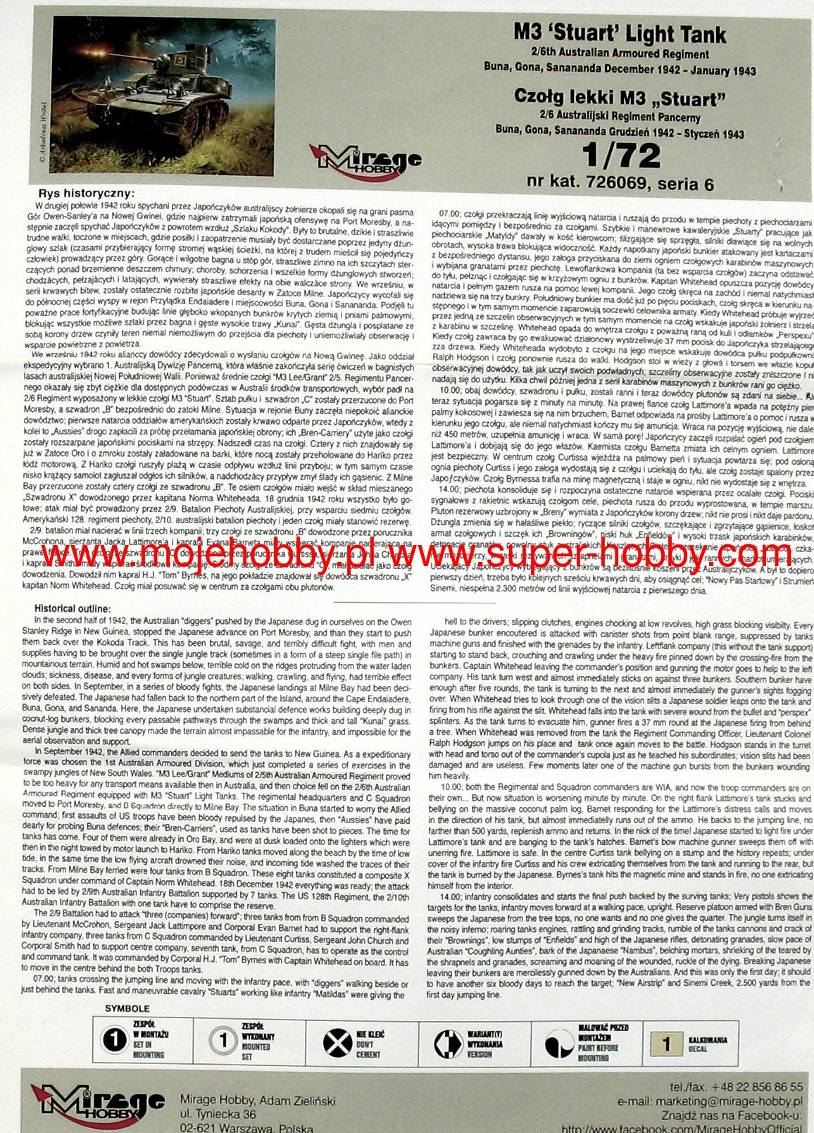 Download Mirage Hobby PDF catalogueThe M3 / M5 Stuart is an American light tank from the Second World War. The history of the M3 began in 1940, when the US Army saw the need to replace the old M2 with a more modern design. After several months of testing, the American Car and Foundry company released the first serial copy of the new tank, designated M3, in March 1941. The production of this successful tank lasted until 1945 and ended with the production of over 22,000 units! The M3 was powered by a Continental W-970-9A 7-cylinder engine with a capacity of 250 HP or a 9-cylinder Guilberson T-1020-4 diesel engine with a capacity of 210 HP. On the other hand, the M5 tank was powered by two coupled Cadillac V-8 engines with a capacity of 220 HP each. In total, several versions of the M3 tank were created. The first production series was marked M3, the next was M3A1, which min. was stripped of the watchtower and no longer had side machine guns. The M3A3 model entered production in 1943, with numerous improvements from the fighting in North Africa. Production of the M5 also began in March 1942, which was essentially a modification of the M3. The M5 tank was made in only two versions: M5 and M5A1. The latter had an elongated turret, an improved cannon mount and a new machine gun mount on the turret. The last modification was not used on all tanks of this version. The M8 self-propelled gun was also created on the basis of the M3 / M5 tank. The tanks were massively exported to Great Britain under the Lend and Lease Act program. In the American and British service, they served in North Africa, Italy, Normandy, and in the battles in France and Germany in 1944-1945. Tanks in the declining period of the war were replaced by the M24 Chaffe. The M3 / M5 Stuart is recognized as one of the best light tanks of World War II. Satisfactory range, speed and maneuverability all made him highly valued by his crews. Technical data (M3A3 version): length (with a barrel): 4.52m, width: 2.24m, height: 2.52m, engine power: 210-250KM, range: 217km, maximum speed (on the road): 58km / h, armament: 1 M6 37mm cannon, 2 7.62mm M1919 machine guns.