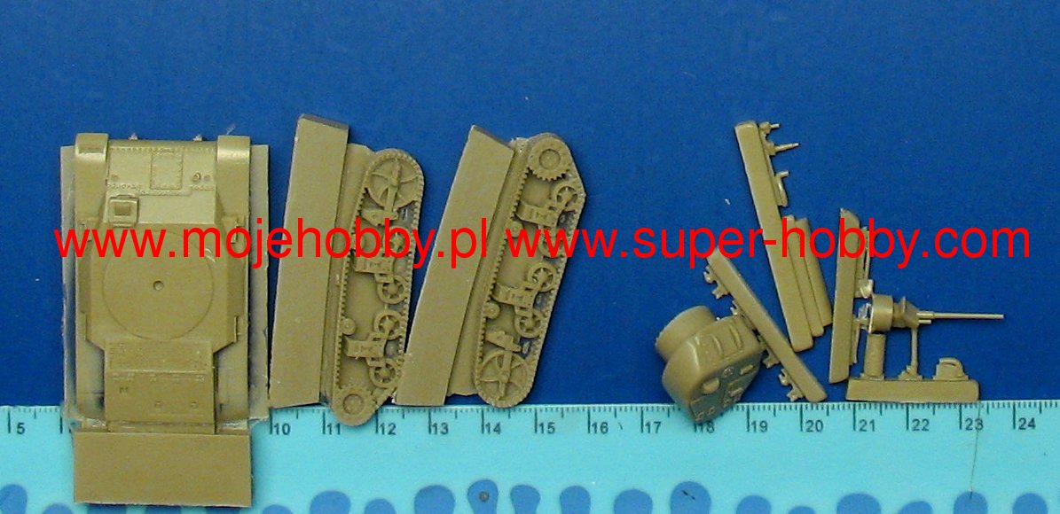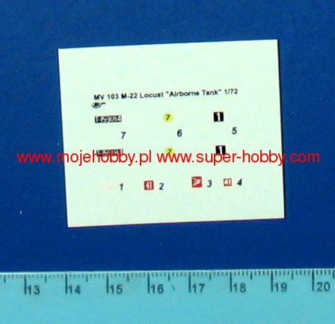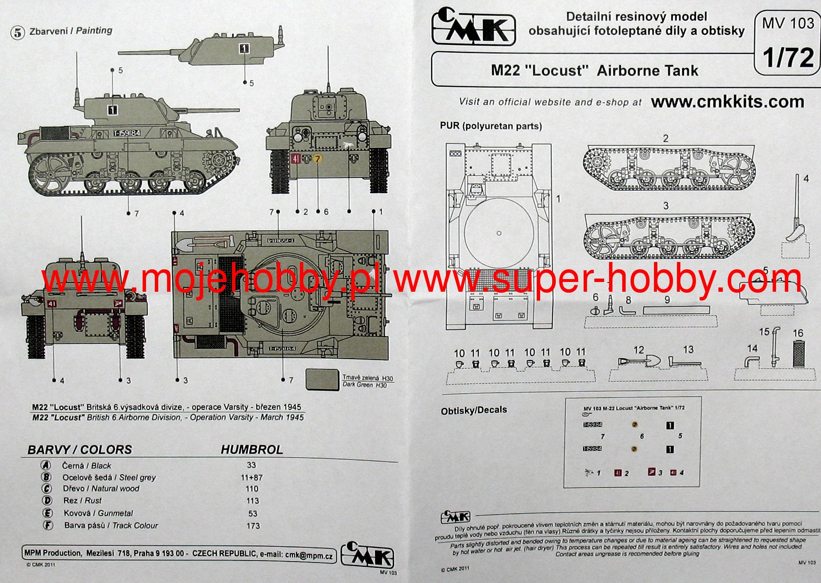 The M22 Locust was an American light tank from the Second World War. The first prototypes were built in 1941, and serial production continued in the period 1942-1944. In total, 830 examples of this vehicle were built. The M22 Locust was powered by a single carburetor engine Lycoming 0-435T with 162 HP . It was armed with a single 37mm M6 cannon in the turret and 1 Browning 1919 7.62mm machine gun. In May 1941 US airborne forces placed an order for a new tank for parachute troops. As a result of the work on this project, the M22 Locust tank was created. The new tank was to be light, of course, and therefore poorly armored, with a crew of three and armed only with a light 37mm gun. Despite many months of tests and implementation into serial production, the M22 Locust turned out to be completely incompatible with the requirements set for it. First of all, the American airborne forces did not have an aircraft or a glider capable of transporting the new tank, and its loading, unloading and preparation for combat after transport by a C47 aircraft took over three hours! As a result, the M22 was never used in combat by US troops. However, it came under the Lend-and-Lease program to Great Britain, which had more powerful gliders and used the M22 Locust for Operation Varsity in March 1945. After 1945, some of the tanks were handed over to Egypt, which in turn used them in the war with Israel in 1948-1949.The M22 Locust was an American light tank from the Second World War. The first prototypes were built in 1941, and serial production continued in the period 1942-1944. In total, 830 examples of this vehicle were built. The M22 Locust was powered by a single carburetor engine Lycoming 0-435T with 162 HP . It was armed with a single 37mm M6 cannon in the turret and 1 Browning 1919 7.62mm machine gun. In May 1941 US airborne forces placed an order for a new tank for parachute troops. As a result of the work on this project, the M22 Locust tank was created. The new tank was to be light, of course, and therefore poorly armored, with a crew of three and armed only with a light 37mm gun. Despite many months of tests and implementation into serial production, the M22 Locust turned out to be completely incompatible with the requirements set for it. First of all, the American airborne forces did not have an aircraft or a glider capable of transporting the new tank, and its loading, unloading and preparation for combat after transport by a C47 aircraft took over three hours! As a result, the M22 was never used in combat by US troops. However, it came under the Lend-and-Lease program to Great Britain, which had more powerful gliders and used the M22 Locust for Operation Varsity in March 1945. After 1945, some of the tanks were handed over to Egypt, which in turn used them in the war with Israel in 1948-1949.