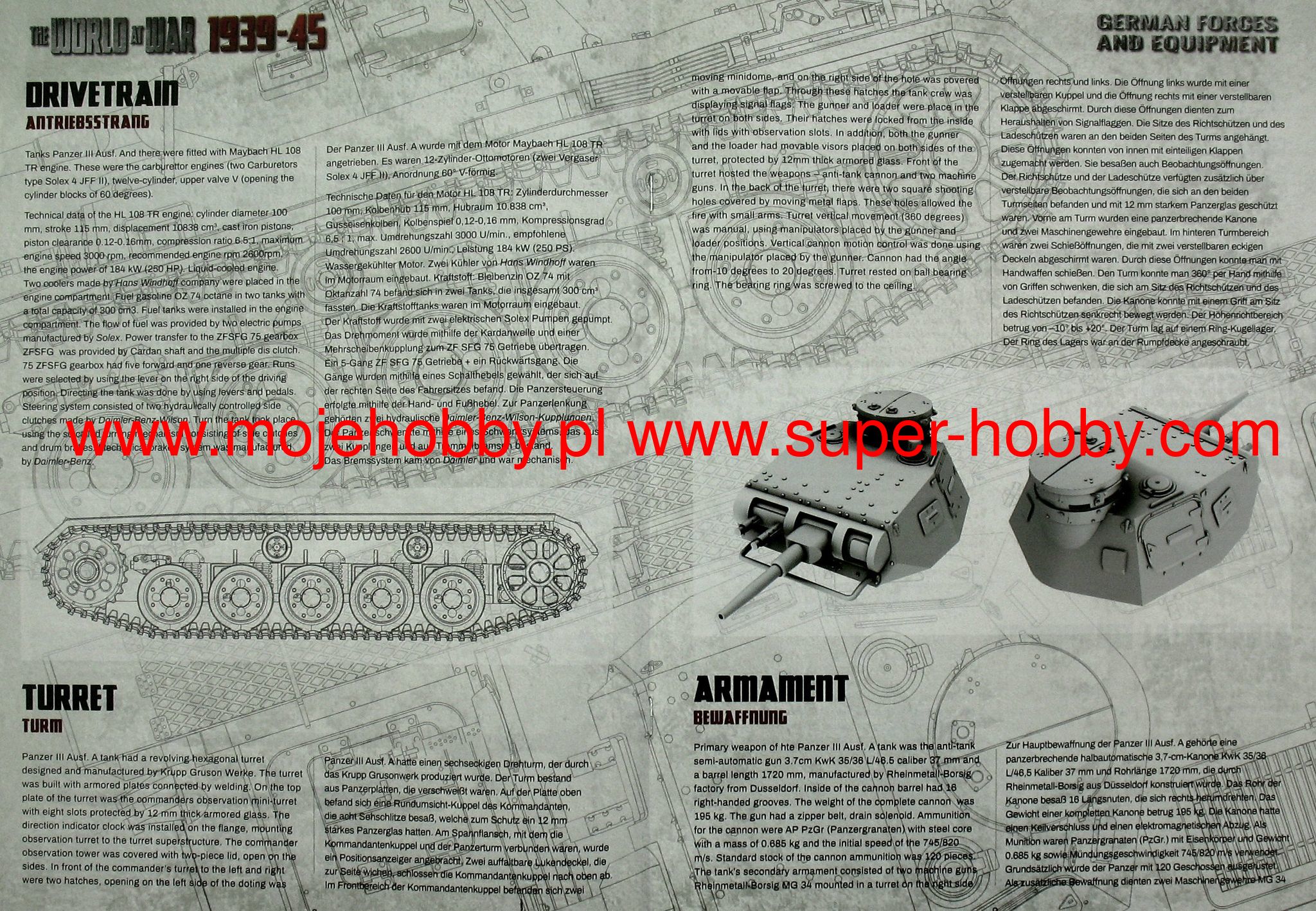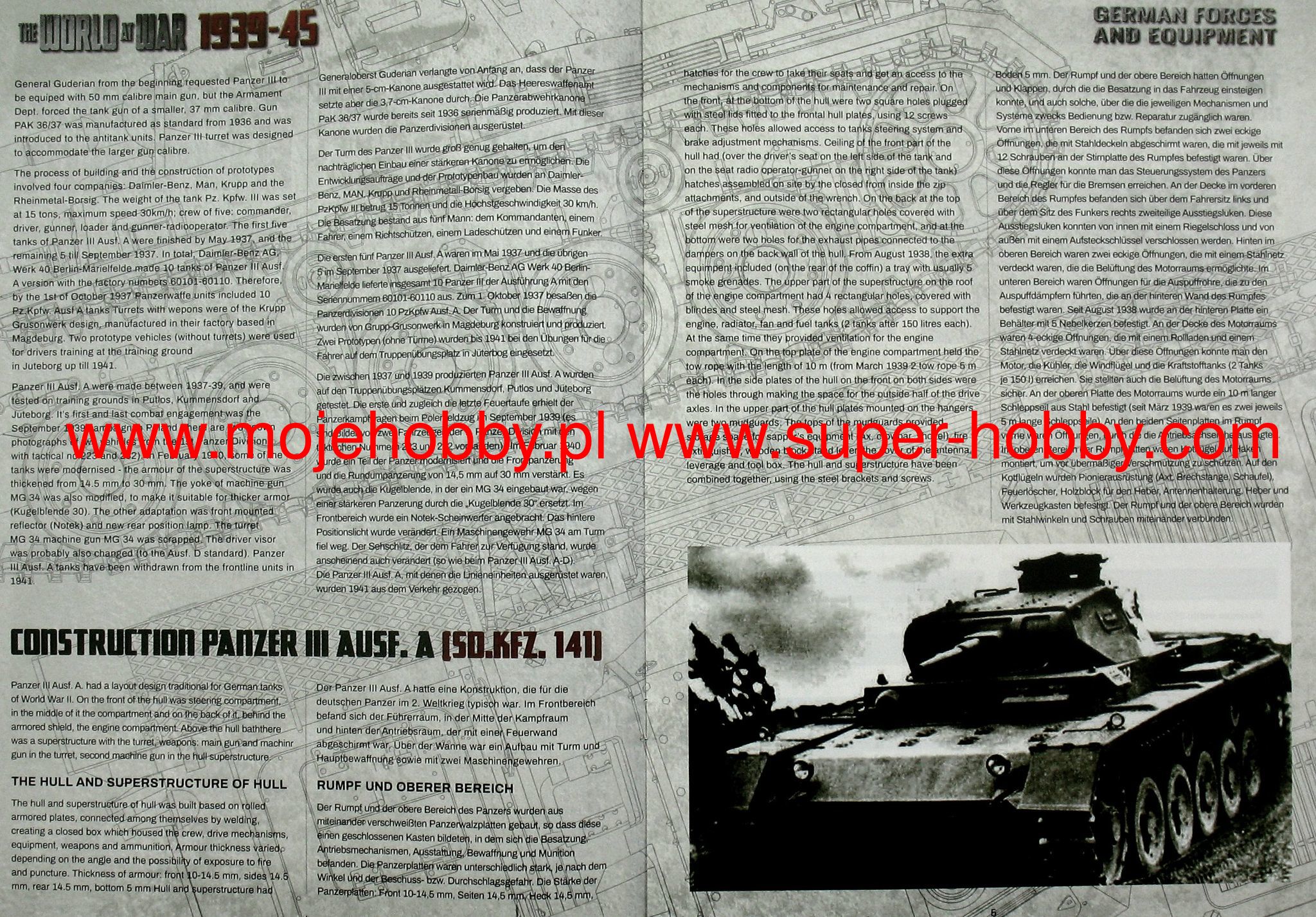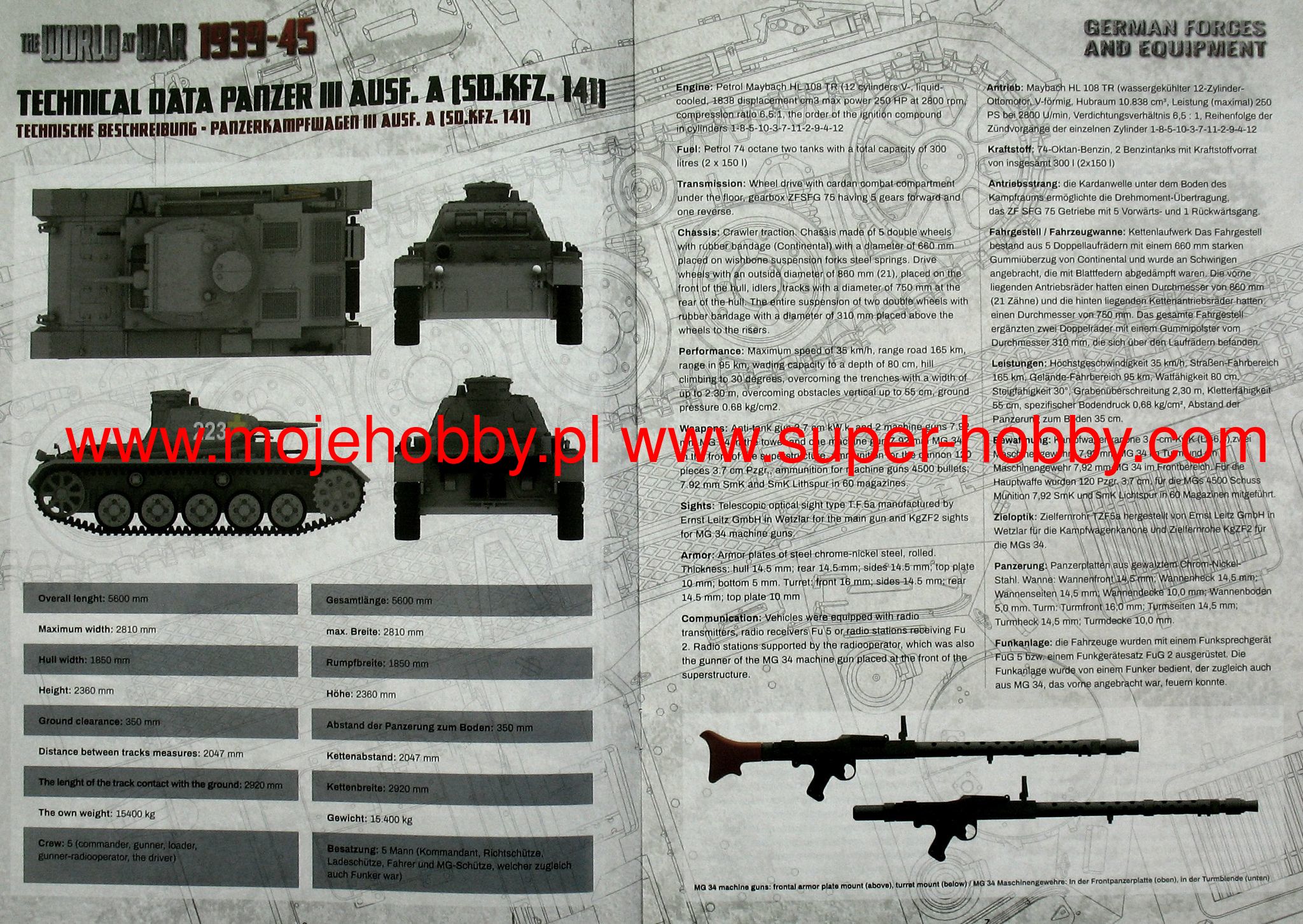 The PzKpfw III (Panzerkampfwagen III) was a German medium tank from the Second World War. The first prototypes of the vehicle were made in 1936, and serial production continued in the period 1937-1943, ending with the production of about 5,800 vehicles. The tank in the E version was powered by a single Maybach HL 120 TRM engine with a capacity of 300 HP. It was armed with one 37mm KwK 35/36 cannon and two 7.92mm MG 34 machine guns. placed in the tower. PzKpfw III was the "workhorse" of the German armored forces during World War II and one of the most intensively developed and modernized Wehrmacht tanks. Its serial production started in 1936, and many variants of this tank were created in its course. Chronologically, the first version was the A version, armed with a 37mm gun and a 230hp engine. However, already in December 1938, the E version was created, which was the first version produced in large series. It had a new, significantly more powerful engine, a completely new suspension and stronger armor in the front part of the turret and hull. Later (from December 1940) it was also armed with a more powerful 50mm cannon. In March 1940, the G version began to be produced, in which the rear hull and turret armor was reinforced. Soon after, in October 1940, the production of the H version started, which from the very beginning was armed with the 50mm KwK 38 L / 42 gun and had reinforced frontal armor. One of the most produced was the J version, which had armor up to 50 mm thick (later reinforced with aplique plates), and after the experience gained from the clashes with the T-34 and KW-1 vehicles - it was intensively rearmed for the KwK 39 L / 60 cannon. cal. 50 mm. The last development version was the N version, which was to be a support tank for armored grenadiers and was armed with a 75mm KwK 37 L / 24 short-barreled cannon. Numerous other vehicles were built on the chassis of the PzKpfw III, such as the StuG III assault gun. PzKpfw III tanks were used on almost all fronts of World War II - from the September campaign in 1939, through the campaign in France in 1940, operations Barbarossa and Typhoon in 1941, the Battle of Kursk in 1943, to the last operations of the German army against The USSR and the Western Allies in 1944-1945.
