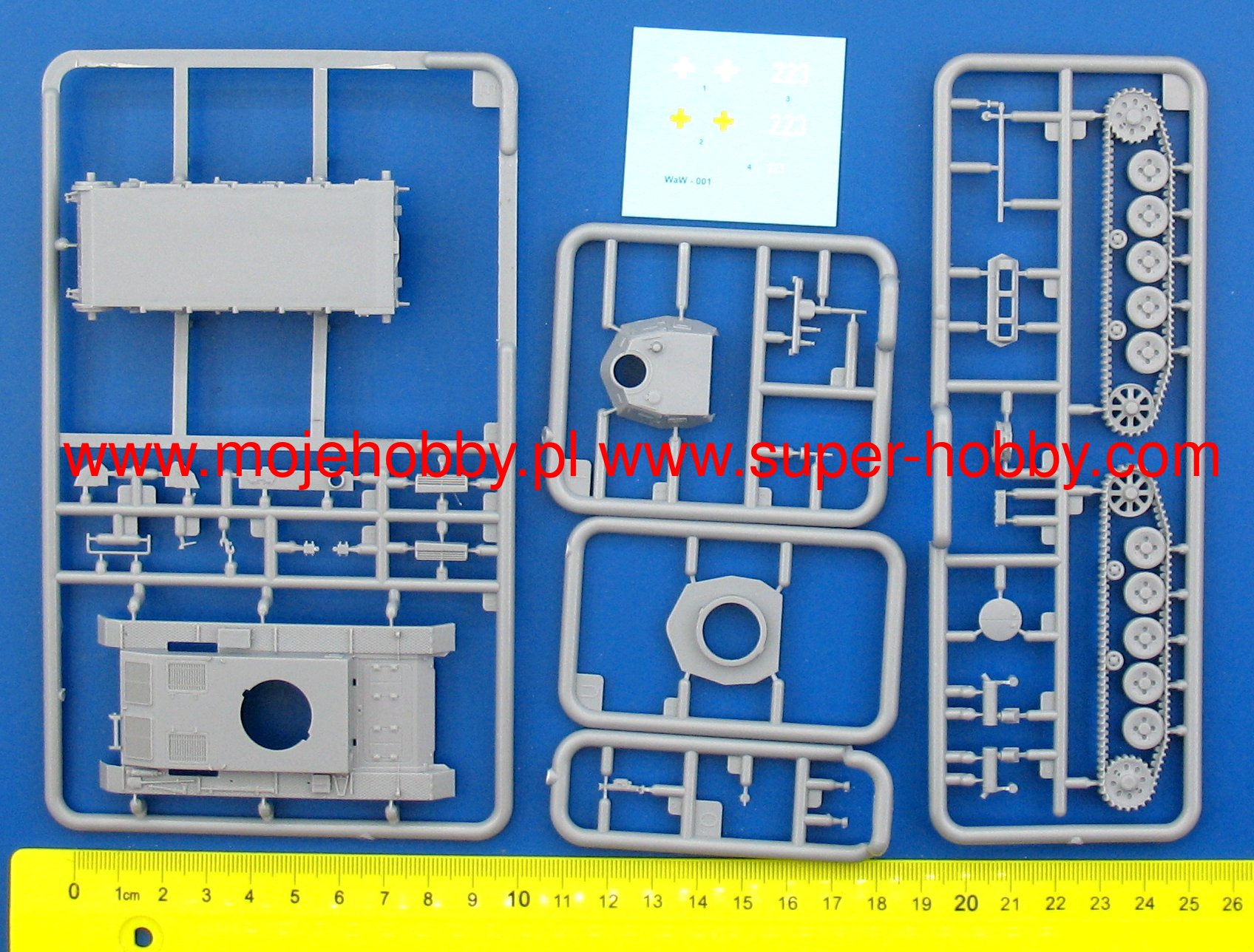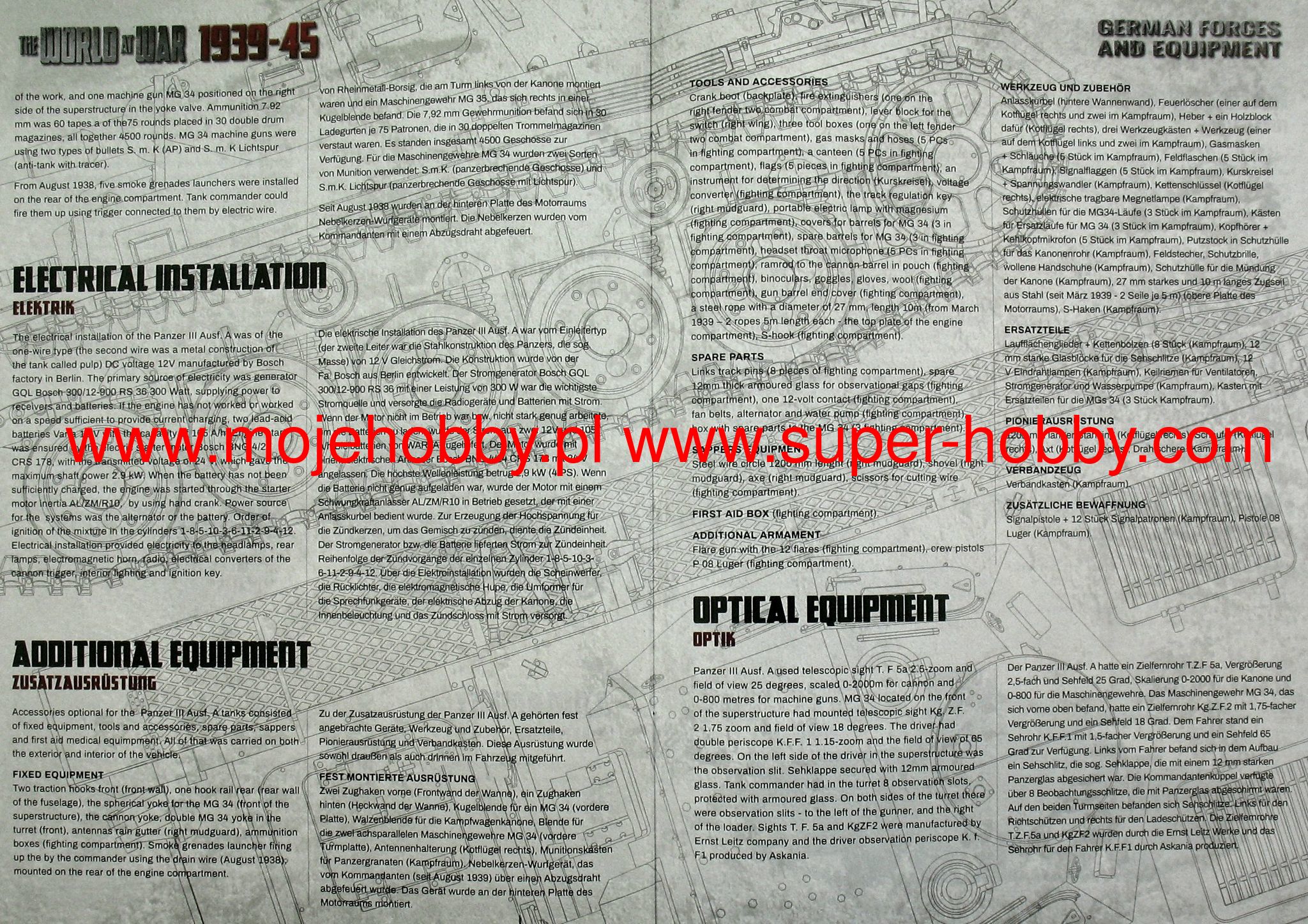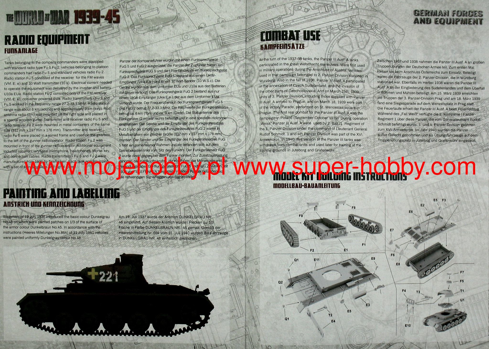 The PzKpfw III (Panzerkampfwagen III) was a German medium tank from the Second World War. The first prototypes of the vehicle were made in 1936, and serial production continued in the period 1937-1943, ending with the production of about 5,800 vehicles. The tank in the E version was powered by a single Maybach HL 120 TRM engine with a capacity of 300 HP. It was armed with one 37mm KwK 35/36 cannon and two 7.92mm MG 34 machine guns. placed in the tower. PzKpfw III was the "workhorse" of the German armored forces during World War II and one of the most intensively developed and modernized Wehrmacht tanks. Its serial production started in 1936, and many variants of this tank were created in its course. Chronologically, the first version was the A version, armed with a 37mm gun and a 230hp engine. However, already in December 1938, the E version was created, which was the first version produced in large series. It had a new, significantly more powerful engine, a completely new suspension and stronger armor in the front part of the turret and hull. Later (from December 1940) it was also armed with a more powerful 50mm cannon. In March 1940, the G version began to be produced, in which the rear hull and turret armor was reinforced. Soon after, in October 1940, the production of the H version started, which from the very beginning was armed with the 50mm KwK 38 L / 42 gun and had reinforced frontal armor. One of the most produced was the J version, which had armor up to 50 mm thick (later reinforced with aplique plates), and after the experience gained from the clashes with the T-34 and KW-1 vehicles - it was intensively rearmed for the KwK 39 L / 60 cannon. cal. 50 mm. The last development version was the N version, which was to be a support tank for armored grenadiers and was armed with a 75mm KwK 37 L / 24 short-barreled cannon. Numerous other vehicles were built on the chassis of the PzKpfw III, such as the StuG III assault gun. PzKpfw III tanks were used on almost all fronts of World War II - from the September campaign in 1939, through the campaign in France in 1940, operations Barbarossa and Typhoon in 1941, the Battle of Kursk in 1943, to the last operations of the German army against The USSR and the Western Allies in 1944-1945.