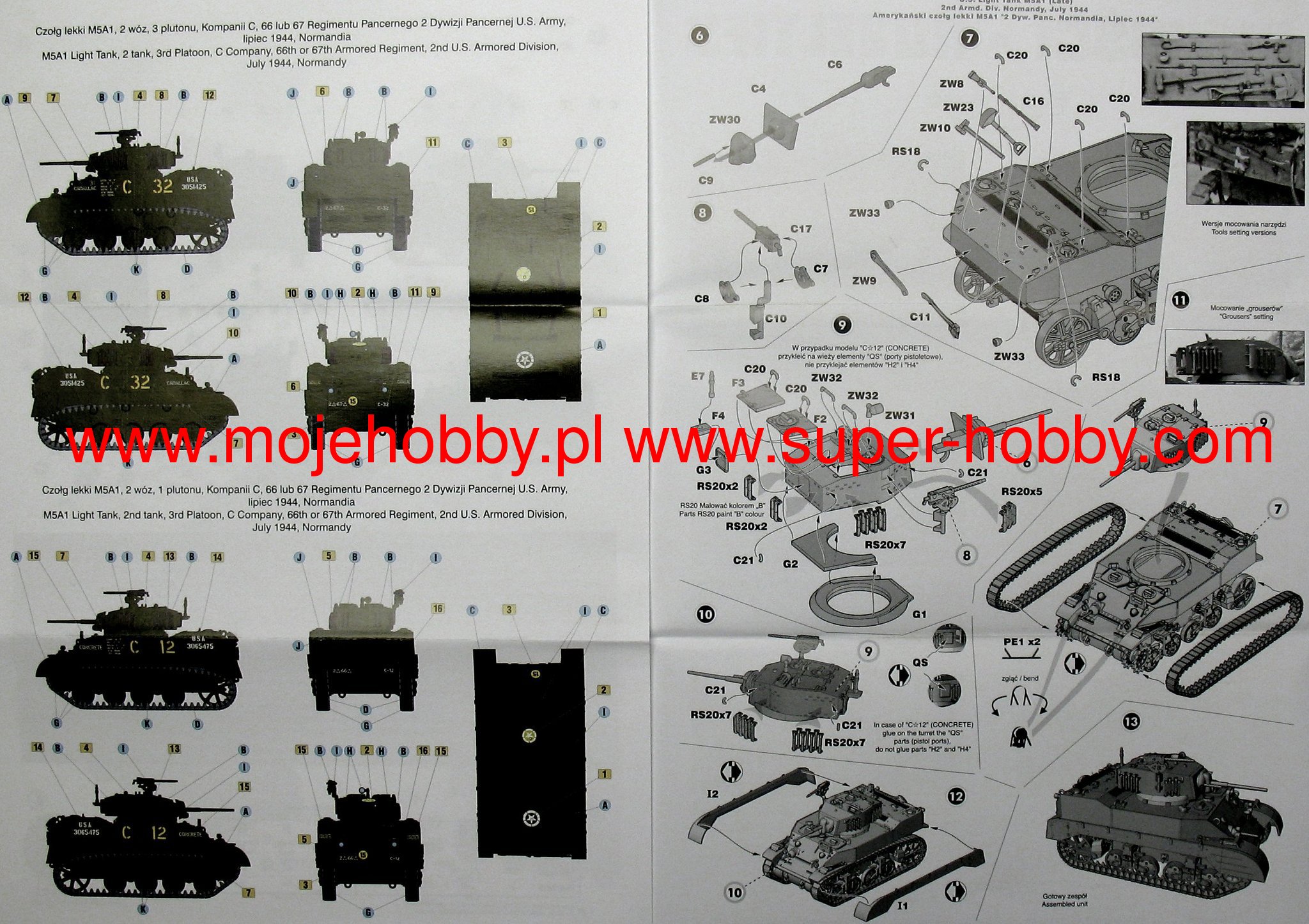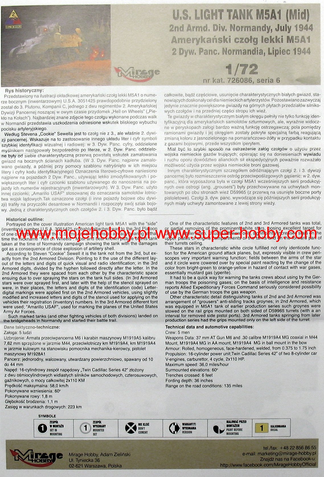 Download Mirage Hobby PDF catalogueThe M3 / M5 Stuart is an American light tank from the Second World War. The history of the M3 began in 1940, when the US Army saw the need to replace the old M2 with a more modern design. After several months of testing, the American Car and Foundry company released the first serial copy of the new tank, designated M3, in March 1941. The production of this successful tank lasted until 1945 and ended with the production of over 22,000 units! The M3 was powered by a Continental W-970-9A 7-cylinder engine with a capacity of 250 HP or a 9-cylinder Guilberson T-1020-4 diesel engine with a capacity of 210 HP. On the other hand, the M5 tank was powered by two coupled Cadillac V-8 engines with a capacity of 220 HP each. In total, several versions of the M3 tank were created. The first production series was marked M3, the next was M3A1, which min. was stripped of the watchtower and no longer had side machine guns. The M3A3 model entered production in 1943, with numerous improvements from the fighting in North Africa. Production of the M5 also began in March 1942, which was essentially a modification of the M3. The M5 tank was made in only two versions: M5 and M5A1. The latter had an elongated turret, an improved cannon mount and a new machine gun mount on the turret. The last modification was not used on all tanks of this version. The M8 self-propelled gun was also created on the basis of the M3 / M5 tank. The tanks were massively exported to Great Britain under the Lend and Lease Act program. In the American and British service, they served in North Africa, Italy, Normandy, and in the battles in France and Germany in 1944-1945. Tanks in the declining period of the war were replaced by the M24 Chaffe. The M3 / M5 Stuart is recognized as one of the best light tanks of World War II. Satisfactory range, speed and maneuverability all made him highly valued by his crews. Technical data (M3A3 version): length (with a barrel): 4.52m, width: 2.24m, height: 2.52m, engine power: 210-250KM, range: 217km, maximum speed (on the road): 58km / h, armament: 1 M6 37mm cannon, 2 7.62mm M1919 machine guns.