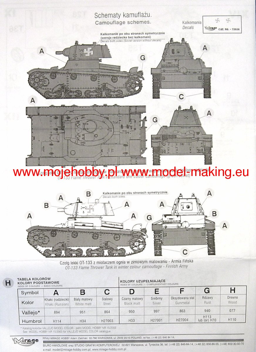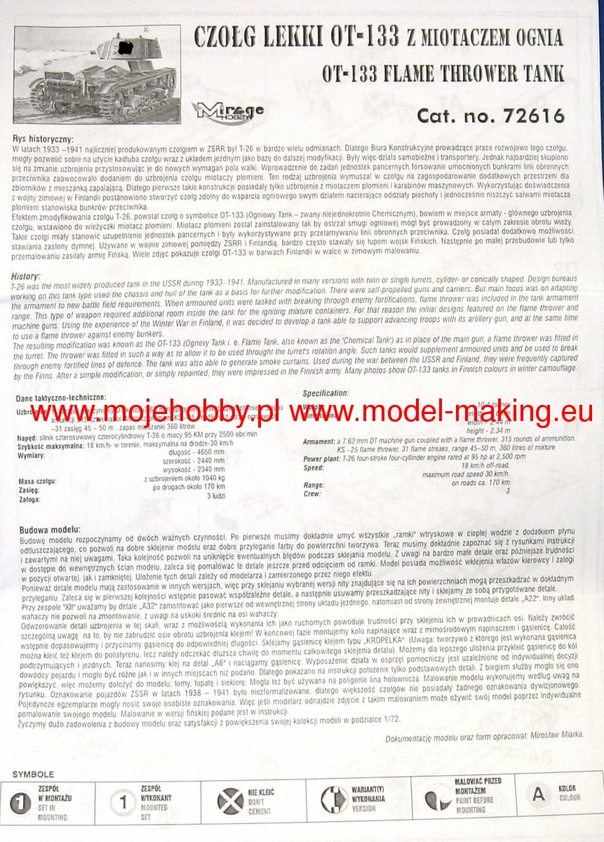 Download Mirage Hobby PDF catalogueOT-133 was a Soviet tank - a mobile flamethrower from the interwar period and the beginning of World War II. The length of the wagon was 4.62 meters, with a hull width of 2.44 meters. The tank was powered by a single GAZ T-26 engine with a maximum power of 91 HP. The maximum speed on the road was up to 30 km / h. The OT-133 was the penultimate, and the third in turn, variant of the flamethrower tank based on the T-26 vehicle. In the case of the OT-133, the T-26 mod.1939 single-turret tank was used as the basis for its construction, and the Fabryka im. Voroshilov in what was then Leningrad (now Saint Petersburg). Compared to the mass-produced T-26 mod. In 1939, the OT-133 vehicle had several significant design changes. First of all, the vehicle turret has been moved more to the right, and the turret itself has also been modified. Inside, instead of a 45mm cannon, it housed the KS-25 flamethrower. Inside the car there were also two tanks with a capacity of 200 liters for the incendiary mixture. It is estimated that around 290 OT-133 vehicles were built in 1939-1940.