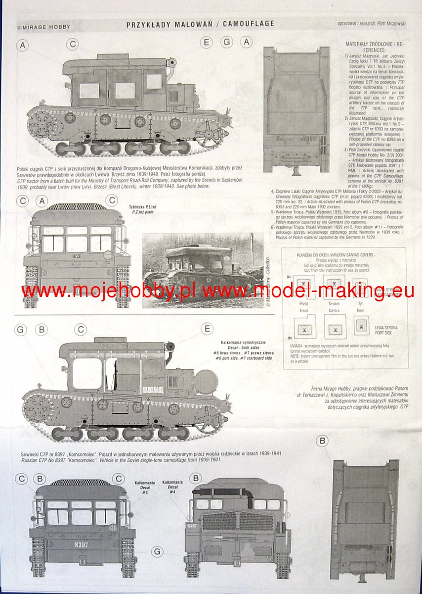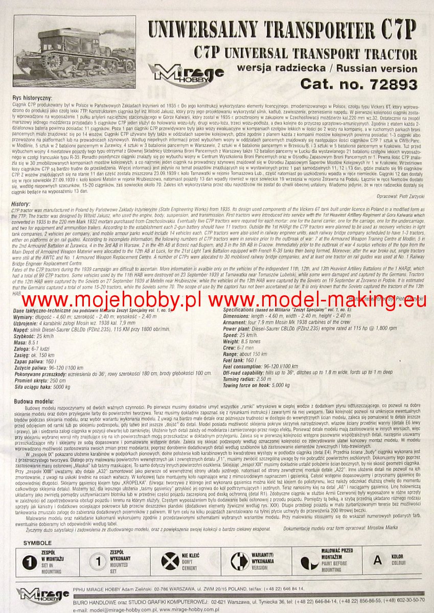 The C7P was a Polish tracked artillery tractor from the interwar period and World War II. The first prototypes of the vehicle were built in 1933, and serial production continued in the period 1934-1939, ending with the production of about 150 examples. The C7P was powered by an engine PZInż. 235 with 115 hp. The vehicle did not have any permanent weapons. Along with the slow motorization and mechanization of the Polish Army at the turn of the 1920s and 1930s, it was decided to increase the mobility of Polish artillery and use in some of its units new tracked tractors that would replace the vehicles used so far - such as the Holt tractor 75. In order to shorten the time needed for analytical and implementation works, it was decided to use the chassis and many components were developed at the same time for the 7TP tank. As a result, a vehicle with good off-road characteristics, low failure rate and relatively easy operation was created. C7P tractors were used primarily for towing heavy cannons, howitzers and mortars. The main target unit turned out to be the 1st Heaviest Artillery Regiment, which received a large part of the C7Ps produced. These vehicles also found their way to the armored forces, where they were used to tow and retrieve damaged tanks from the field. C7P tractors took part in the September campaign in 1939, and small numbers of them fell into the hands of the Wehrmacht and the Red Army.Download Mirage Hobby PDF catalogue