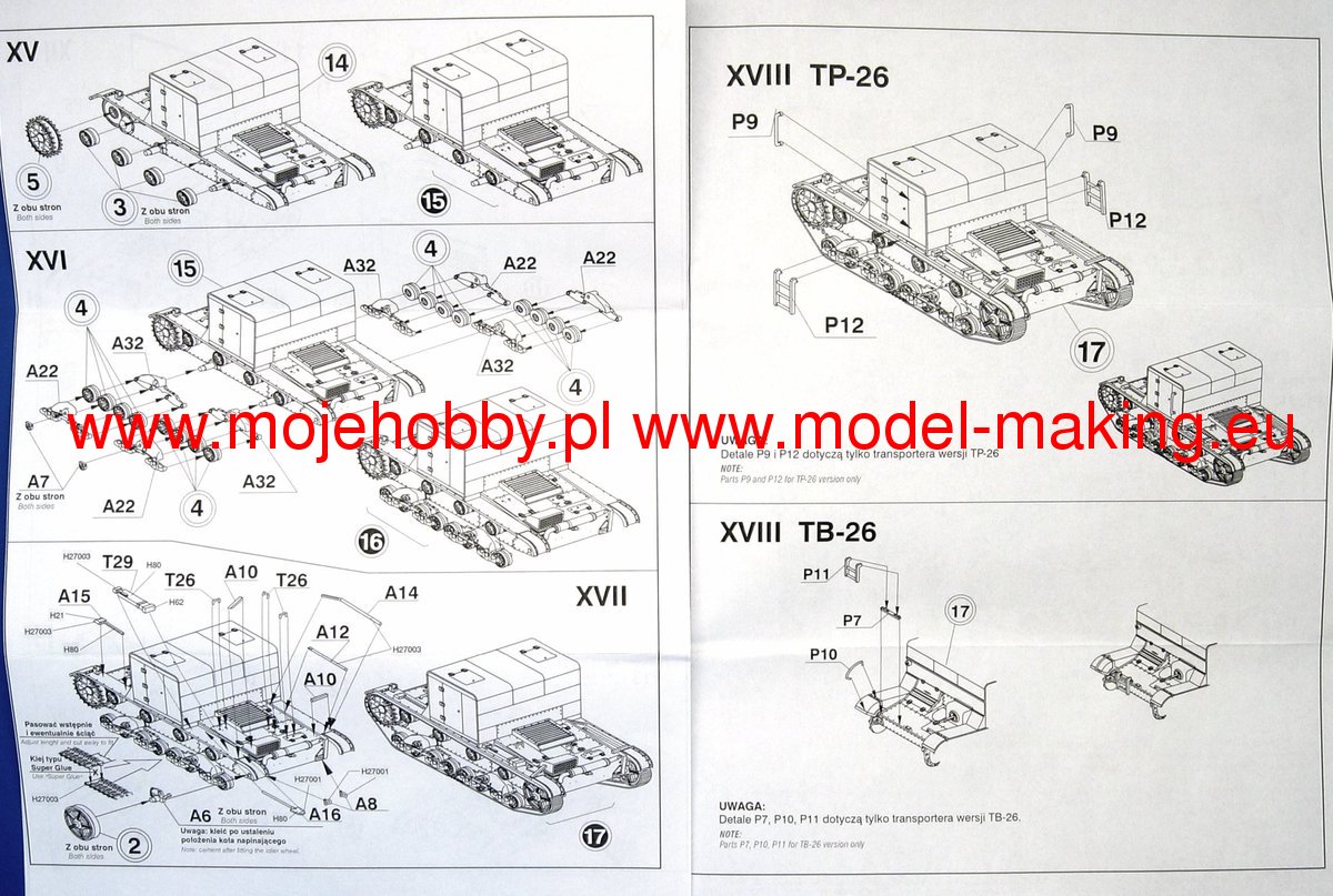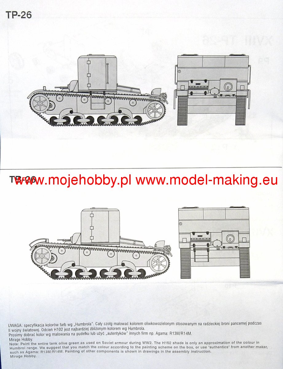 The T-26 is a Soviet light tank from the interwar period and World War II. The first prototypes of this vehicle were made in 1931, and the car entered service in 1931-1932. Approximately 12,000 vehicles of this type were produced in the course of production, along with derivative versions and specialized vehicles! The combat weight of the T-26 tank in the basic version was up to 8.2 tons. The drive was provided by a single, 12-cylinder GAZ carburetor engine with a power of 90-91 HP. The basic armament consisted of a single 45 mm wz.1932 or wz.1934 gun and 1 to 3 DT 7.62 mm machine guns. In fact, the T-26 was a far-reaching development of the British Vickers 6-Ton. The vehicle was also the basic Soviet infantry support vehicle in the 1930s and at the beginning of World War II. It is also worth remembering that the first prototypes of the car and the first production batches had two turrets (T-26 models 1931 and 1932), only from 1933 the tank was manufactured in a single turret variant with a 45 mm gun as the main armament. In the course of production, several variants of the T-26 and specialized versions were created, including: the T-26 model 1938 (version with a new turret, with sloped walls), ChT-130 and ChT-133 (specialized vehicles with flamethrowers) and a wagon ST-26 (bridge tank). The T-26 vehicles took part in numerous conflicts in the 1930s, including the border incidents in Manchuria in 1934-1945 and the civil war in Spain (1936-1939). Tanks of this type were also used on a considerable scale during the aggression against Poland in September 1939, during the Winter War (1939-1940), as well as during the war with Japan in 1939-1940. They were also used on a large scale in the initial phase of the German-Soviet war in 1941. It is worth noting that there are opinions that the latest versions of the T-26 (for example, the 1938 or 1939 model) were not significantly inferior to the German tanks during the Barbarossa or Typhoon operations.Download Mirage Hobby PDF catalogue