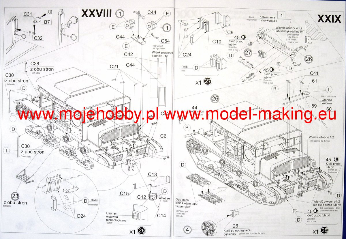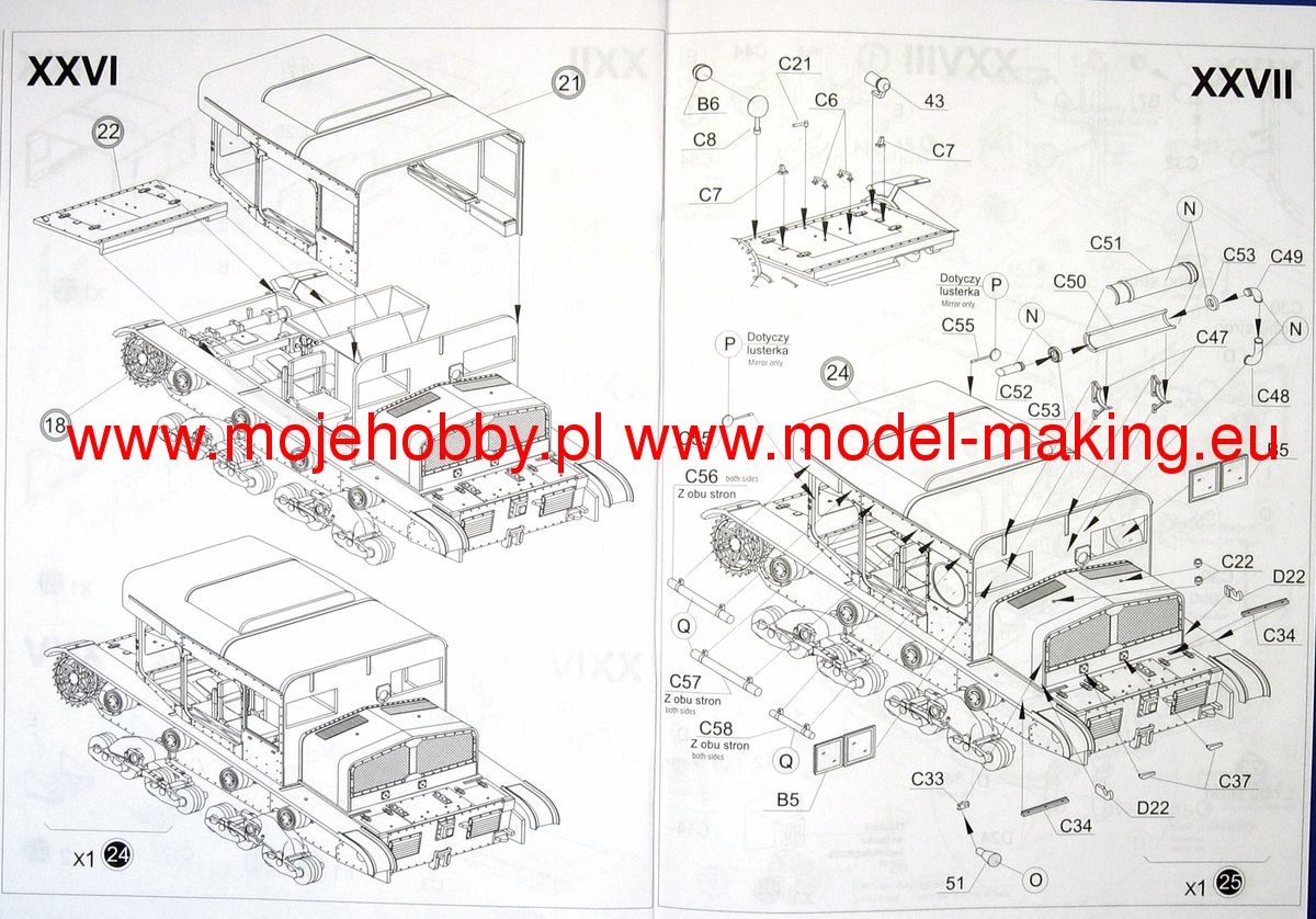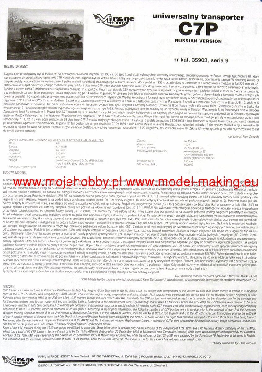 The C7P was a Polish tracked artillery tractor from the interwar period and World War II. The first prototypes of the vehicle were built in 1933, and serial production continued in the period 1934-1939, ending with the production of about 150 examples. The C7P was powered by an engine PZInż. 235 with 115 hp. The vehicle did not have any permanent weapons. Along with the slow motorization and mechanization of the Polish Army at the turn of the 1920s and 1930s, it was decided to increase the mobility of Polish artillery and use in some of its units new tracked tractors that would replace the vehicles used so far - such as the Holt tractor 75. In order to shorten the time needed for analytical and implementation works, it was decided to use the chassis and many components were developed at the same time for the 7TP tank. As a result, a vehicle with good off-road characteristics, low failure rate and relatively easy operation was created. C7P tractors were used primarily for towing heavy cannons, howitzers and mortars. The main target unit turned out to be the 1st Heaviest Artillery Regiment, which received a large part of the C7Ps produced. These vehicles also found their way to the armored forces, where they were used to tow and retrieve damaged tanks from the field. C7P tractors took part in the September campaign in 1939, and small numbers of them fell into the hands of the Wehrmacht and the Red Army.Download Mirage Hobby PDF catalogue