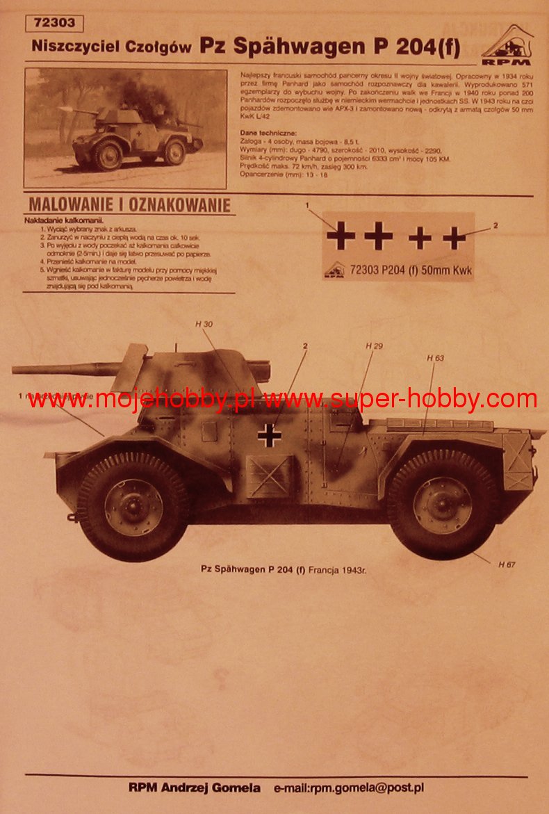 Pz.204 (f)[pełna nazwa: Panzerspähwagen P.204 (f)] is a German armored car, French production from the Second World War. The cart was 4.79 meters long and 2.01 meters wide. The drive was provided by a single engine Panhard I SK with a power of 105 HP, allowing to reach a top speed on the road of 72 km / h. Standard main armament consisted of a 25mm cannon and a single machine gun. Pz.204 (f) is, in fact, another name for the very successful French Panhard 178 armored car, which began to be used by the French armed forces in 1934. Vehicles of this type were used during the campaign in Western Europe in 1940, and their quality was very quickly appreciated by the German army, which quickly introduced the captured items into service in their own line. After the surrender of France in June 1940, the production of these cars[już pod oznaczeniem Pz.204 (f)] was continued for the needs of the German army and lasted until 1944! It is worth adding that the Germans created two interesting modifications of this car. The first is a rail reconnaissance vehicle (Ger. Schienenpanzer ), thus modifying 43 vehicles after 1941. On the other hand, in 1944, the Germans rebuilt about 30 cars of this type by placing a 50 mm cannon (in a stationary casemate) in them.