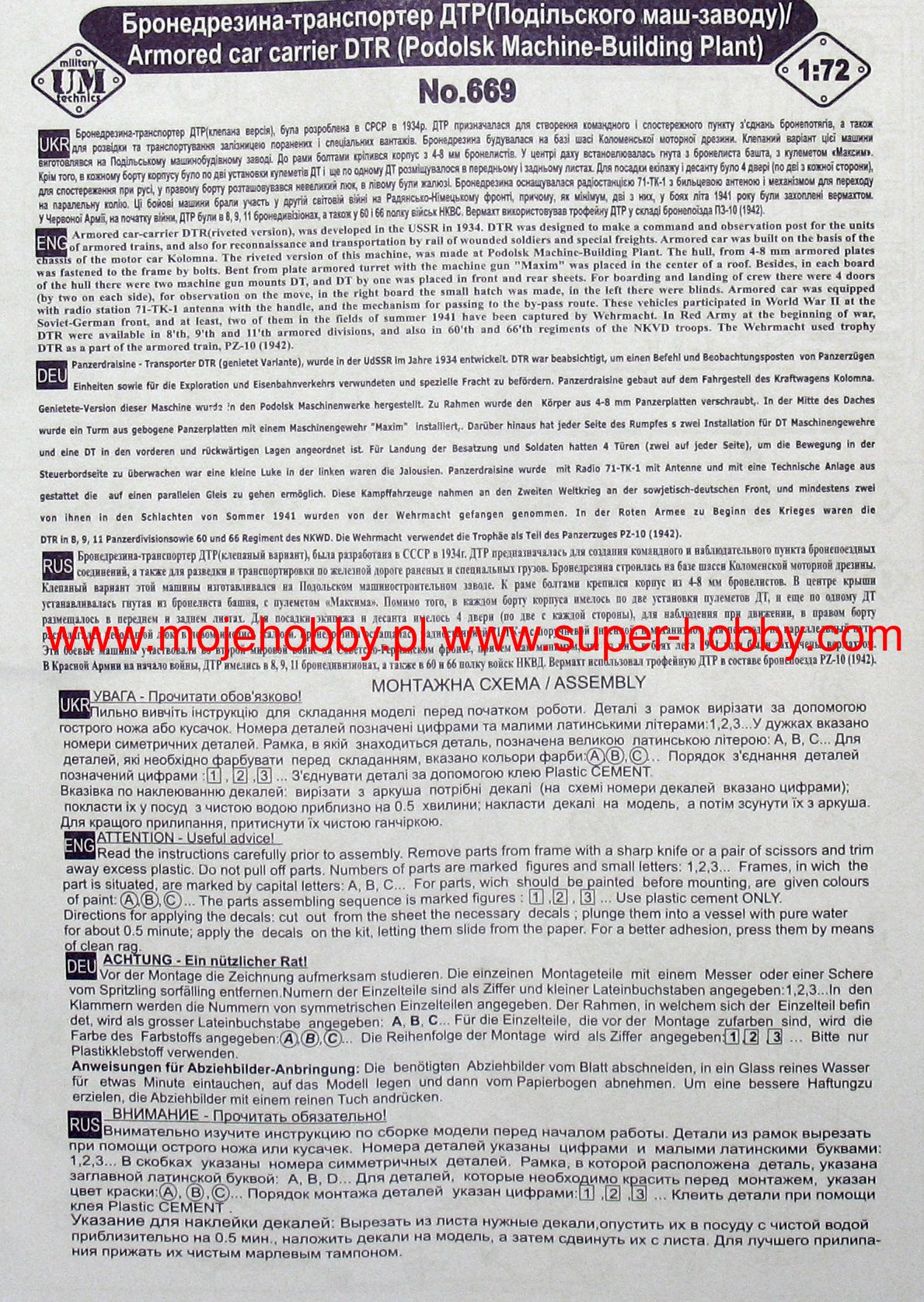 ДТР по сути советский, самоходный бронетранспортер межвоенного периода и Великой Отечественной войны. Он служил в качестве железнодорожной бронированной разведывательной машины и легкой транспортной машины. Он также использовался для эвакуации раненых с поля боя. Он использовался в советских железнодорожных войсках Красной Армии. Представленный рельсовый вагон был разработан в 1934 году и вскоре поступил на конвейер. У него была относительно тонкая броня толщиной от 4 до 8 миллиметров, а вооружение состояло всего из четырех пулеметов. Одна винтовка Максим размещалась во вращающейся башне в верхней части машины, а по одной 7,62-мм винтовке ДТ по бокам машины и в передней части машины. На ДТР также была установлена радиостанция 71-ТК-1 со штыревой антенной. Хотя производство этой машины продолжалось с 1935 по 1941 год, предполагается, что было выпущено не более 10-12 ДТР. Принимали участие в основном в начальной фазе войны с Третьим рейхом в 1941-1945 гг.