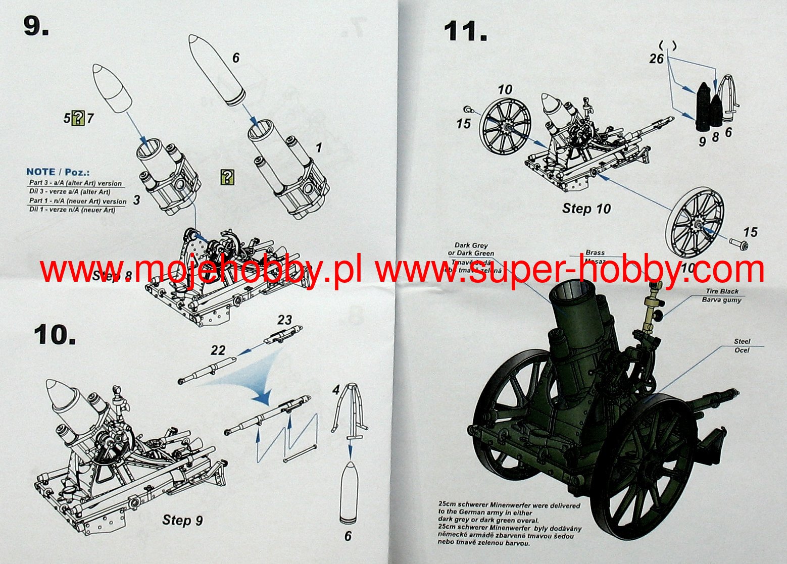 Schwerer Minenwerfer 25 cm (skrót: 25 cm sMW) to niemiecki, ciężki moździerz okopowy (tzw. miotacz min) kal. 250 mm z okresu I wojny światowej. Prędkość początkowa pocisku burzącego z tego moździerza dochodziła do 200 m/s, przy donośności maksymalnej ok. 970 metrów. Produkcja seryjna trwała w latach 1910-1918 i doprowadziła do powstania ok. 1230 sztuk tej broni. Prace projektowe nad Schwerer Minenwerfer 25 cm rozpoczęły się już w 1907 roku, a dwa lata później gotowe były pierwsze prototypy. Broń powstała pod wpływem doświadczeń wypływających z wojny japońsko-rosyjskiej lat 1904-1905, które wskazywały na konieczność opracowania specjalistycznej broni stromotorowej dedykowanej do niszczenia umocnionych punktów oporu przeciwnika. W toku służby w I wojnie światowej 25 cm sMW służył przede wszystkim jako broń wsparcia niemieckiej piechoty. Pomimo swej stosunkowo spory masy (ponad 750 kilogramów!) oraz niezbyt dużych zdolności manewrowych okazał się bronią efektywną, o sporej sile rażenia, mogącej strzelać pociskami o masie do 97 kilogramów o bardzo wysokich właściwościach burzących. W 1916 r. powstała wersja z wydłużoną lufą oznaczona jako 25 cm sMW n/A. Co oprócz modelu będę potrzebować do jego sklejenia?
