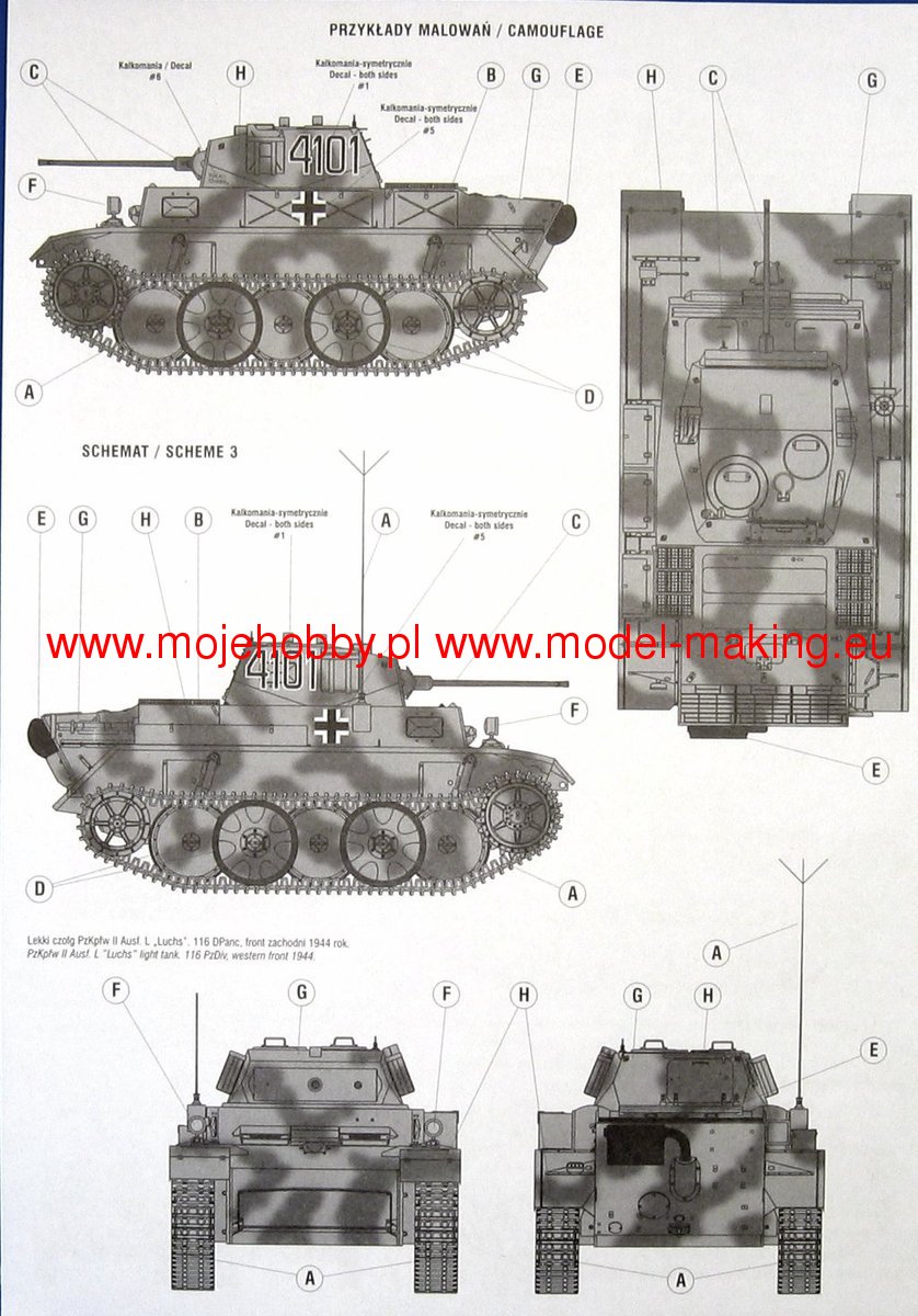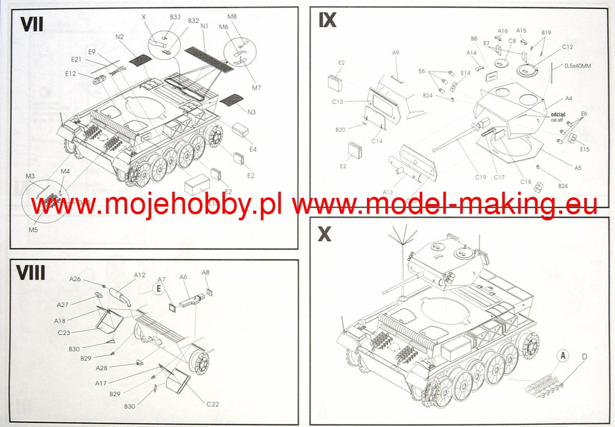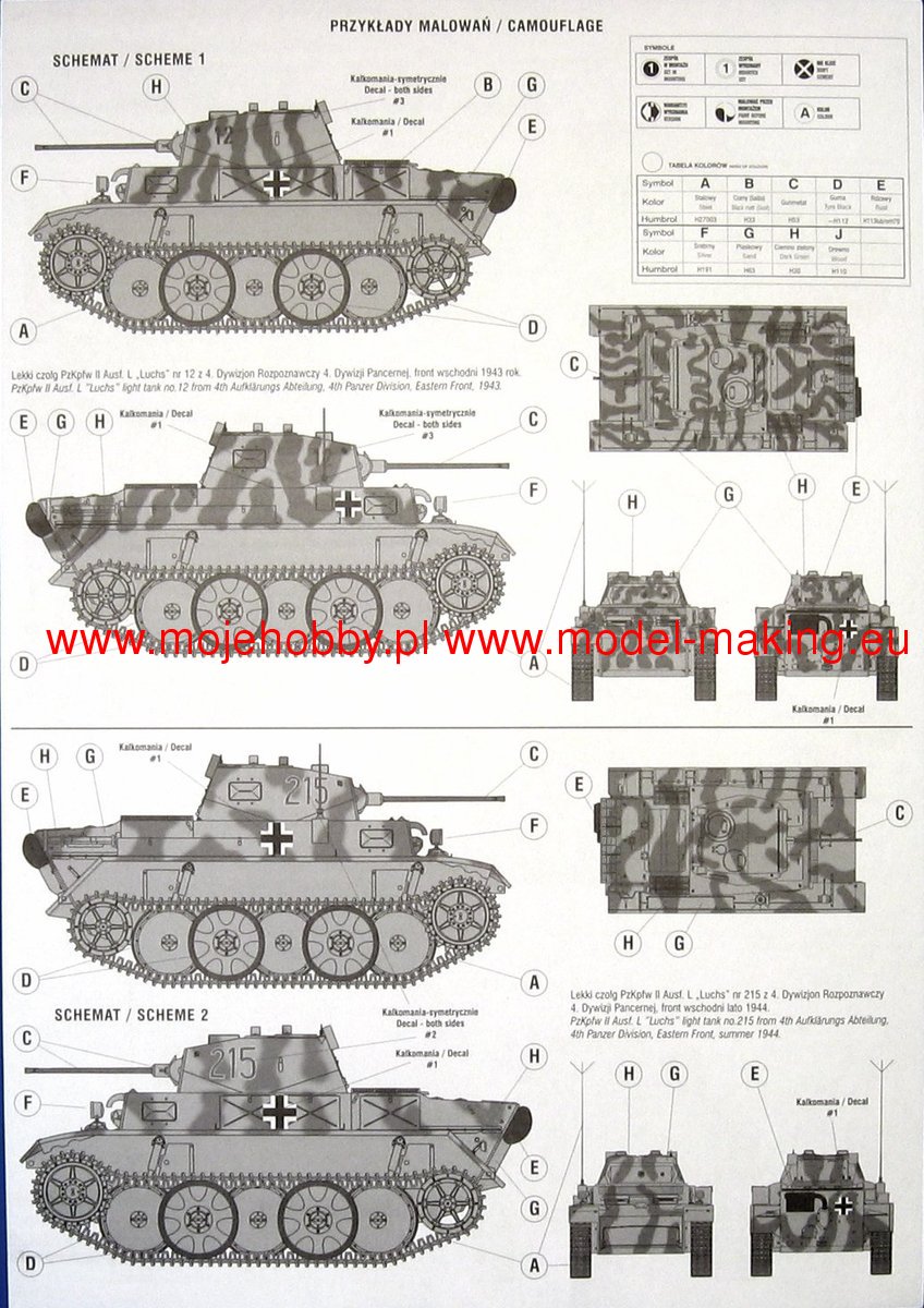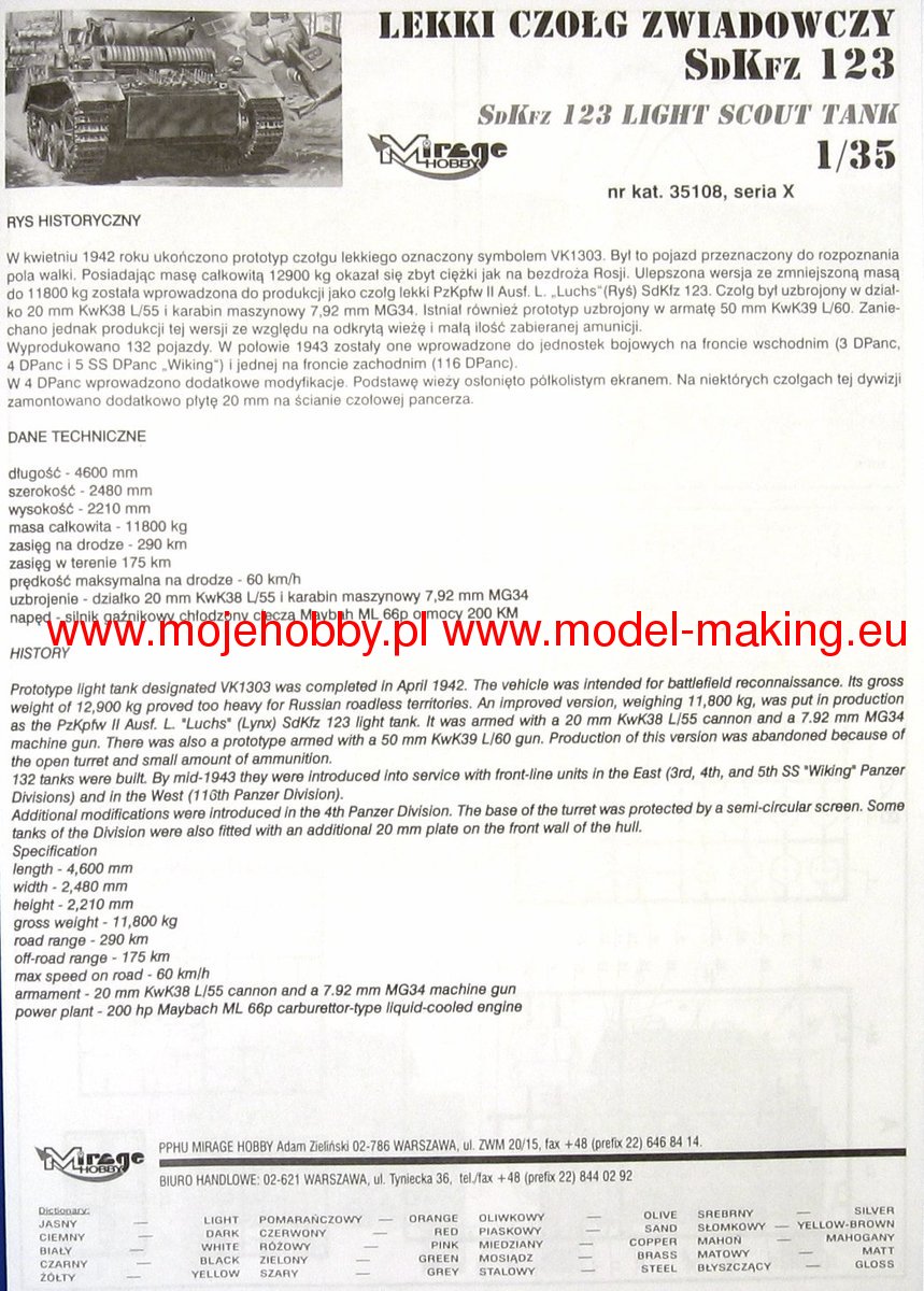 The PzKpfw II (Panzerkampfwagen II) was a German light tank from the Second World War. The first prototypes of the vehicle were created in 1934, and serial production continued in the period 1935-1944, ending with the production of about 1,850 cars. The A version of the tank was powered by a single Maybach HL 57 TR engine with a capacity of 130 HP. It was armed with 1 20mm KwK 30 gun and 1 7.92mm MG 34 machine gun. placed in the tower. PzKpfw II was created as a result of a competition announced by the German Armaments Bureau for a light tank weighing up to 10 tons, armed with a 20 mm gun. The competition was won by MAN in cooperation with Daimler-Benz. Serial production started in 1935, and many variants of the PzKpfw II tank were created during it. Chronologically, the first was version A, but it was produced in relatively small quantities. Soon after, version B was created, which already had a new, more powerful engine and a changed chassis. Already in 1937, the C version was created, with a substantially changed chassis and reinforced frontal hull armor. At the end of 1940, the F version was created, which had stronger armor and a better gearbox than the C version. In 1942, the production of the L ("Luchs") version began, which had a completely new chassis, a new 180 HP engine and significantly increased speed maximum - from 40 km / h to 60 km / h. Numerous other vehicles were also built on the chassis of the PzKpfw II, such as the Wespe self-propelled howitzer or the Marder II tank destroyer. PzKpfw II tanks were used on almost all fronts of World War II, and from 1942 they were assigned to secondary tasks.Download Mirage Hobby PDF catalogue