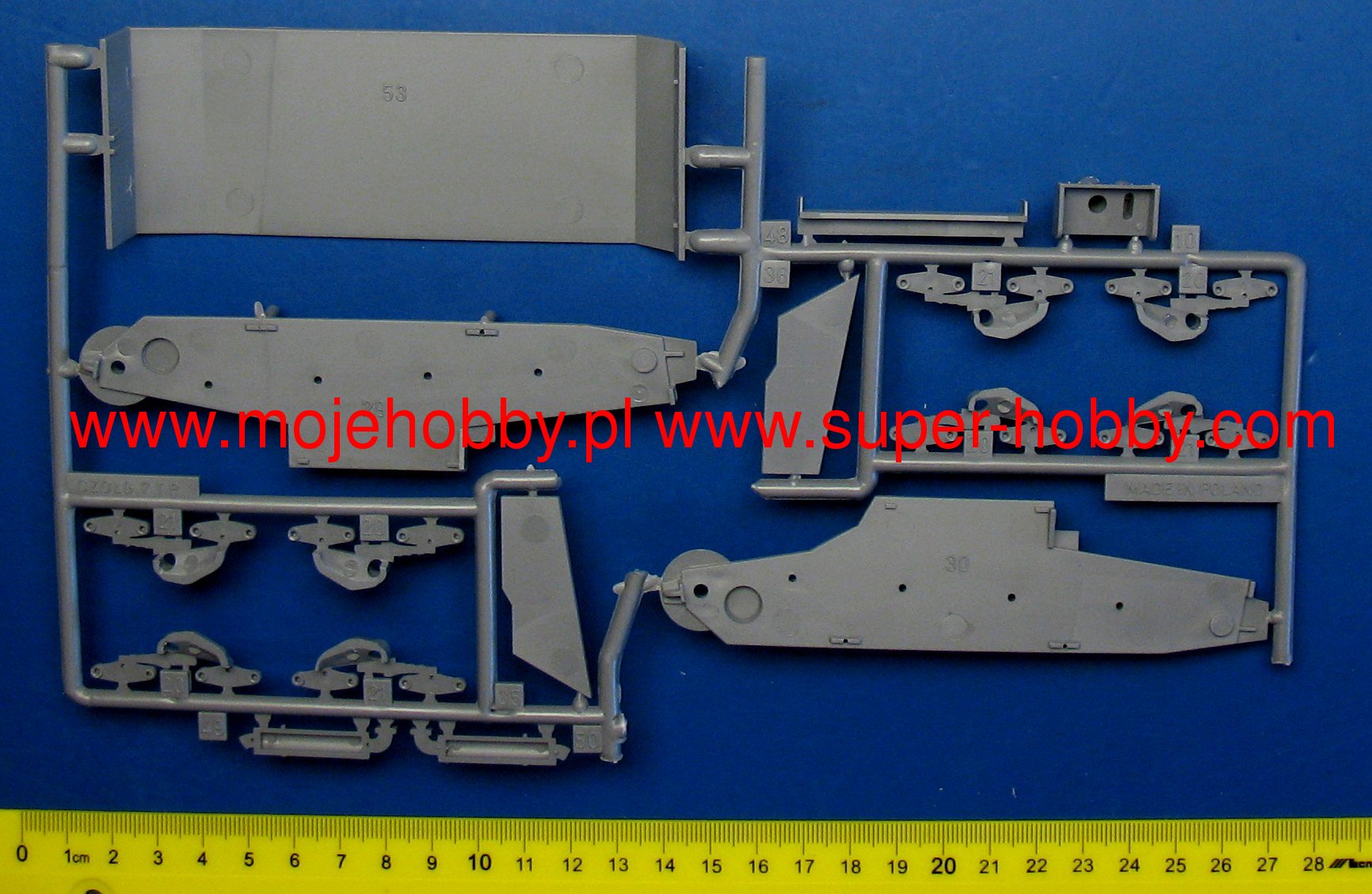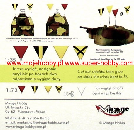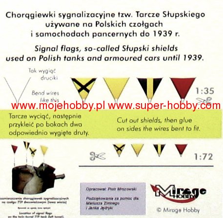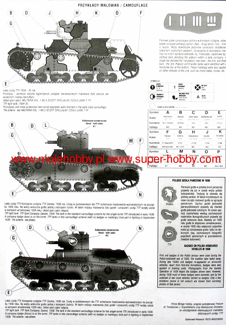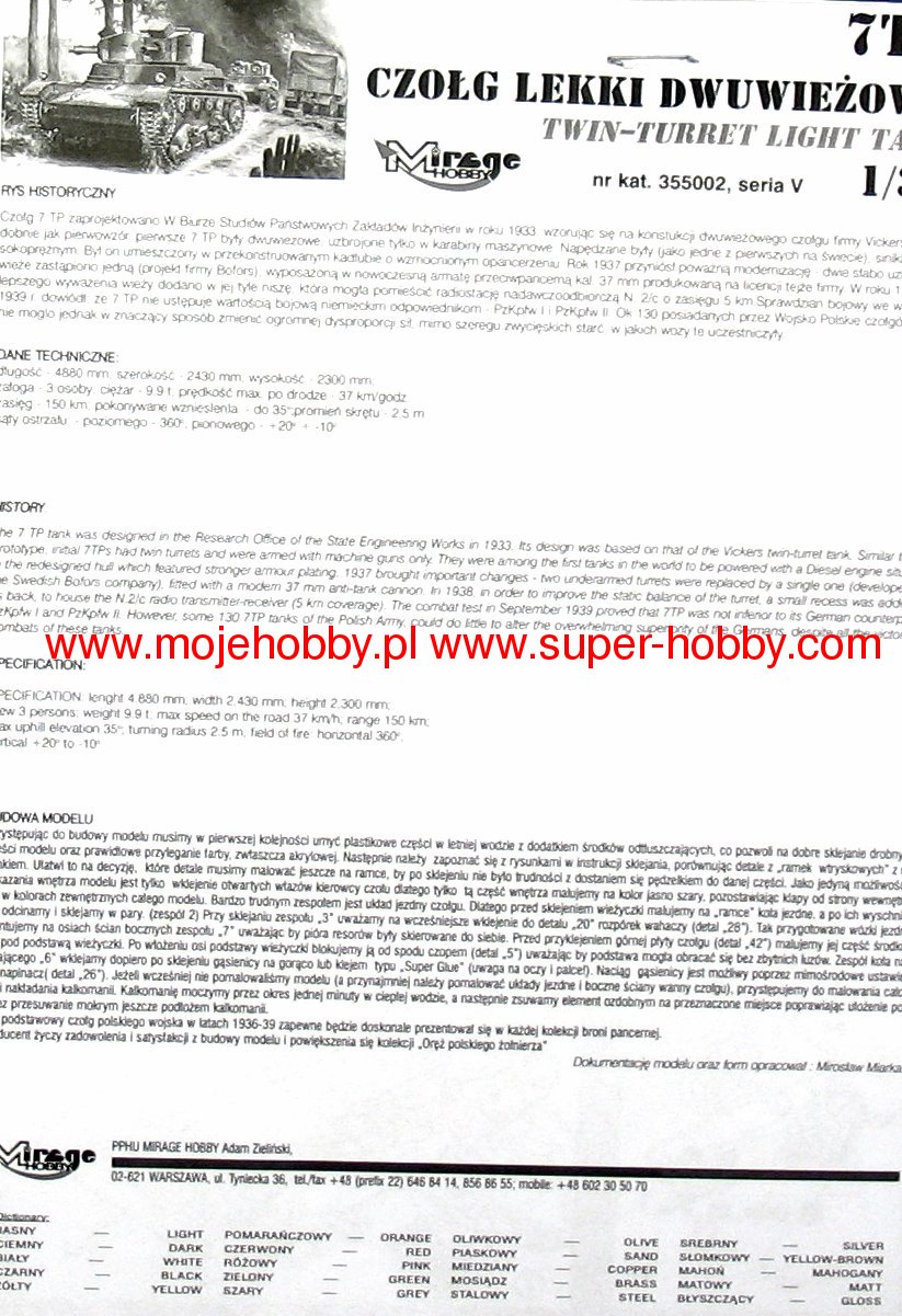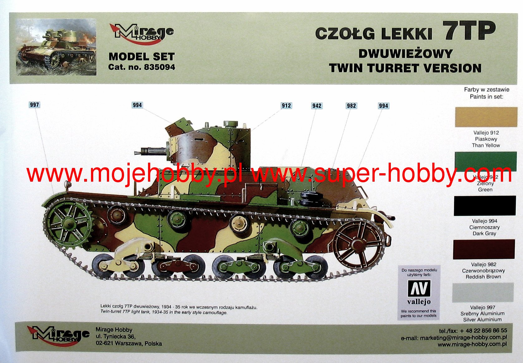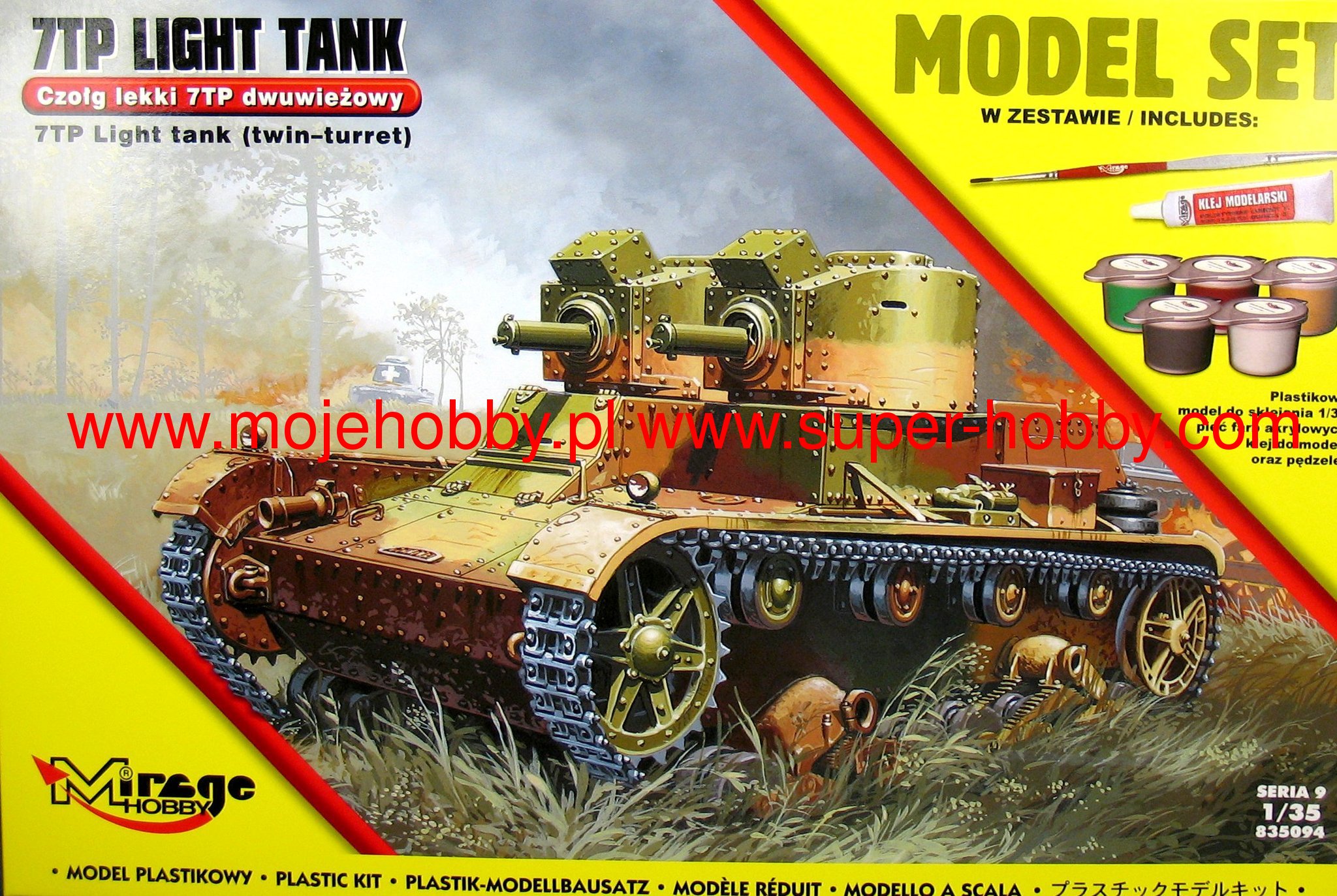 Download Mirage Hobby PDF cataloguePolish light tank from the beginning of World War II. The 7TP tank, along with the tankettes (e.g. TKS), was the basic element of the Polish armored forces in 1939. 7 TP was designed at Państwowe Zakłady Inżynierii in Ursus, where it was also produced since 1935. The tank is a development of the British Vickers E, the license of which was acquired by Poland in the early 1930s. The first 24 examples of the 7TP were twin-turret vehicles, the next serial ones (built from 1937) already had one turret, and the main armament was the anti-tank gun. 37mm by Bofors. The 7TP tank was a technically advanced design for its time. It was one of the first in the world to have a diesel engine, a reversible periscope, and in some copies also radio stations (RKBc 2N / C) with a range of up to 25 km. During the September campaign, around 130 tanks of this type of all variants were used. The 7TP proved itself on the battlefields of September 1939 as an opponent towering over the German Pz.Kpfw I and II, and at least equal to the Pz.Kpfw III and IV. Technical data: weight 9.4-9.9t, engine power: 110HP, speed: 37km / h, armament (single turret version): 1 Bofors 37mm cannon, 1 machine gun wz. 30 cal. 7.92mm.