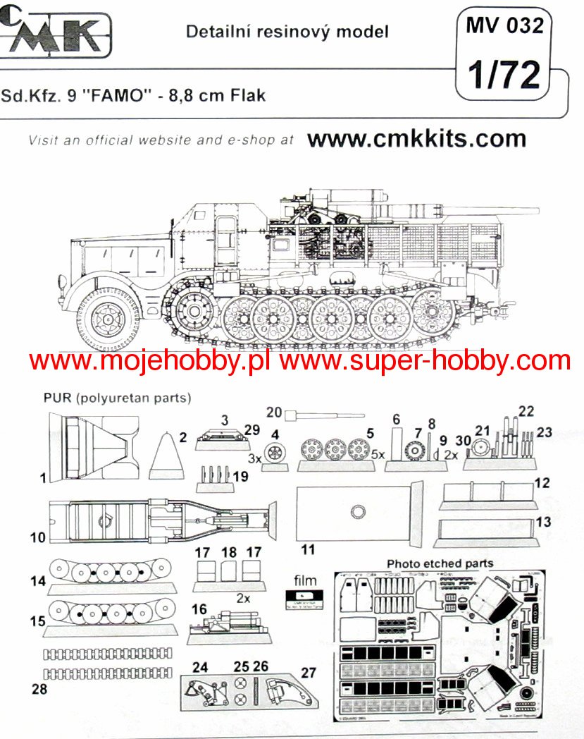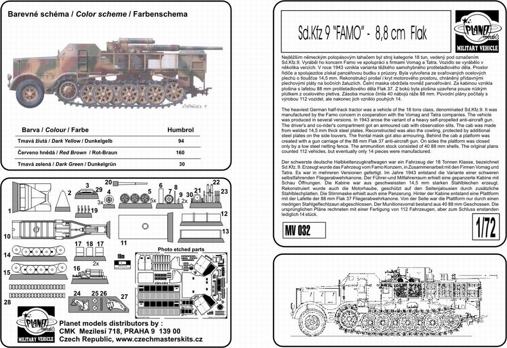 Sd.Kfz. 9 (it. Sonderkraftfahrzeug 9) was a German half-track transporter from the Second World War. The first prototypes were built in 1936, and serial production continued in 1939-1945, ending with the production of about 2,500 copies of this vehicle. The drive was provided by a single motor Maybach HL 108TUKRM with 270 HP. Sd.Kfz. 7 did not have fixed armament as a standard. Sd.Kfz. 9 was originally designed at FAMO as a specialized artillery tractor for heavy and heaviest artillery regiments. Even the early production batches of the car were quite heavy (nearly 20 tons!), But they were highly maneuverable, had very good off-road mobility and had considerable traction. They also proved to be reliable, mechanical and with little failure. In practice, Sd.Kfz. 9 during World War II was used primarily as a towing and rescue vehicle in field repair units. Its task was to retrieve its own damaged or immobilized tanks or self-propelled guns from the battlefield. Two versions of the car were made: Sd.Kfz. 9/1 with a crane with a lifting capacity of 6 tons and Sd.Kfz. 9/2 with a crane with a lifting capacity of 10 tons. Small amounts of Sd.Kfz. 9 served - apart from the German army - in the armed forces of Romania.