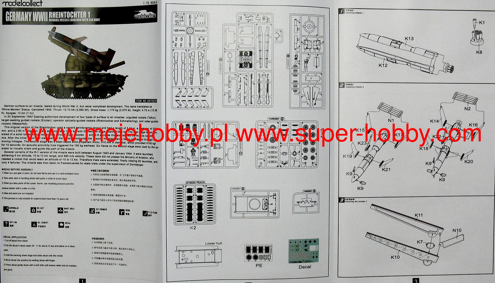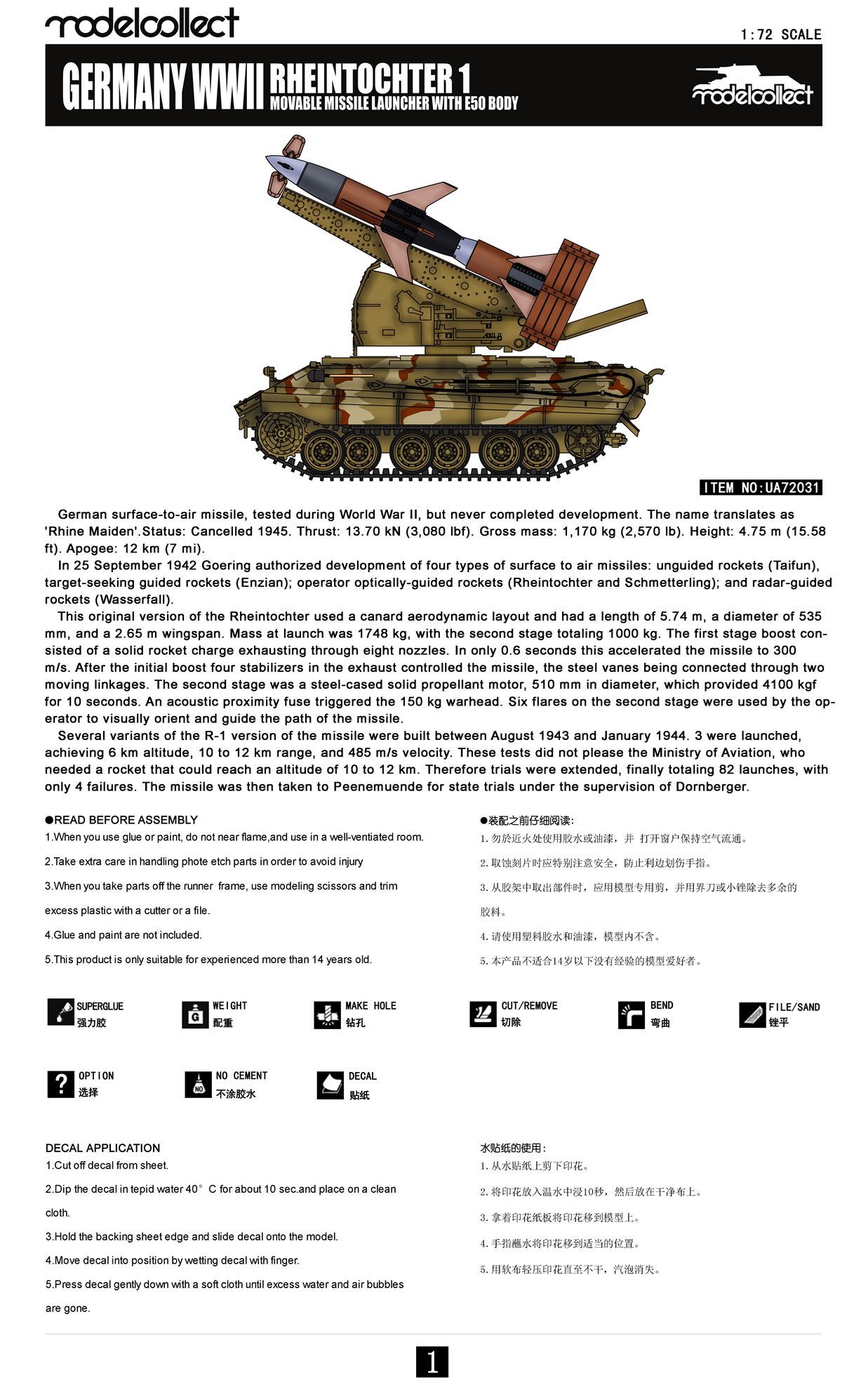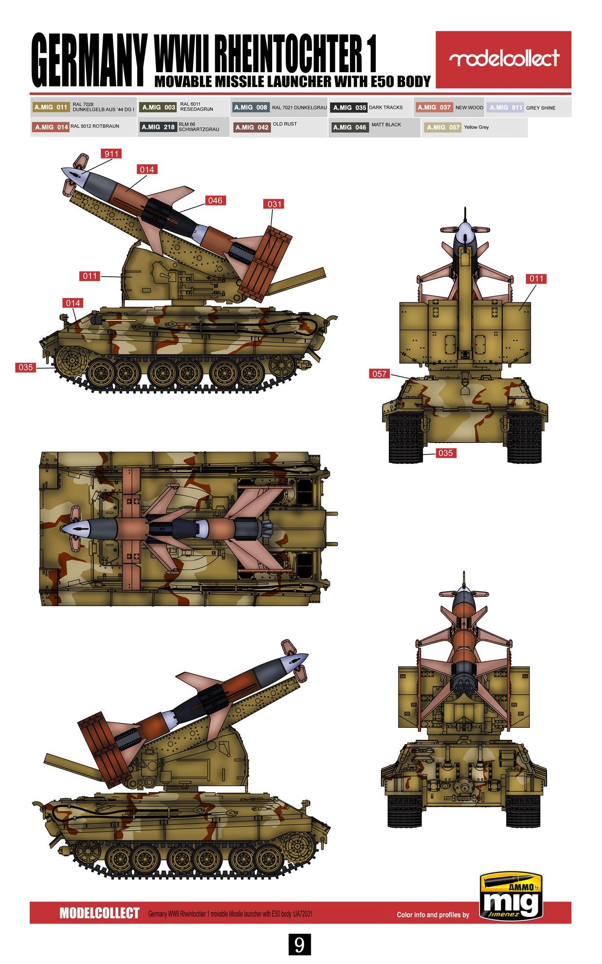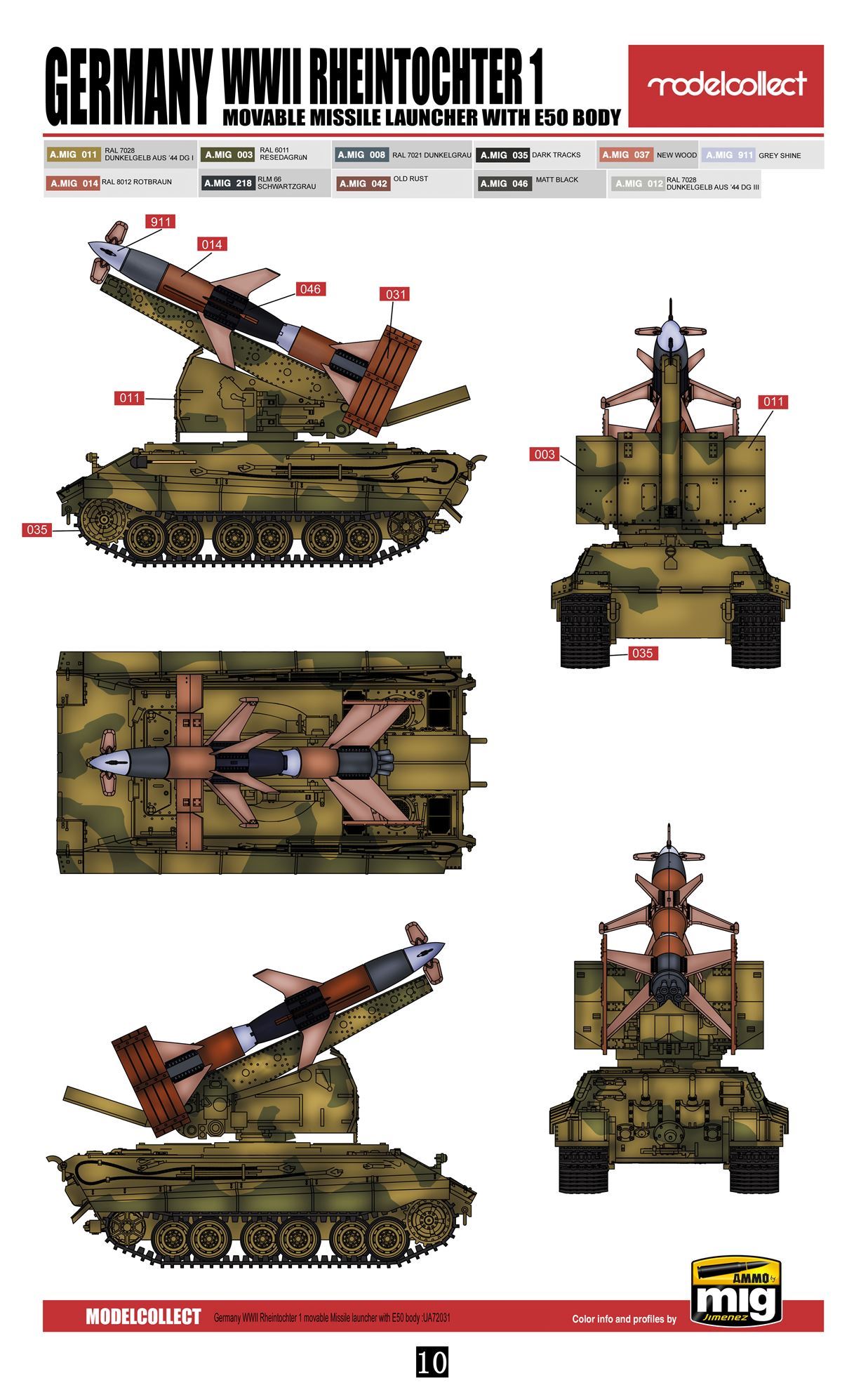 E-50 Standardpanzer был экспериментальным немецким основным боевым танком времен Второй мировой войны, который так и не был запущен в серийное производство. Вероятно, он был вооружен 88-мм пушкой KwK 43 L/71 и 1 или 2 пулеметами. MG34 или MG42 калибра 7,92 мм. Работы по проектированию танка Е-50 были начаты в в рамках программы Entwicklungsserie, т.е. программы развития немецкой бронетехники, которая должна была привести к созданию унифицированной конструкции серии из шести боевых машин разной массы, но с использованием как можно большего количества общих компонентов. Аналитическая и концептуальная работа по этой программе была начата в середине 1943 года. Танк Е-50 в этом проекте должен был стать основным танком немецкой армии, выполняя универсальную роль на поле боя, т.е. обладая подвижностью среднего танка, но огневой мощью тяжелого танка. Корпус и ходовая часть Е-50 должны были во многом основываться на тех, что использовались в Pz.Kpfw. VI Tiger II, а башня должна была быть от другого экспериментального танка Panther Ausf. Ф - так называемая Шмальтурм. В конечном итоге Е-50 должен был заменить в линейке танки Pz.Kpfw V Panther и Pz.Kpfw VI Tiger.Rheintochter (немецкая дочь Рену) немецкая экспериментальная управляемая ракета класса земля-воздух периода Второй мировой войны. Рейнтохтер представлял собой двухступенчатую ракету с дальностью от 16 000 метров, способную нести боеголовку массой до 2224 килограммов. Первые работы по Рейнтохтеру начались в 1941 году на фирме Рейнметалл-Борзиг, но первые экземпляры ракеты были готовы только осенью 1943 года. Rheintochter должен был стать оборудованием зенитных частей, а с 1943 года для борьбы с бомбовыми экспедициями союзников над Германией. Ракета должна была быть максимально эффективной, что подразумевало использование радиоволнового наведения. Всего было создано три варианта ракеты Rheintochter. Первый, обозначенный как R1, не достигал скорости звука и фактически использовался в основном для экспериментов с системой рулевого управления и общих аэродинамических предположений снаряда. Очень похожей на версию R1 была версия R2, которая, однако, оказалась крайне неудачной и от нее отказались в 1944 году. Окончательным вариантом стала ракета Rheintochter R3, в которой были изменены двигательная установка и расположение боевой части. Это привело к значительному улучшению характеристик, но силовой агрегат оказался крайне аварийным, что сделало невозможным введение системы в строй. Окончательно программа Rheintochter была отменена в феврале 1945 года. Вероятно, было создано около 50 ракет этого типа, которые использовались только для испытаний и экспериментов.