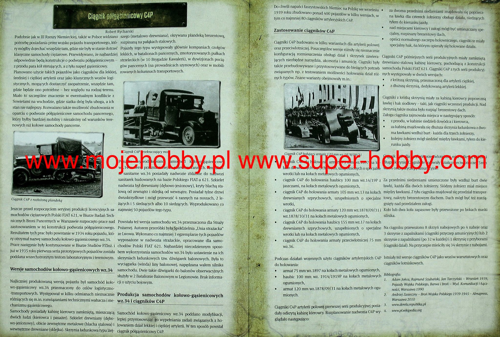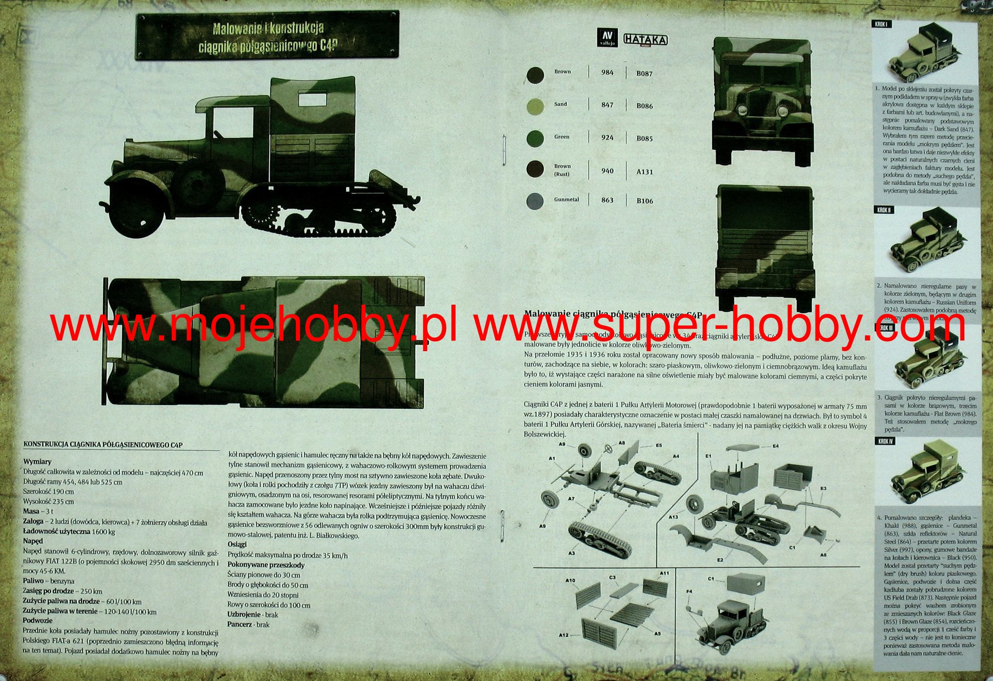 C4P is a Polish half-track artillery tractor from the interwar period and World War II. The first prototypes of the vehicle were made in 1934, and serial production continued in the period 1935-1939, ending with the production of about 400 examples. The C4P was powered by an engine FIAT-122B with 46 HP. The vehicle did not have any permanent weapons. Along with the slow motorization and mechanization of the Polish Army at the turn of the 1920s and 1930s, it was decided to increase the mobility of Polish artillery and to use newly developed half-track vehicles in some of its units. In the development of the new vehicle, many components of the Fiat 621 truck produced in Poland were used, and in the track machine, elements from the Vickers E tank and French designs by Citroen and Kegresse were used. Finally, a successful design with good mobility and maneuverability was created, but it is characterized by a lot of fuel chewing and a weak engine. Specialized versions were created on the C4P chassis: a truck, a workshop car and an ambulance. C4P vehicles were used in the September campaign in 1939, but probably none of them survived World War II.