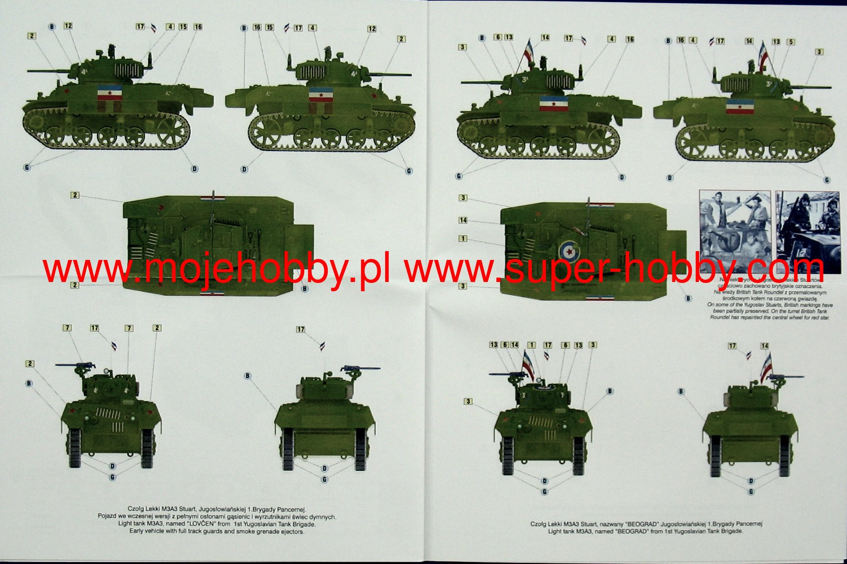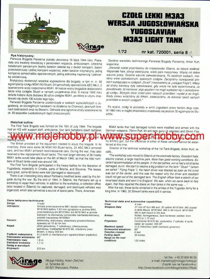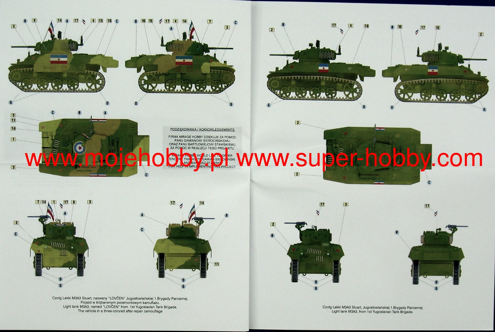 Download Mirage Hobby PDF catalogueThe M3 / M5 Stuart is an American light tank from the Second World War. The history of the M3 began in 1940, when the US Army saw the need to replace the old M2 with a more modern design. After several months of testing, the American Car and Foundry company released the first serial copy of the new tank, designated M3, in March 1941. The production of this successful tank lasted until 1945 and ended with the production of over 22,000 units! The M3 was powered by a Continental W-970-9A 7-cylinder engine with a capacity of 250 HP or a 9-cylinder Guilberson T-1020-4 diesel engine with a capacity of 210 HP. On the other hand, the M5 tank was powered by two coupled Cadillac V-8 engines with a capacity of 220 HP each. In total, several versions of the M3 tank were created. The first production series was marked M3, the next was M3A1, which min. was stripped of the watchtower and no longer had side machine guns. The M3A3 model entered production in 1943, with numerous improvements from the fighting in North Africa. Production of the M5 also began in March 1942, which was essentially a modification of the M3. The M5 tank was made in only two versions: M5 and M5A1. The latter had an elongated turret, an improved cannon mount and a new machine gun mount on the turret. The last modification was not used on all tanks of this version. The M8 self-propelled gun was also created on the basis of the M3 / M5 tank. The tanks were massively exported to Great Britain under the Lend and Lease Act program. In the American and British service, they served in North Africa, Italy, Normandy, and in the battles in France and Germany in 1944-1945. Tanks in the declining period of the war were replaced by the M24 Chaffe. The M3 / M5 Stuart is recognized as one of the best light tanks of World War II. Satisfactory range, speed and maneuverability all made him highly valued by his crews. Technical data (M3A3 version): length (with a barrel): 4.52m, width: 2.24m, height: 2.52m, engine power: 210-250KM, range: 217km, maximum speed (on the road): 58km / h, armament: 1 M6 37mm cannon, 2 7.62mm M1919 machine guns.