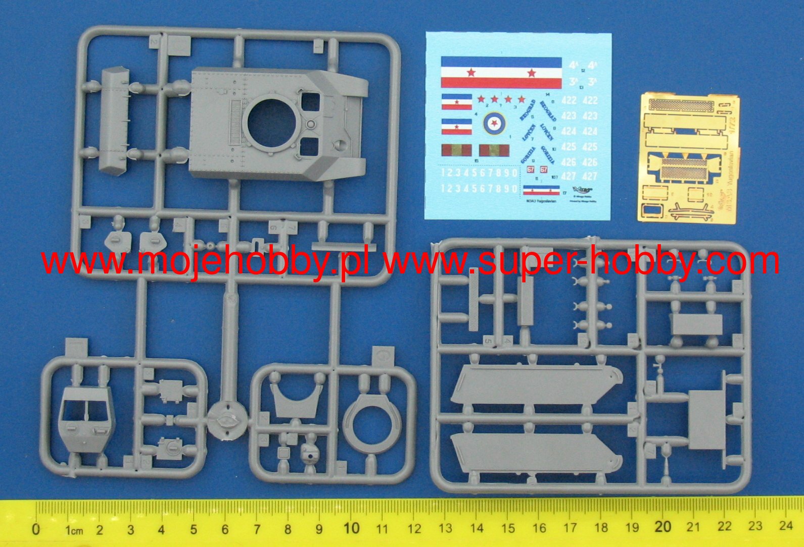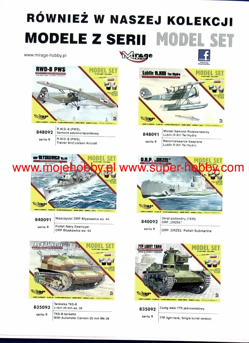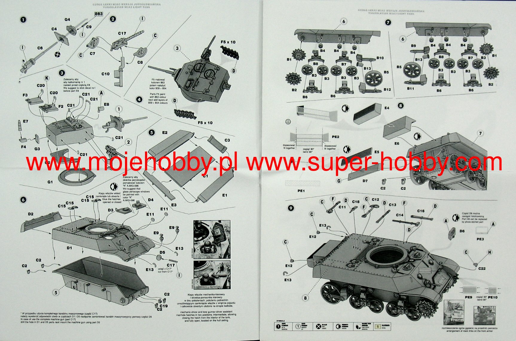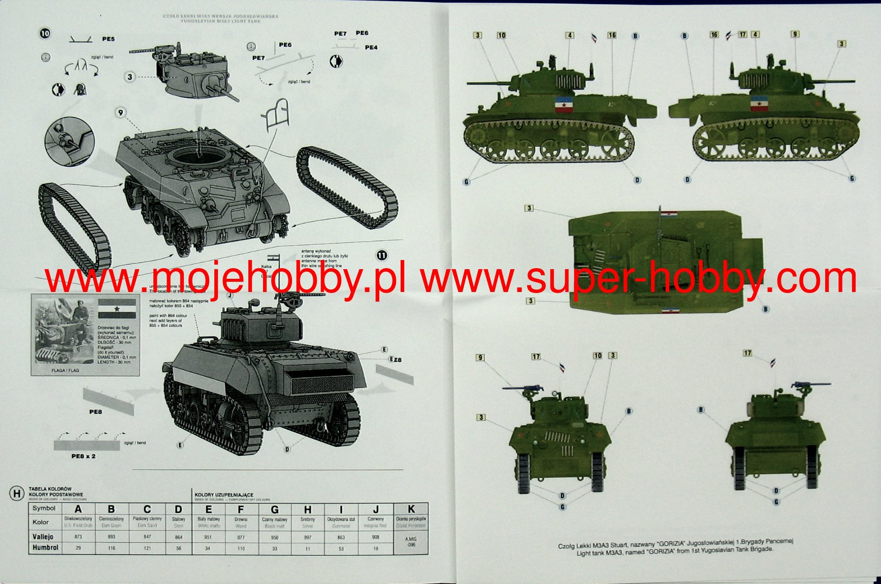 Download Mirage Hobby PDF catalogueThe M3 / M5 Stuart is an American light tank from the Second World War. The history of the M3 began in 1940, when the US Army saw the need to replace the old M2 with a more modern design. After several months of testing, the American Car and Foundry company released the first serial copy of the new tank, designated M3, in March 1941. The production of this successful tank lasted until 1945 and ended with the production of over 22,000 units! The M3 was powered by a Continental W-970-9A 7-cylinder engine with a capacity of 250 HP or a 9-cylinder Guilberson T-1020-4 diesel engine with a capacity of 210 HP. On the other hand, the M5 tank was powered by two coupled Cadillac V-8 engines with a capacity of 220 HP each. In total, several versions of the M3 tank were created. The first production series was marked M3, the next was M3A1, which min. was stripped of the watchtower and no longer had side machine guns. The M3A3 model entered production in 1943, with numerous improvements from the fighting in North Africa. Production of the M5 also began in March 1942, which was essentially a modification of the M3. The M5 tank was made in only two versions: M5 and M5A1. The latter had an elongated turret, an improved cannon mount and a new machine gun mount on the turret. The last modification was not used on all tanks of this version. The M8 self-propelled gun was also created on the basis of the M3 / M5 tank. The tanks were massively exported to Great Britain under the Lend and Lease Act program. In the American and British service, they served in North Africa, Italy, Normandy, and in the battles in France and Germany in 1944-1945. Tanks in the declining period of the war were replaced by the M24 Chaffe. The M3 / M5 Stuart is recognized as one of the best light tanks of World War II. Satisfactory range, speed and maneuverability all made him highly valued by his crews. Technical data (M3A3 version): length (with a barrel): 4.52m, width: 2.24m, height: 2.52m, engine power: 210-250KM, range: 217km, maximum speed (on the road): 58km / h, armament: 1 M6 37mm cannon, 2 7.62mm M1919 machine guns.