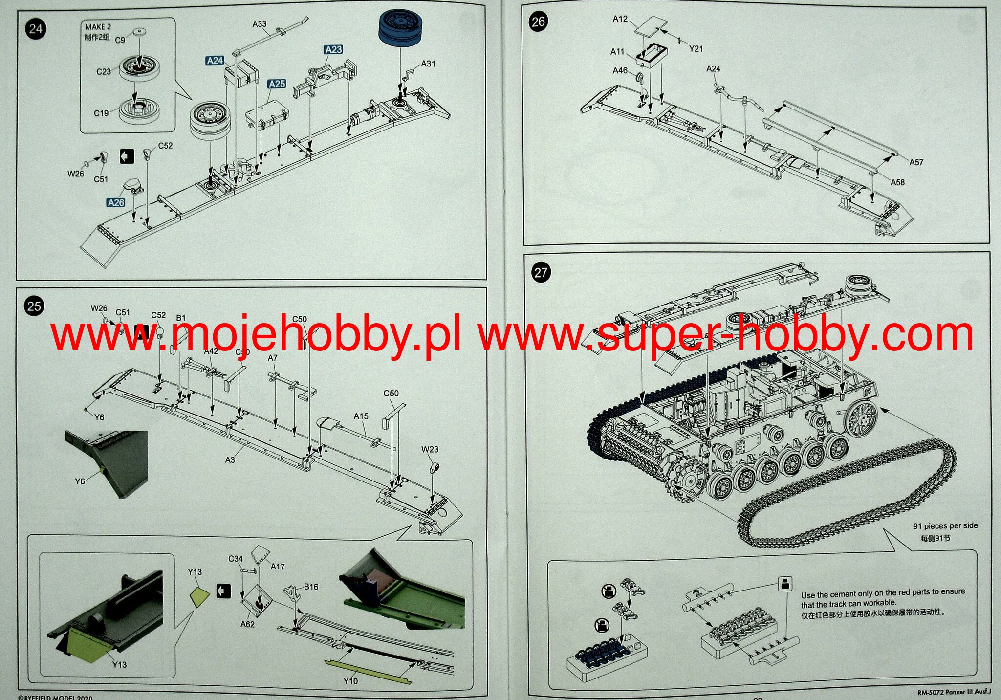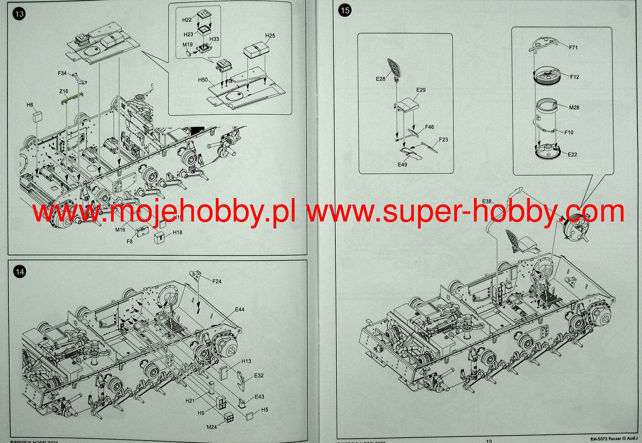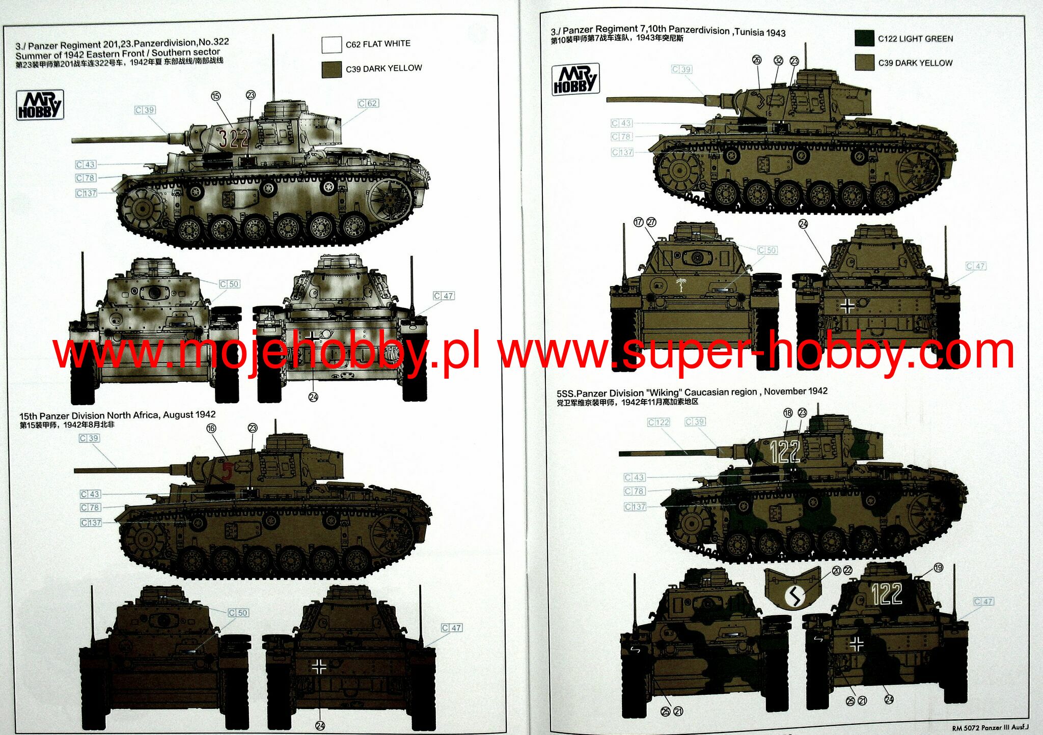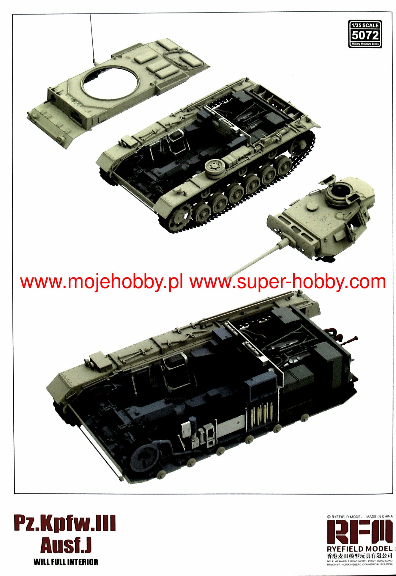 The PzKpfw III (Panzerkampfwagen III) was a German medium tank from the Second World War. The first prototypes of the vehicle were made in 1936, and serial production continued in the period 1937-1943, ending with the production of about 5,800 vehicles. The tank in the E version was powered by a single Maybach HL 120 TRM engine with a capacity of 300 HP. It was armed with one 37mm KwK 35/36 cannon and two 7.92mm MG 34 machine guns. placed in the tower. PzKpfw III was the "workhorse" of the German armored forces during World War II and one of the most intensively developed and modernized Wehrmacht tanks. Its serial production started in 1936, and many variants of this tank were created in its course. Chronologically, the first version was the A version, armed with a 37mm gun and a 230hp engine. However, already in December 1938, the E version was created, which was the first version produced in large series. It had a new, significantly more powerful engine, a completely new suspension and stronger armor in the front part of the turret and hull. Later (from December 1940) it was also armed with a more powerful 50mm cannon. In March 1940, the G version began to be produced, in which the rear hull and turret armor was reinforced. Soon after, in October 1940, the production of the H version started, which from the very beginning was armed with the 50mm KwK 38 L / 42 gun and had reinforced frontal armor. One of the most produced was the J version, which had armor up to 50 mm thick (later reinforced with aplique plates), and after the experience gained from the clashes with the T-34 and KW-1 vehicles - it was intensively rearmed for the KwK 39 L / 60 cannon. cal. 50 mm. The last development version was the N version, which was to be a support tank for armored grenadiers and was armed with a 75mm KwK 37 L / 24 short-barreled cannon. Numerous other vehicles were built on the chassis of the PzKpfw III, such as the StuG III assault gun. PzKpfw III tanks were used on almost all fronts of World War II - from the September campaign in 1939, through the campaign in France in 1940, operations Barbarossa and Typhoon in 1941, the Battle of Kursk in 1943, to the last operations of the German army against The USSR and the Western Allies in 1944-1945.