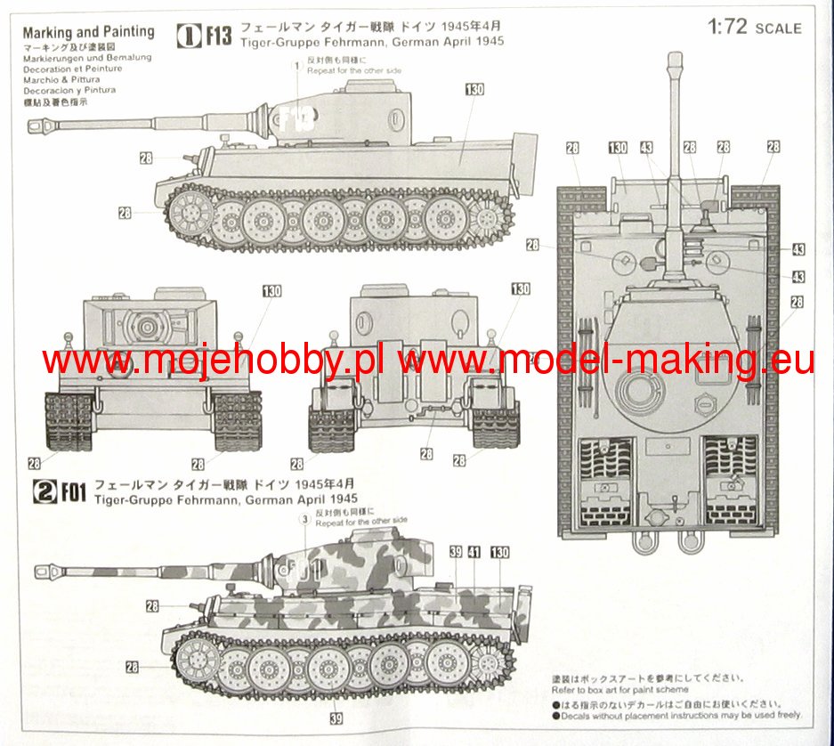 The Pz.Kpfw VI (Sd.Kfz.181) Tiger is a German heavy tank from World War II, one of the most famous combat vehicles of that time. The command of the German Panzerwaffe had the idea of creating a heavy tank from the beginning of the war, but the first attempts in the form of the centuries-old Neubaufahrzeuge tank turned out to be unsuccessful. In 1939 and 1940 they were conducted ineffectively, but after the clash with the T-34 and KW-1 on the eastern front, work on the new heavy tank sped up. On April 20, 1942, the prototype of the new tank, under the designation VK 4501 (H), underwent field trials in the presence of Adolf Hitler and was put into mass production shortly after. The first production versions were designated Pz.Kpfw VI Ausf.H1 (later Ausf.E). In the course of production, in the years 1942-1945, the tank was systematically modified by, for example, adding Feifell dust filters, different placement of headlights, modernization of optical equipment, changes to the commander's turret, etc. The drive was provided by a Maybach HL230 P45 12-cylinder carburetor engine with a capacity of 700 HP. The Pz.Kpfw VI tank, although it did not have such a contoured front hull as the T-34 or Pantera, was a heavily armored vehicle (frontal armor up to 120mm), armed with a very effective KwK 36 L / 56 88mm gun, which earned the reputation of being the most effective tank of the Second World War. It was a vehicle much better than the Allied M4 or Churchill and the Soviet T-34/76. He could also easily fight the IS-2 or M-26, surpassing them with the effectiveness of the main armament. On the other hand, the Pz.Kpfw VI had some disadvantages - first of all, it was extremely time-consuming to produce and had a very complicated suspension. In the later period of the war, the quality of the Tiger's armor also deteriorated, which resulted from the lack of access to the molybdenum deposits by the German economy. Despite these drawbacks, the Tiger on the battlefields proved to be a very effective weapon. He successfully fought in Tunisia, the Kursk Arch, Normandy and on the Eastern Front. Technical data: length (with a barrel): 8.45m, width: 3.7m, height: 2.93m, engine power: 700KM, weight: 56.9 t, range (on the road): 100km, maximum speed (on the road) ): 38 km / h, armament: 1 88 mm KwK 36 L / 56 gun, 3 7.92 mm MG 34 machine guns.