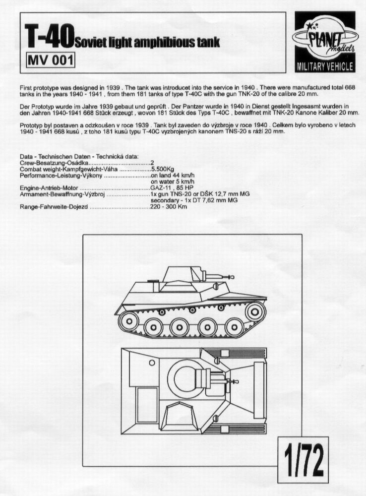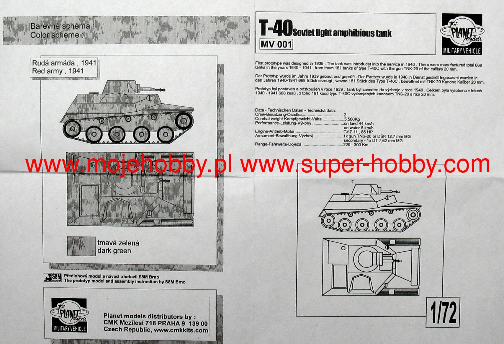 The first prototypes of the T-40 light amphibious tank were created in 1939, and a year later mass production started, which ended in 1941 with the production of about 700 examples. The T-40 tank was powered by a 70hp GAZ-202 engine. Its main armament was a 20mm SzWAK cannon (placed in a rotating turret) or - in the first short production series - two 7.62mm and 12.7mm machine guns. The T-40 tank was created as a successor to another light tank of the Red Army - the T-38. During the design and serial production, many components from the T-38 were used. However, the new tank differed from its predecessor in many elements, including: much better ability to overcome water obstacles, better seafaring and, above all, a much more powerful main armament. The T-40 underwent its baptism of fire in the first months of Operation Barbarossa in 1941. However, despite its considerable maneuverability and good driving properties, it suffered high losses due to its use by Soviet armored officers not for reconnaissance and reconnaissance (for which it was designed) but to support attacks by infantry units. Although the T-40 was withdrawn from the front line at the end of 1941, it was used in 1943 and 1944 in the Dniester and Dnieper crossing operations.