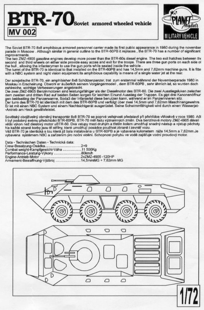 The wheeled armored personnel carrier BTR-70 was developed in the late 1960s and entered service with the Soviet Army in 1973. Serial production of the vehicle took place in the years 1973-1984. The vehicle was powered by two carburetor engines with a total power of 240 HP and took 7 landing soldiers. The crew consisted of two people: the commander and the mechanic-driver. The BTR-70 transporter was created as a successor to the BTR-60. The main armament of the car (a 14.5 mm machine gun) was still in the rotating turret, which allowed for effective circular fire. The BTR-70, however, towered over its predecessor with much more powerful engines of the ZMZ-4908 type and a slightly better crew protection. By far the biggest disadvantage of the BTR-70, just like its predecessor, was the disastrous placement of very small hatches for the landing troops. In addition, the big drawback was the complicated drive system, very difficult to repair in combat conditions, as well as the too small lifting angle of the main weapon, which was changed later in subsequent versions. The BTR-70 wheeled armored personnel carriers were used in combat in Afghanistan in 1979-1989 and in armed conflicts led by the Russian Federation in the Caucasus after 1989. Various versions of the BTR-70 are still used today, primarily by Russia, but also by, for example, Ukraine and Lithuania.