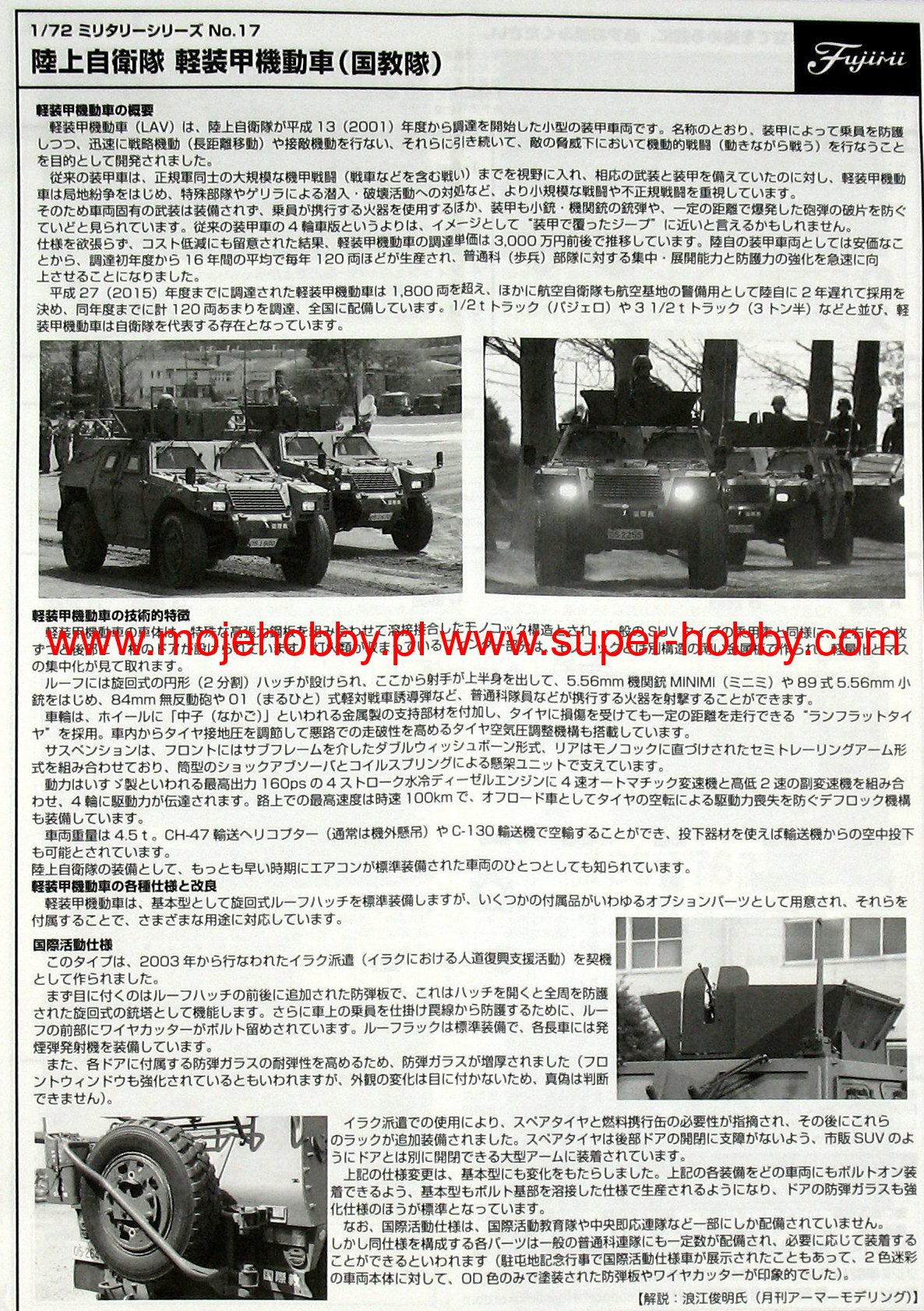 Komatsu LAV (Light Armored Vehicle) is a contemporary Japanese light armored and reconnaissance vehicle. The first prototypes appeared in the late 1990s, and the car began to enter the line in 2002. The curb weight of the vehicle is 4,500 kilograms, with a length of 4.4 meters and a width of 2.04 meters. The drive is provided by a single diesel engine with a power of up to 160 HP. The maximum speed of the vehicle is up to 100 km / h. The armament consists of a single 5.56 mm or 12.7 mm machine gun. The Komatsu LAV was developed to replace the Mitsubishi Type 73 and Toyota HMV in the Japanese self-defense forces. In general, the vehicle is very similar to the French Panhard VBL. The armor is made of steel and it is assumed that it provides protection against, at least, machine gun fire with a caliber of up to 7.62 mm. Certainly, however, the cover provided to the crew is better than in the armored variants of the HMMWV. The car also has good off-road characteristics and very good performance. It can be transported by air. Currently, the line includes over 1000 vehicles of this type, and their only user is Japan.