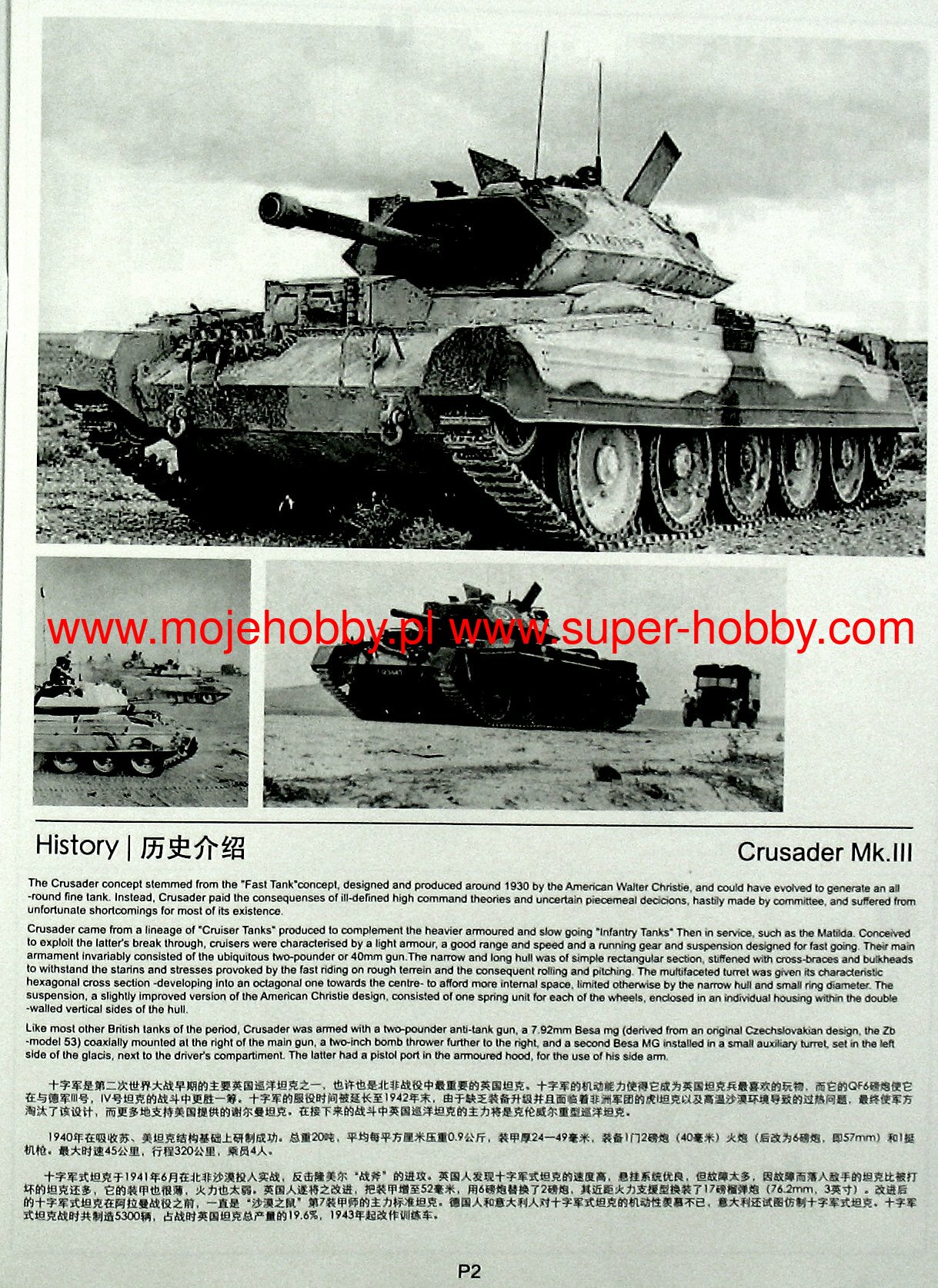 The Crusader was a British tank of the Second World War. The first prototypes were built in 1939, and serial production continued in 1940-1943. In total, about 4,900 copies of this tank were built. Crusader was powered by an engine Nuffield Liberty Mk II with 340 hp. The vehicle was armed with - depending on the version - a single 40mm QF 2-pounder cannon or a single 57mm QF 6-pounder cannon and two 7.92mm and 7.7mm machine guns. Tank Crusader was constructed as a successor to the failed Convenanter A13 car. First of all, the new tank was more carefully designed, which meant it had a much lower failure rate than its predecessor. The armor has also been improved. Despite these changes The Crusader, when it entered service, still had too weak armor, and above all, too weak weapons to fight enemy tanks. Its strengths include the aforementioned low failure rate and good mobility. Nevertheless, after the end of the North African campaign (1940-1943) in which the Crusader tanks played a major role, they were systematically and quickly withdrawn from the frontline units. Several versions of this tank were created in the course of serial production. Chronologically, the first was the Crusader I, which was the first mass-produced version of this tank. In May 1942, the Crusader III version made its debut, with a new 57mm gun and 51mm reinforced armor. After 1943, numerous specialist vehicles based on the Crusader chassis were built, such as the Crusader II Gun Traktor or the Crusader III AA Mk. I and II. Crusader tanks found themselves in the Free French, Australian and New Zealand units. They also became part of the equipment of the Polish Armed Forces in the West (PES).