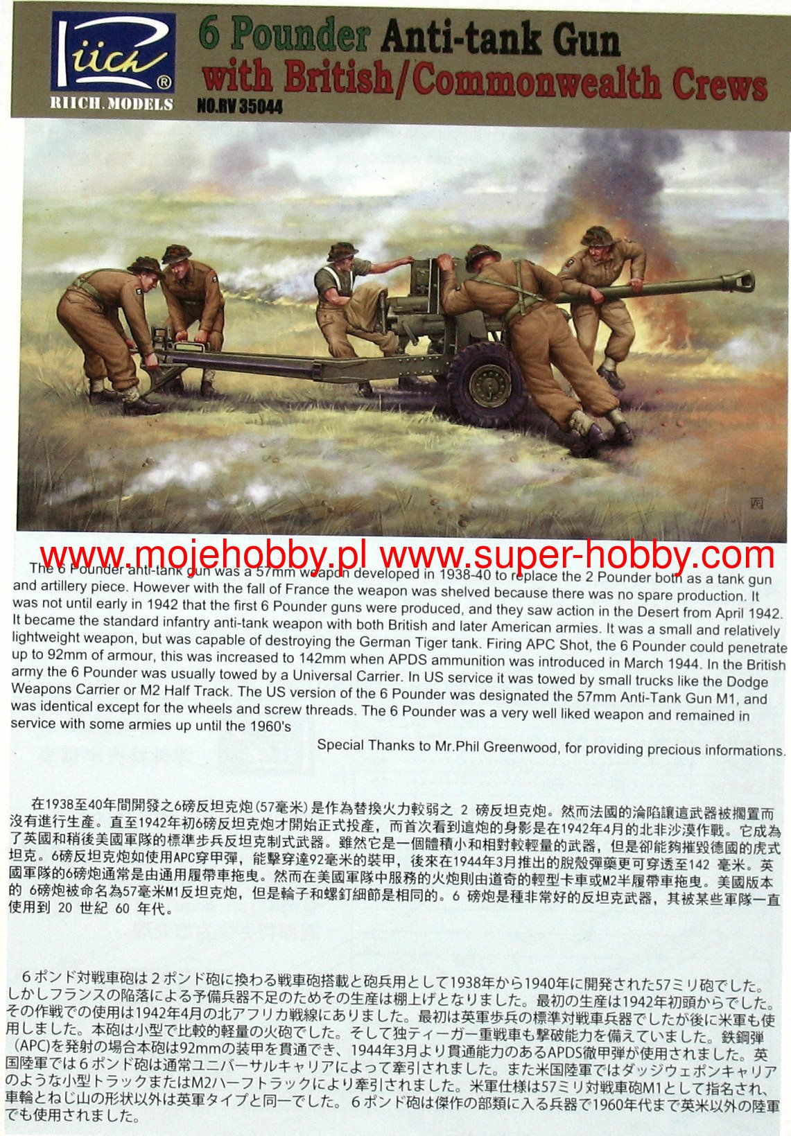 6-pounder (Royal Ordonance QF 6-pounder) британское противотанковое орудие времен Второй мировой войны и послевоенного периода. Его первые опытные образцы были изготовлены в 1940 году, а серийное производство началось годом позже и продолжалось до 1945 года. Начальная скорость подкалиберного снаряда из этого орудия составляла до 914 м/с, при максимальной дальности 4600 метров. 6-фунтовая пушка была разработана и запущена в производство для замены 2-фунтовой противотанковой пушки британской армии. По сравнению с предшественником новое орудие отличалось гораздо лучшим пробитием брони техники противника, а также появилась возможность использовать осколочно-фугасные боеприпасы, что позволяло использовать его в качестве орудия поддержки пехоты. Боевое крещение 6-фунтовая пушка прошла в Северной Африке в 1942 году. В ходе серийного производства было создано несколько модификаций этого орудия, в том числе Mk. II (первая серийная версия), Mk. III (используется на таких танках, как Valentine VIII, Churchill III-IV или Crusader III), Mk. IV (версия с чуть более длинным стволом) или Molins (версия для самолетов Mosquito). 6-фунтовая пушка оставалась на вооружении до 1960 года и, помимо активного участия во Второй мировой войне, принимала участие также в войне в Корее (1950-1953 гг.) и Суэцком кризисе (1956 г.).