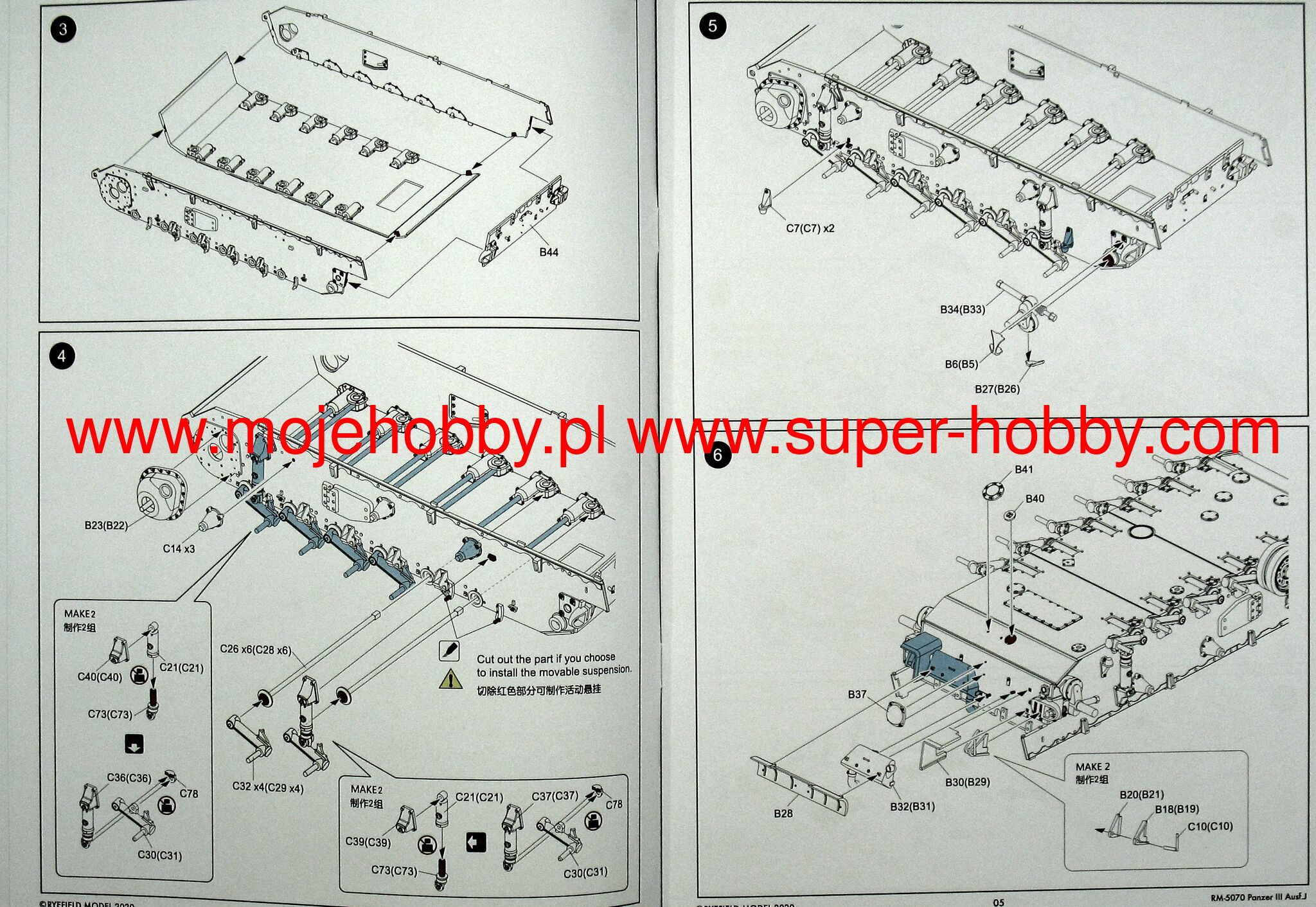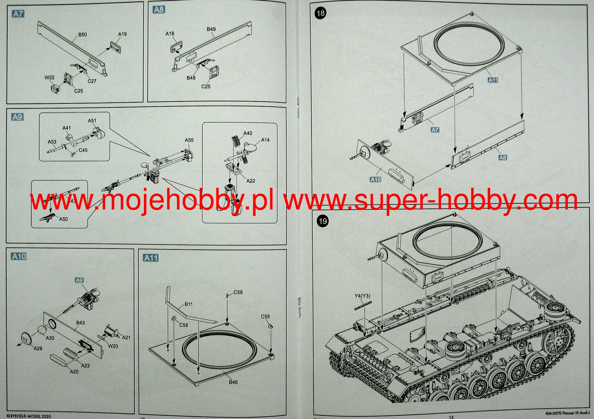 The PzKpfw III (Panzerkampfwagen III) was a German medium tank from the Second World War. The first prototypes of the vehicle were made in 1936, and serial production continued in the period 1937-1943, ending with the production of about 5,800 vehicles. The tank in the E version was powered by a single Maybach HL 120 TRM engine with a capacity of 300 HP. It was armed with one 37mm KwK 35/36 cannon and two 7.92mm MG 34 machine guns. placed in the tower. PzKpfw III was the "workhorse" of the German armored forces during World War II and one of the most intensively developed and modernized Wehrmacht tanks. Its serial production started in 1936, and many variants of this tank were created in its course. Chronologically, the first version was the A version, armed with a 37mm gun and a 230hp engine. However, already in December 1938, the E version was created, which was the first version produced in large series. It had a new, significantly more powerful engine, a completely new suspension and stronger armor in the front part of the turret and hull. Later (from December 1940) it was also armed with a more powerful 50mm cannon. In March 1940, the G version began to be produced, in which the rear hull and turret armor was reinforced. Soon after, in October 1940, the production of the H version started, which from the very beginning was armed with the 50mm KwK 38 L / 42 gun and had reinforced frontal armor. One of the most produced was the J version, which had armor up to 50 mm thick (later reinforced with aplique plates), and after the experience gained from the clashes with the T-34 and KW-1 vehicles - it was intensively rearmed for the KwK 39 L / 60 cannon. cal. 50 mm. The last development version was the N version, which was to be a support tank for armored grenadiers and was armed with a 75mm KwK 37 L / 24 short-barreled cannon. Numerous other vehicles were built on the chassis of the PzKpfw III, such as the StuG III assault gun. PzKpfw III tanks were used on almost all fronts of World War II - from the September campaign in 1939, through the campaign in France in 1940, operations Barbarossa and Typhoon in 1941, the Battle of Kursk in 1943, to the last operations of the German army against The USSR and the Western Allies in 1944-1945.