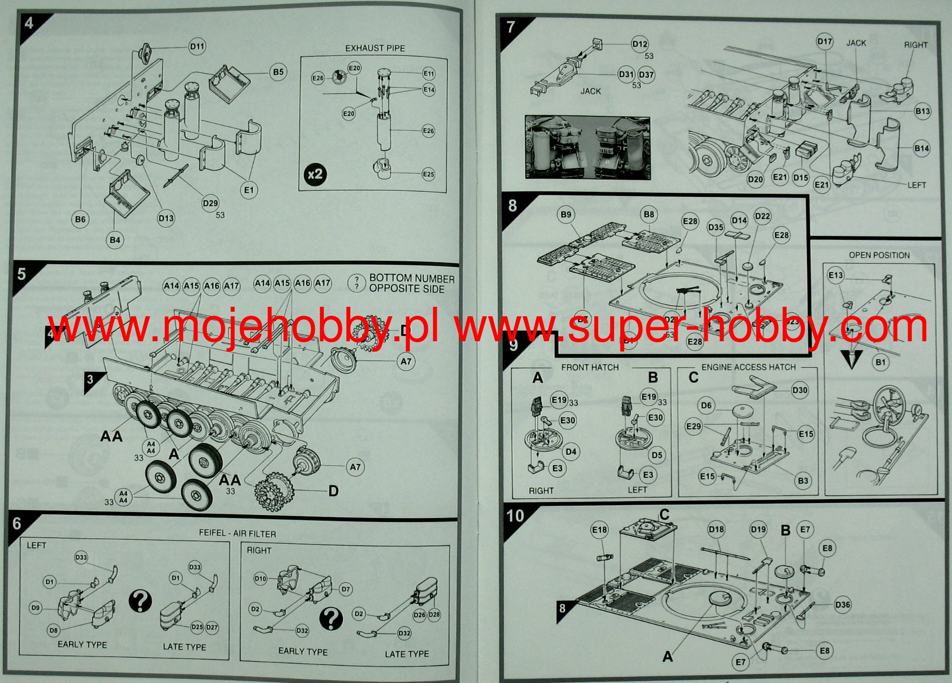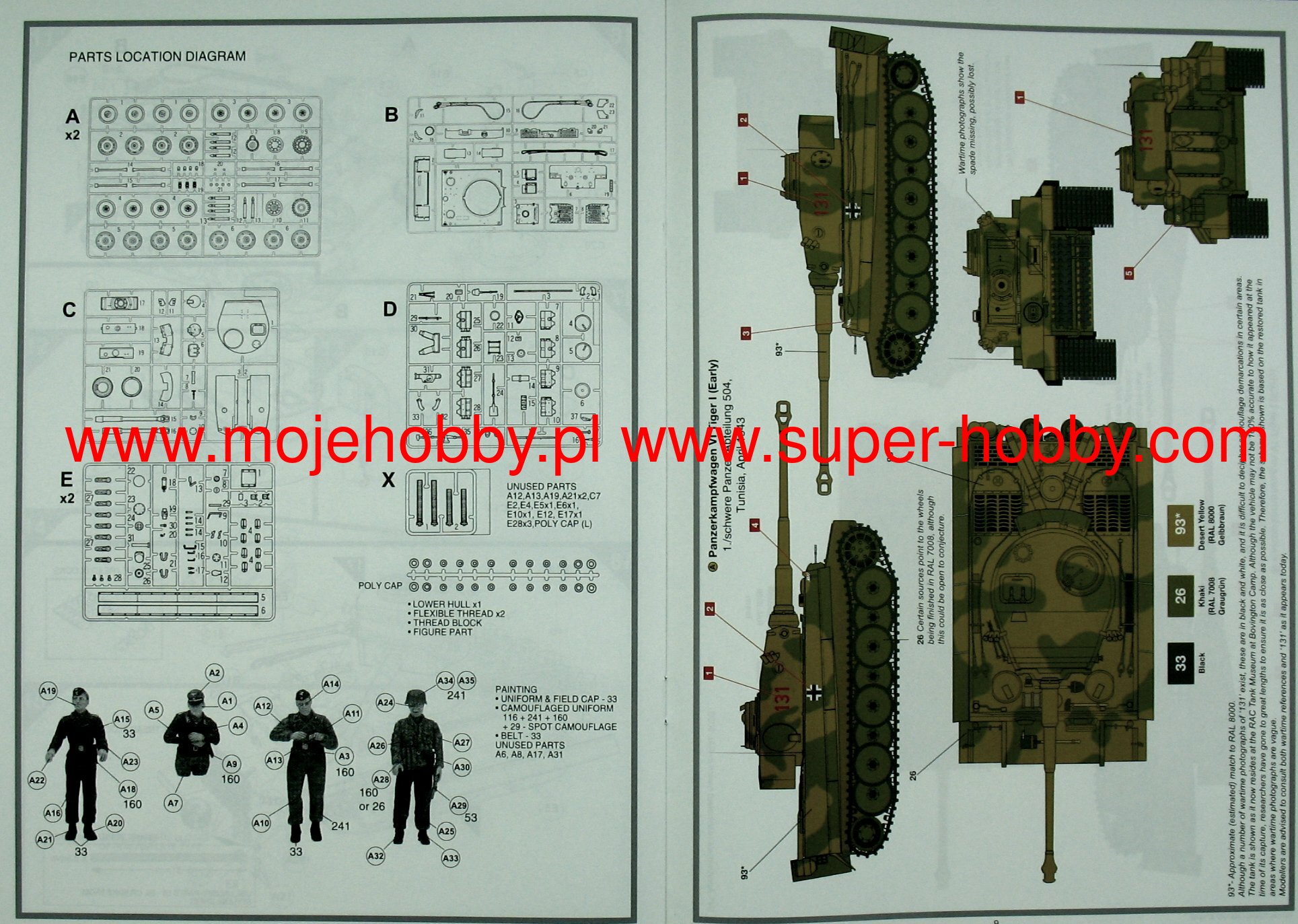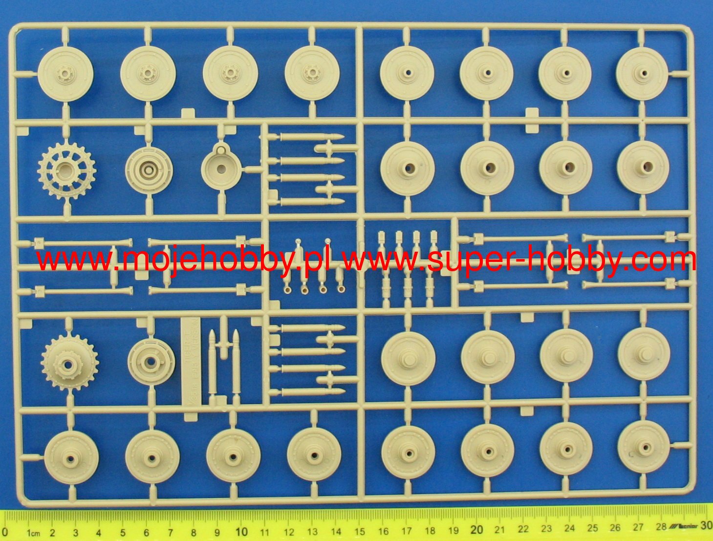 The Pz.Kpfw VI (Sd.Kfz.181) Tiger is a German heavy tank from World War II, one of the most famous combat vehicles of that time. The command of the German Panzerwaffe had the idea of creating a heavy tank from the beginning of the war, but the first attempts in the form of the centuries-old Neubaufahrzeuge tank turned out to be unsuccessful. In 1939 and 1940 they were conducted ineffectively, but after the clash with the T-34 and KW-1 on the eastern front, work on the new heavy tank sped up. On April 20, 1942, the prototype of the new tank, under the designation VK 4501 (H), underwent field trials in the presence of Adolf Hitler and was put into mass production shortly after. The first production versions were designated Pz.Kpfw VI Ausf.H1 (later Ausf.E). In the course of production, in the years 1942-1945, the tank was systematically modified by, for example, adding Feifell dust filters, different placement of headlights, modernization of optical equipment, changes to the commander's turret, etc. The drive was provided by a Maybach HL230 P45 12-cylinder carburetor engine with a capacity of 700 HP. The Pz.Kpfw VI tank, although it did not have such a contoured front hull as the T-34 or Pantera, was a heavily armored vehicle (frontal armor up to 120mm), armed with a very effective KwK 36 L / 56 88mm gun, which earned the reputation of being the most effective tank of the Second World War. It was a vehicle much better than the Allied M4 or Churchill and the Soviet T-34/76. He could also easily fight the IS-2 or M-26, surpassing them with the effectiveness of the main armament. On the other hand, the Pz.Kpfw VI had some disadvantages - first of all, it was extremely time-consuming to produce and had a very complicated suspension. In the later period of the war, the quality of the Tiger's armor also deteriorated, which resulted from the lack of access to the molybdenum deposits by the German economy. Despite these drawbacks, the Tiger on the battlefields proved to be a very effective weapon. He successfully fought in Tunisia, the Kursk Arch, Normandy and on the Eastern Front. Technical data: length (with a barrel): 8.45m, width: 3.7m, height: 2.93m, engine power: 700KM, weight: 56.9 t, range (on the road): 100km, maximum speed (on the road) ): 38 km / h, armament: 1 88 mm KwK 36 L / 56 gun, 3 7.92 mm MG 34 machine guns.
