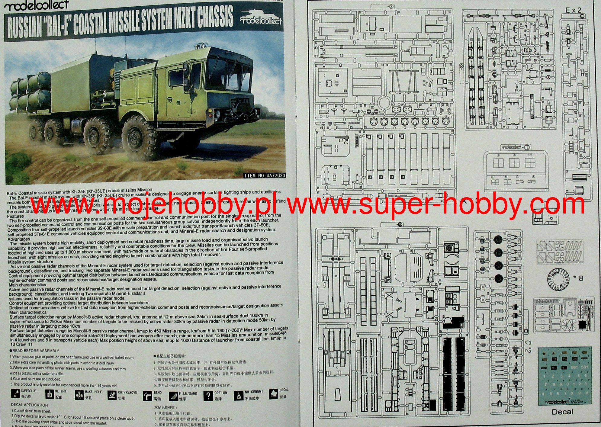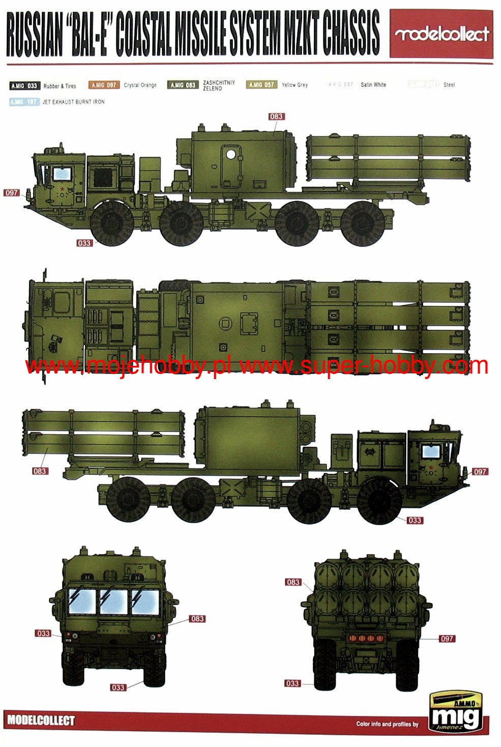 Bał-E jest współczesnym, rosyjskim systemem rakietowym klasy ziemia-woda. Pierwsze prototypy komponentów tego systemu powstały na początku lat 80. XX wieku, ale system wszedł do linii w siłach zbrojnych Federacji Rosyjskiej w 2008 roku. Bardzo często system jest zabudowany na podwoziu kołowym opartym o podwozie ciężkich ciągników siodłowych MZKT albo MAZ. System Bał-E powstał w celu zwalczania nieprzyjacielskich okrętów nawodnych o wyporności powyżej 5.000 ton. Został oparty o pociski rakietowe Kh-35 oraz Kh-35E. Są to pociski poddźwiękowe (prędkość 0,85-0,9 Ma) o zasięgu od 130 do 300 kilometrów, zdolne przenosić głowicę o masie do 145 kilogramów. Pociski mogą atakować cele nawodne przy sztormie dochodzącym do 5-6 w skali Beauforta. Jeden pojazd z pojedynczą wyrzutnią przenosi do 8 pocisków. Pierwsze jednostki systemu Bał-E weszły do służby w 2003 roku, okazując się bardzo udaną konstrukcją, na której zakup zdecydowały się również siły zbrojne Indii oraz Wietnamu. W tym ostatnim kraju rozważa się podjęcie produkcji licencyjnej tego systemu uzbrojenia. Co oprócz modelu będę potrzebować do jego sklejenia?