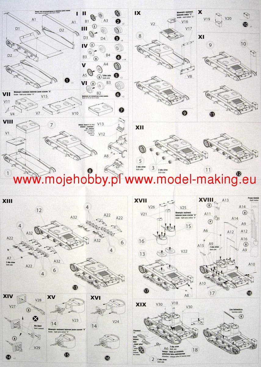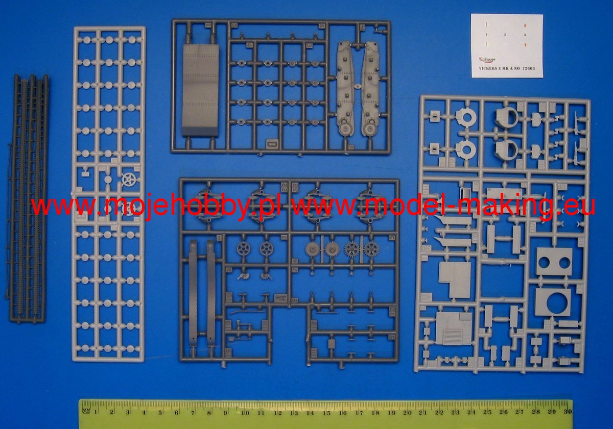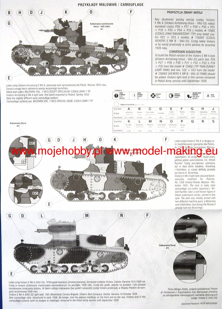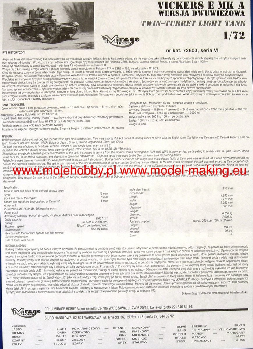 Download Mirage Hobby PDF catalogueThe Vickers E tank (Mark E or Vickers 6-ton) became an export hit to countries where the armaments industry did not produce its tanks. The prototype was built in 1928. It was originally offered to the British Army but rejected it. The tank was built in a twin-turret version as type A and in a single-turret version as type B. For the export version, the turret with the 47 mm gun was moved to the left side (which relieved the driver) and the middle part of the hull was shortened. Countries that purchased the Vickers E could also purchase a license for the tank components that were manufactured at Vickers-Armstrong. Poland managed to obtain such licenses without a special surcharge. The tank was used in the armies of Afghanistan, Bolivia, Estonia, Finland, the USSR, and even Greece, Siam or Japan. On the basis of this design, the Polish 7TP tank and the Soviet T-26 were created. Technical data (version B): length (with a barrel): 4.88m, width: 2.41m, height: 2.16m, engine power: 80-98KM, range: 160km, maximum speed (on the road): 35 km / h, armament: 1 Vickers-Amstrong Mk. E cal. 47 mm, 1 Vickers machine gun cal. 7.7 mm.