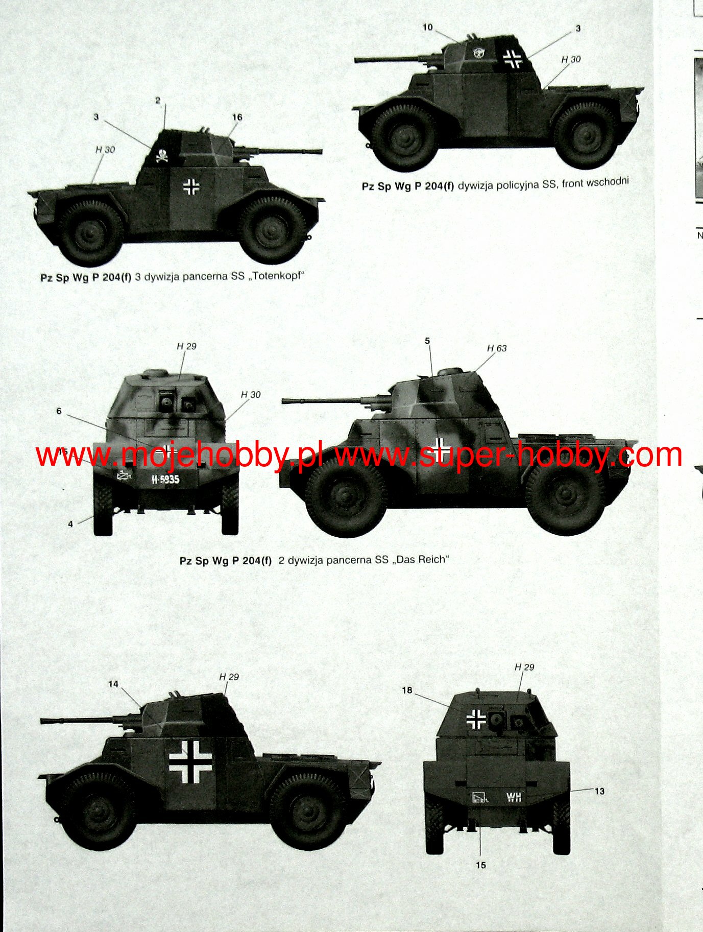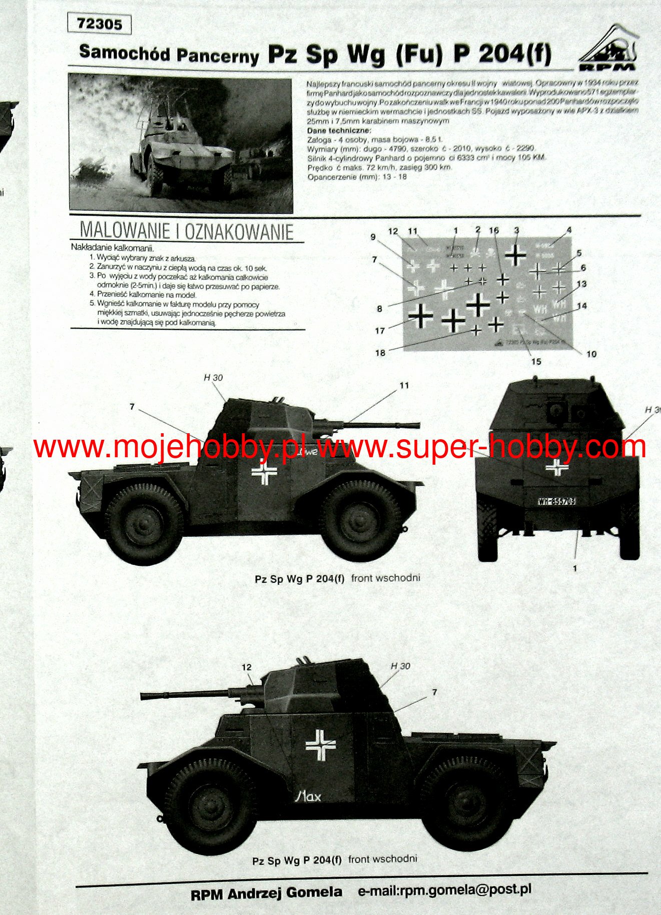 Pz.204 (f)[pełna nazwa: Panzerspähwagen P.204 (f)] is a German armored car, French production from the Second World War. The cart was 4.79 meters long and 2.01 meters wide. The drive was provided by a single engine Panhard I SK with a power of 105 HP, allowing to reach a top speed on the road of 72 km / h. Standard main armament consisted of a 25mm cannon and a single machine gun. Pz.204 (f) is, in fact, another name for the very successful French Panhard 178 armored car, which began to be used by the French armed forces in 1934. Vehicles of this type were used during the campaign in Western Europe in 1940, and their quality was very quickly appreciated by the German army, which quickly introduced the captured items into service in their own line. After the surrender of France in June 1940, the production of these cars[już pod oznaczeniem Pz.204 (f)] was continued for the needs of the German army and lasted until 1944! It is worth adding that the Germans created two interesting modifications of this car. The first is a rail reconnaissance vehicle (Ger. Schienenpanzer ), thus modifying 43 vehicles after 1941. On the other hand, in 1944, the Germans rebuilt about 30 cars of this type by placing a 50 mm cannon (in a stationary casemate) in them.