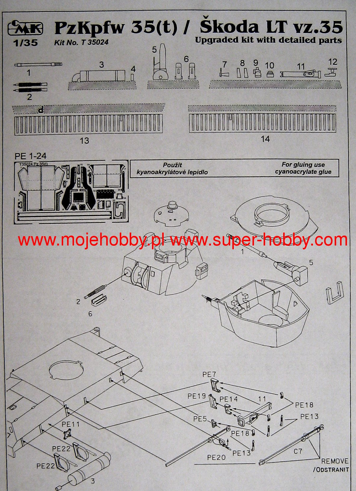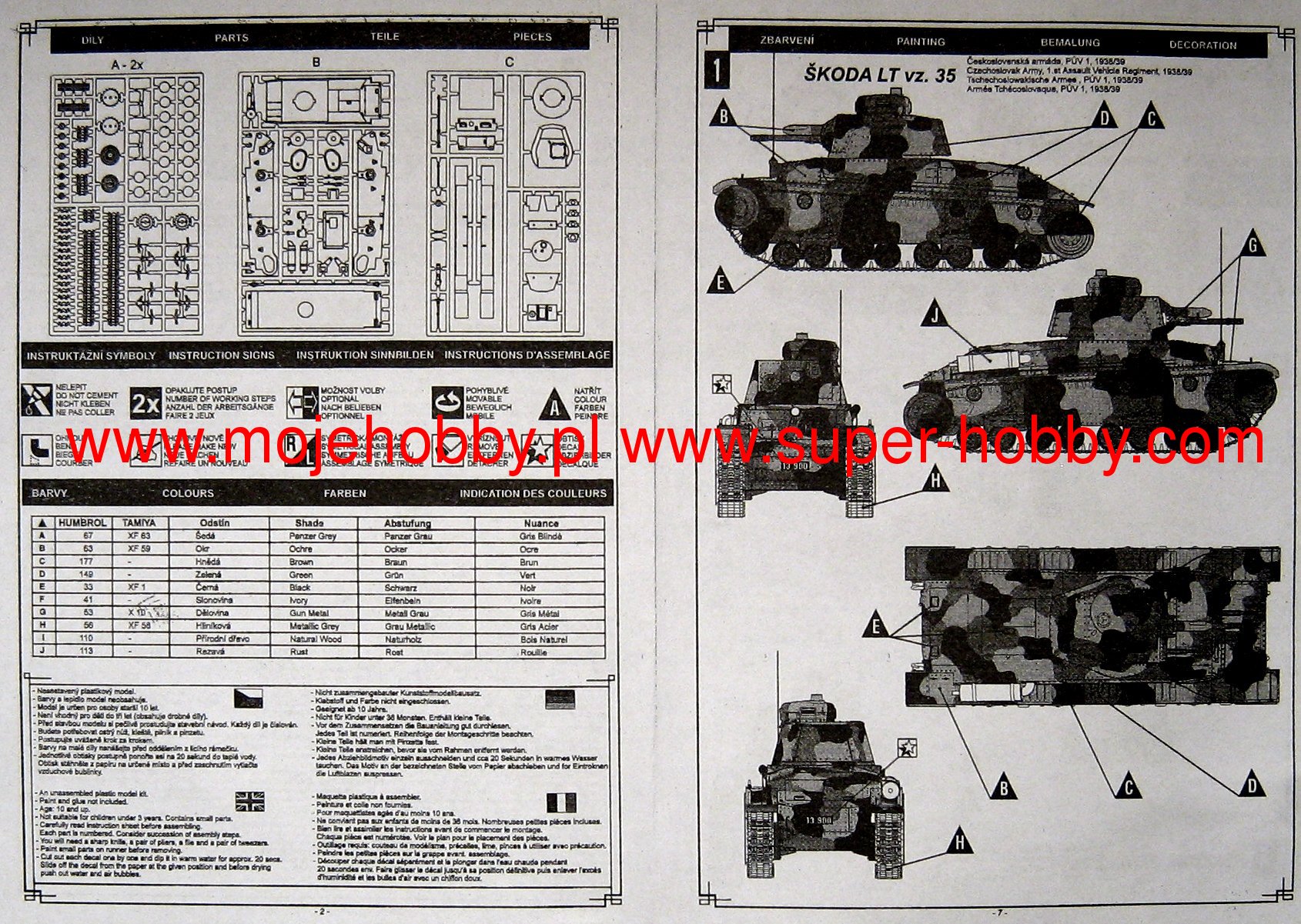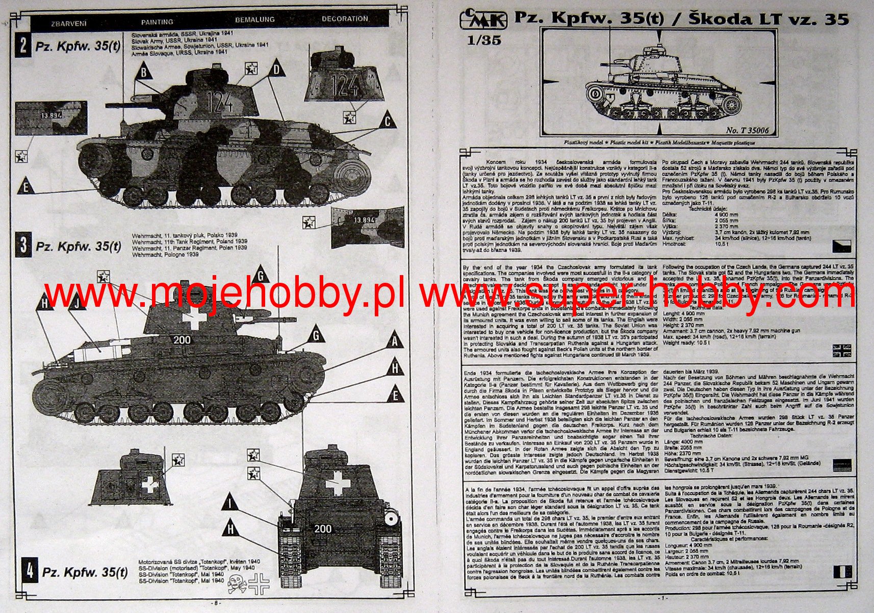 LT vz. 35 lub też Panzerkampfwagen 35 (t) był pierwotnie czechosłowackim, a później niemieckim czołgiem lekkim z okresu II wojny światowej. Pierwsze prototypy pojazdu powstały w 1935 roku, a produkcja seryjna trwała w okresie 1936-1939, kończąc się wytworzeniem ok. 430 wozów. Czołg był napędzany pojedynczym silnikiem Skoda T-11 o mocy 120 KM. Jego uzbrojenie stanowiła 1 armata KwK 34(t) L/40 kal. 37 mm oraz 2 karabiny maszynowe MG35 (t) lub MG 37(t) kal. 7,92 mm. LT vz. 35 powstał w odpowiedzi na zapotrzebowanie ogłoszone przez armię czechosłowacką w 1934 roku na nowy czołg lekki uzbrojony w armatę kal. 37 mm. Produkcji podjęły się zakłady Skoda, we współpracy z firmą CKD. Czołg LT vz. 35 okazał się konstrukcją lepszą od niemieckich Panzer I i Panzer II, przy czym trapiony był problemami z system chłodzenia, skrzynią biegów oraz zwłaszcza na początku produkcji zawieszeniem. Pomimo tych niedoskonałości czołg został wyeksportowany do Rumunii. Czołg LT vz. 35 po opanowaniu Czechosłowacji przez III Rzeszę został przejęty przez Wehrmacht pod nazwą Panzerkampfwagen 35 (t), ale jego produkcja nie była już kontynuowana. Czołg wziął udział w kampanii wrześniowej w 1939 roku, w kampanii francuskiej w 1940 roku oraz w początkowym okresie wojny z ZSRR. Od końca 1941 roku był jednak wycofany ze służby ze względu na zbyt słabe opancerzenie oraz za słabe uzbrojenie główne. Co oprócz modelu będę potrzebować do jego sklejenia?