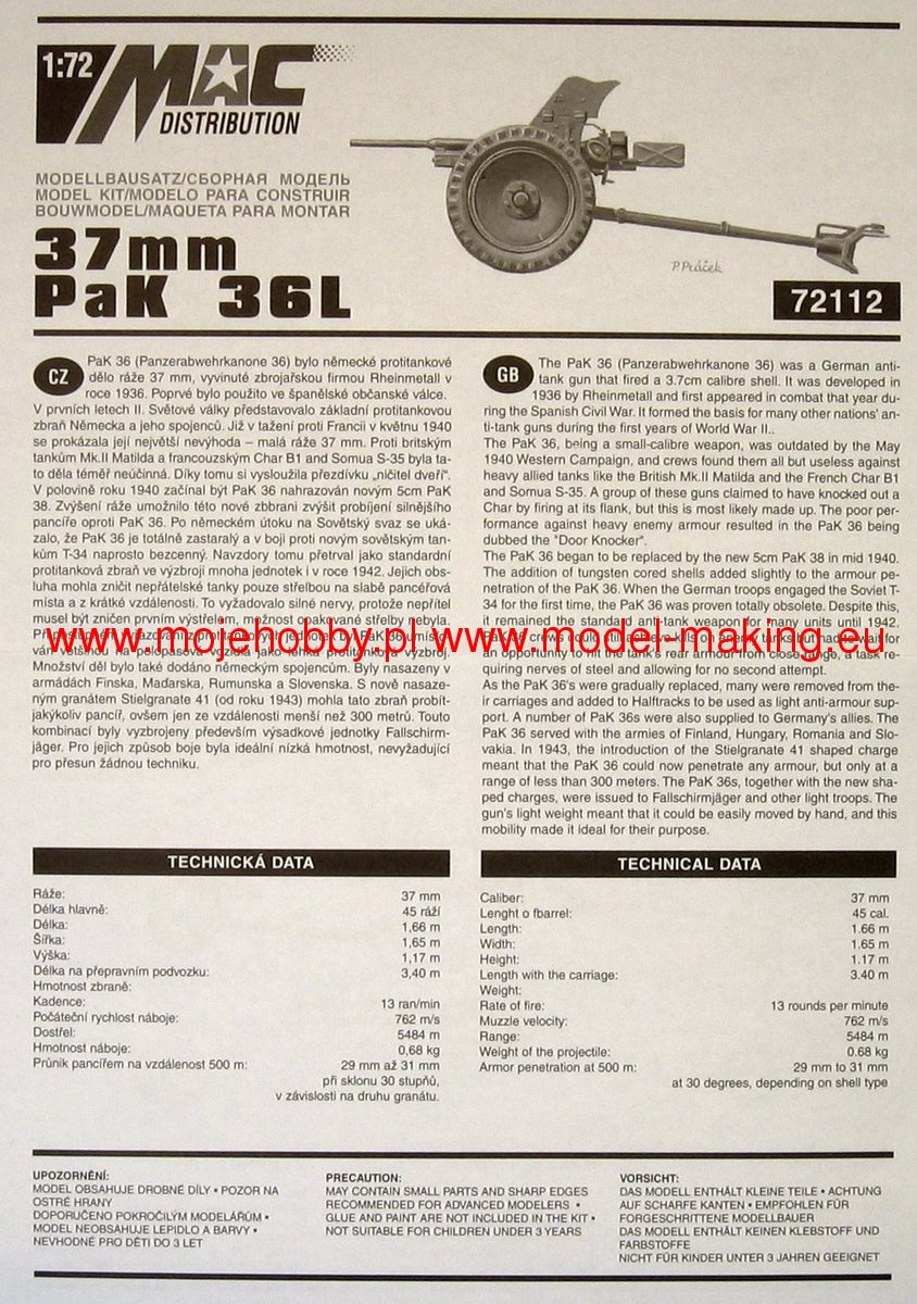 The 3.7 cm PaK 36 (Panzerabwehrkanone 36) is a German 37mm anti-tank gun. It was developed in the 1920s by the Rheinmetall concern, it entered service in 1928. In 1936 it received the designation Pak 35/36. Under the designation of 3.7 cm KwK 36 L45, it was mounted in the Pz.Kpfw III Ausf tanks. AG. At the time of its entry into the German army, it was a very modern weapon. However, over the years, its quality and effectiveness against new tanks decreased. The gun turned out to be weak during the September campaign, and during the "Blitz" in the West in 1940 it was completely useless against many Allied tanks. For this reason, it gained the unflattering nickname "door knocker". However, it survived in the German army until the operation "Barbarossa" and fought against the T-34 and KW-1, showing its utter uselessness. From 1941, it was systematically replaced by the Pak 38. Technical data: range: 7000 m, caliber: 37 mm, combat weight: 328 kg, initial velocity: 762 m / s, rate of fire: 13 spins / min.The German experience of World War I clearly showed the great role of artillery on the battlefield and often the decisive influence that artillery had on infantry. At the same time, however, the limitations of the Versailles Treaty of 1919 hindered the development of this type of weapon in Germany in the 1920s, and in particular - the introduction of heavy artillery into line units. This state of affairs changed after the Nazis took power in 1933, when the process of virtually unrestrained armaments began. Many of the gun models developed earlier went into wide production. At that time (after 1933), several new types of guns were put into service on a really large scale, including: 10.5 cm leFH 18 or 15 cm SIG 33, i.e. the basic light and heavy howitzer of the German infantry during World War II. It is worth adding that the German army attached great importance to the role of artillery (especially heavy artillery) on the battlefield. For example, at the outbreak of World War II, the German infantry division had 20 75mm light infantry guns, 6 150mm heavy guns, 36 105mm light howitzers and 12 150mm heavy howitzers in stock. It is worth noting that the German tactic of using artillery put emphasis primarily on the accuracy of firing, which in turn had a negative impact on the speed of entering the action.