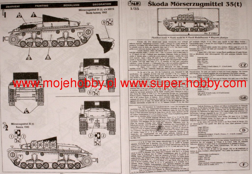 Mörser Zugmittel 35 (t)[inna nazwa: Artillerie Schlepper 35(t)] was a German ammunition transporter and artillery tractor from the Second World War. The length of the vehicle was 4.9 meters and a width of 2.06 meters. The drive was provided by a single engine Skoda T-11 with a power of 120 HP. The Mörser Zugmittel 35 (t) was a far-reaching conversion of the Pz.Kpfw. 35 (t), which were taken over by the German army several hundred as a result of the capture of Czechoslovakia in March 1939. These tanks were used in the early days of World War II with some success, but in the course of the first months of fighting in the Soviet Union in 1941, it became clear that they no longer met the requirements of the battlefield. For this reason, at the turn of 1941/1942, a decision was made to convert a large part of these cars into specialized vehicles. One of such cars was the Mörser Zugmittel 35 (t). In total, about 25 vehicles of this type were built. The modernization mainly involved the dismantling of the turret with the main armament, in place of which a thin armor plate was installed. Mörser Zugmittel 35 (t) cars were used until the end of World War II.