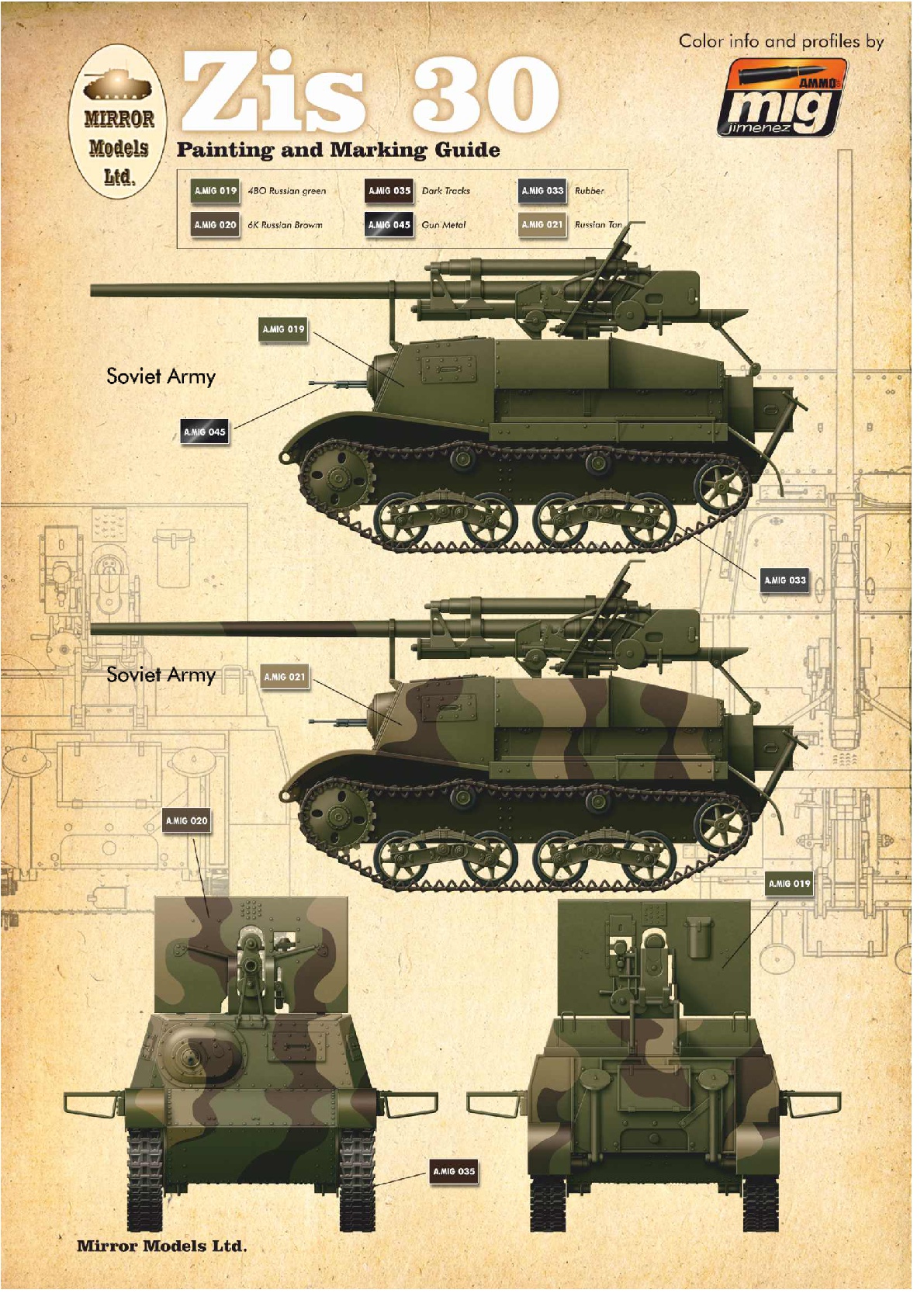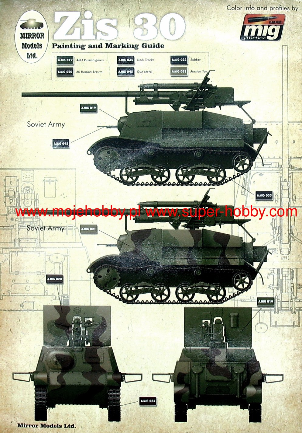 ZIS-30 był radzieckim, lekkim niszczycielem czołgów z okresu II wojny światowej. Pierwsze prototypy pojazdu powstały w 1941 roku, a produkcja seryjna trwała najpewniej w okresie 1941-1942, kończąc się wytworzeniem ok. 100 wozów. ZIS-30 był napędzany pojedynczym silnikiem GAZ-M o mocy 50 KM. Jego uzbrojenie stanowiła armata przeciwpancerna ZIS-2 kal. 57 mm. W związku z ogromnymi stratami w broni pancernej ponoszonymi przez Armię Czerwoną w pierwszej fazie wojny z III Rzeszą (czerwiec-grudzień 1941 r.) jej dowództwo postanowiło już w toku wojny opracować nowy niszczyciel czołgów. Jako, że czas grał ogromną rolę postanowiono osadzić sprawdzoną armatę ZIS-2 na podwoziu ciągnika artyleryjskiego T-20 Komsomolec. Zadanie zlecono zakładom w mieście Gorki, które wywiązały się z zadania w błyskawicznym tempie. W rezultacie powstał mało udany ZIS-30 niszczyciel czołgów o świetnej jak na rok 1941 armacie przeciwpancernej, ale o słabej manewrowości i nie zapewniający swej załodze jakiejkolwiek osłony przed wrogim ostrzałem. Pojazdy ZIS-30 zostały wykorzystane na szerszą skalę w toku walk odwrotowych w 1941 roku oraz w toku kontrofensywy spod Moskwy na przełomie lat 1941-1942. Najpewniej na początku 1942 roku zaniechano produkcji ZIS-30 na rzecz czołgów T-34. Co oprócz modelu będę potrzebować do jego sklejenia?