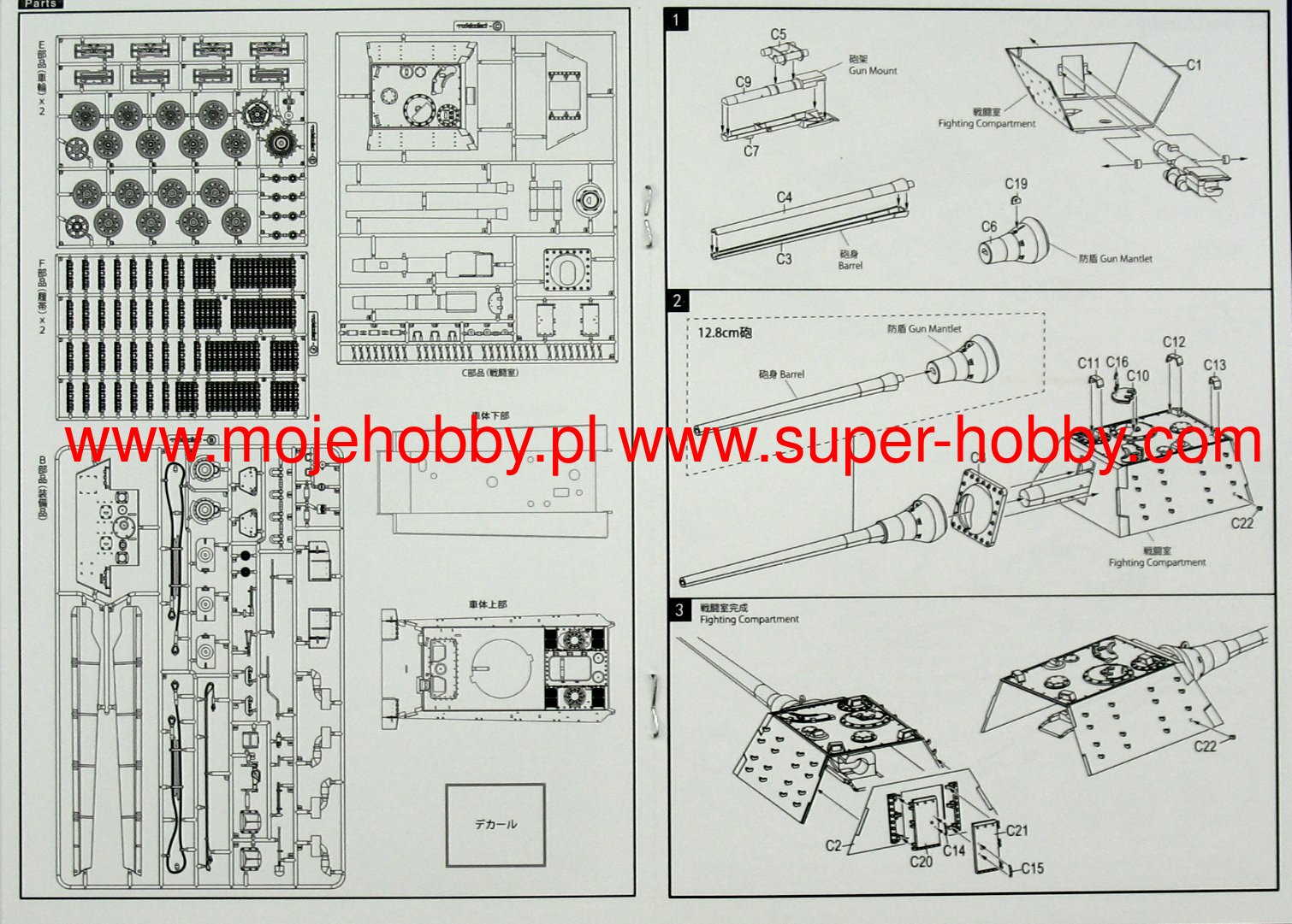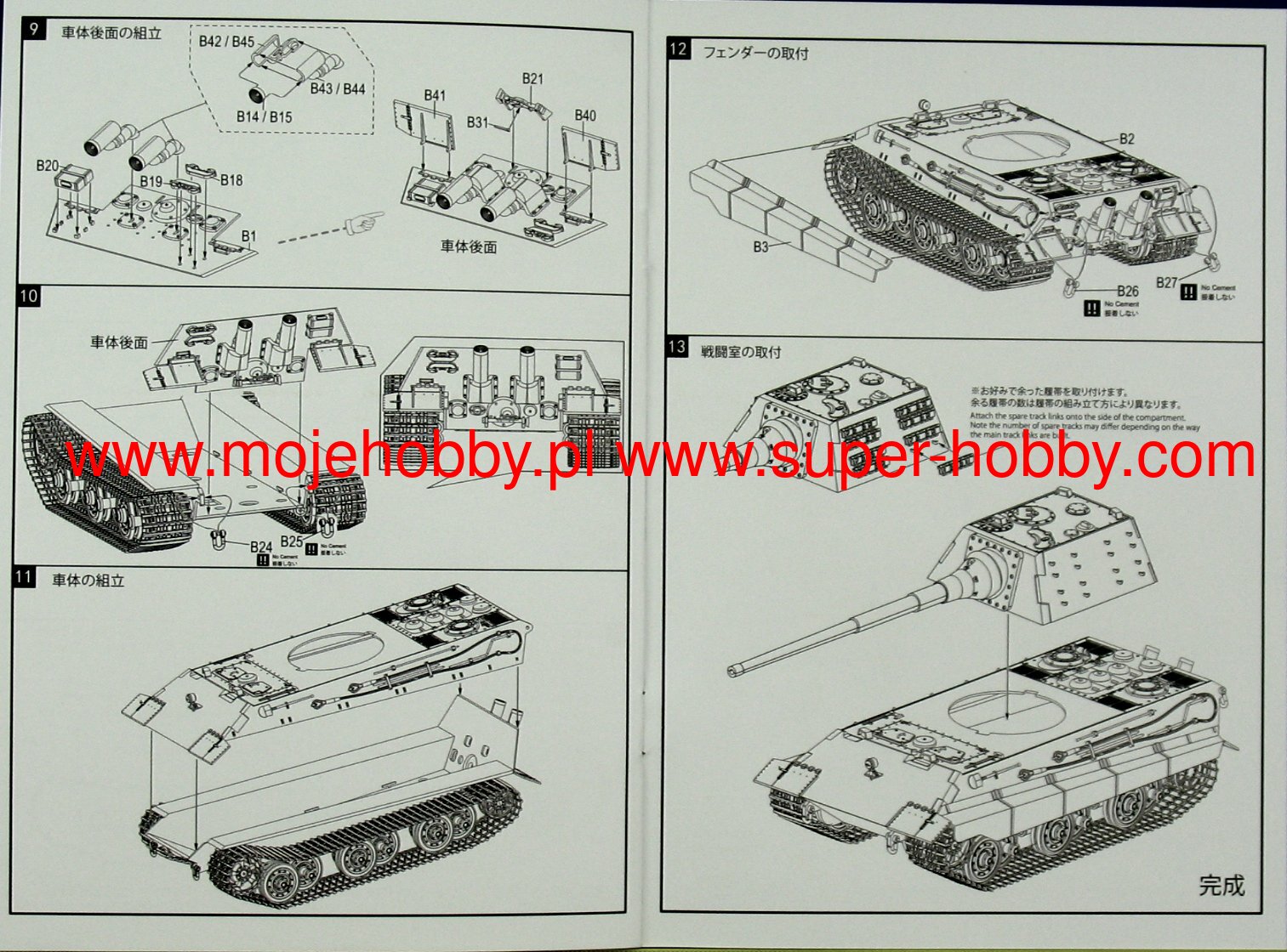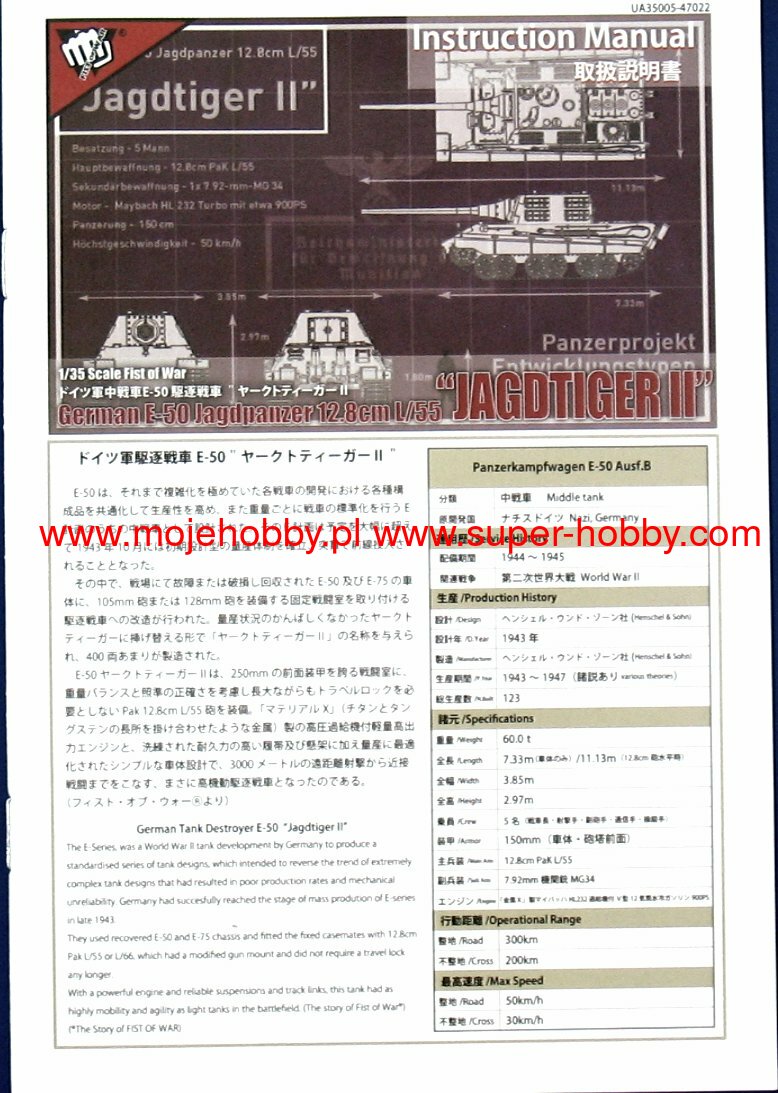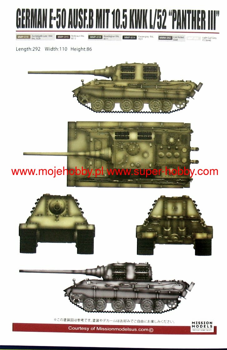The E-50 Standardpanzer was an experimental German WWII Main Battle Tank that never entered mass production. It was probably armed with a 88mm KwK 43 L / 71 gun and 1 or 2 machine guns. MG34 or MG42 cal. 7.92 mm. Design work on the E-50 tank was initiated in as part of the Entwicklungsserie program, i.e. a program for the development of German armor, which was to lead to the creation of a standardized design for a series of six combat vehicles of different weights, but using as many common components as possible. Analytical and conceptual work under this program was initiated in mid-1943. The E-50 tank in this project was to be the main tank of the German army, fulfilling a universal role on the battlefield, i.e. having the mobility of a medium tank, but the firepower of a heavy tank. The hull and chassis of the E-50 were to be largely based on that used in the Pz.Kpfw. VI Tiger II, while the turret was to come from another experimental tank - the Panther Ausf. F - the so-called Schmallturm. Ultimately, the E-50 was to replace the Pz.Kpfw V Panther and the Pz.Kpfw VI Tiger tanks in the line.