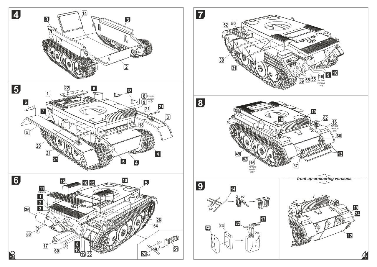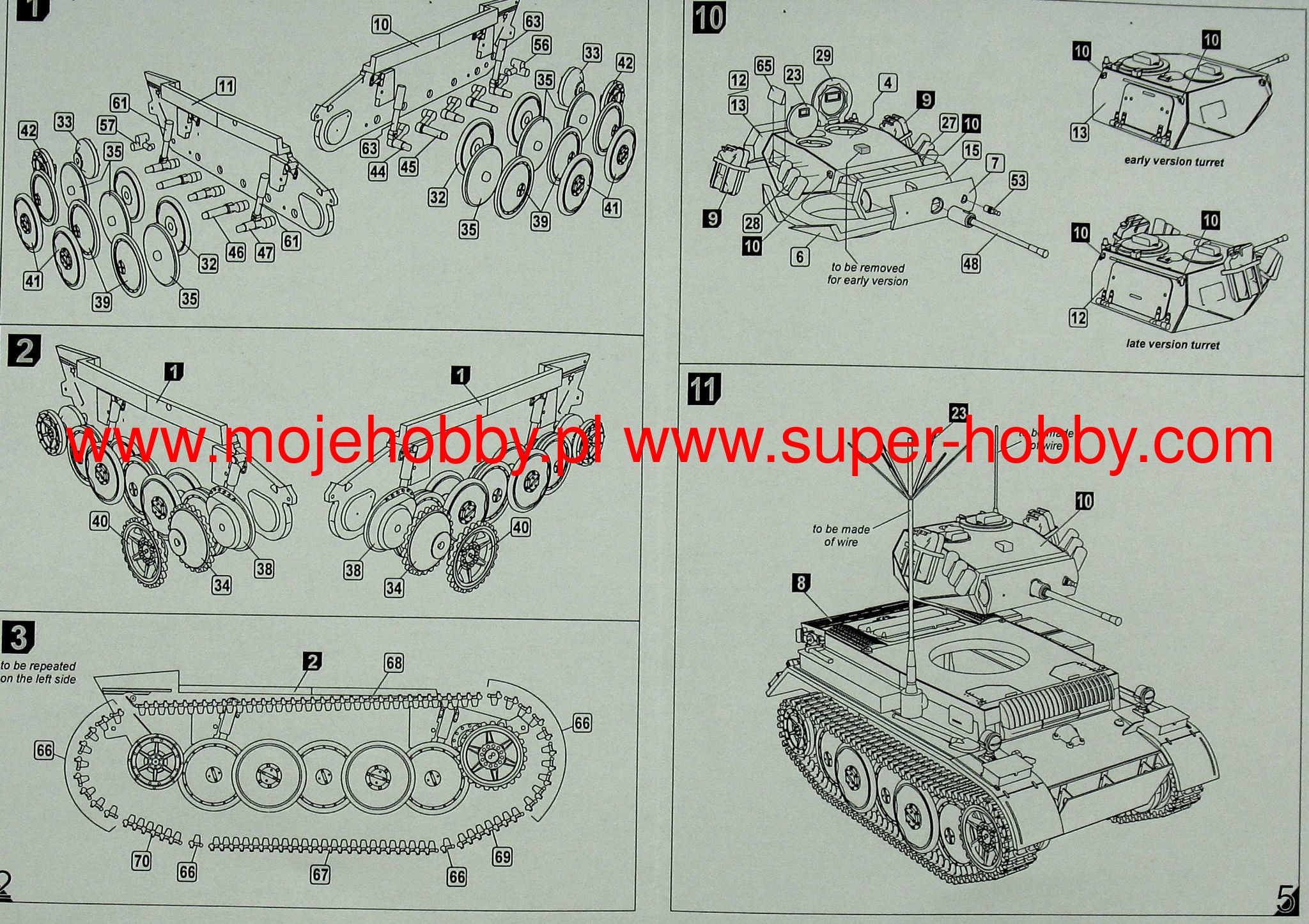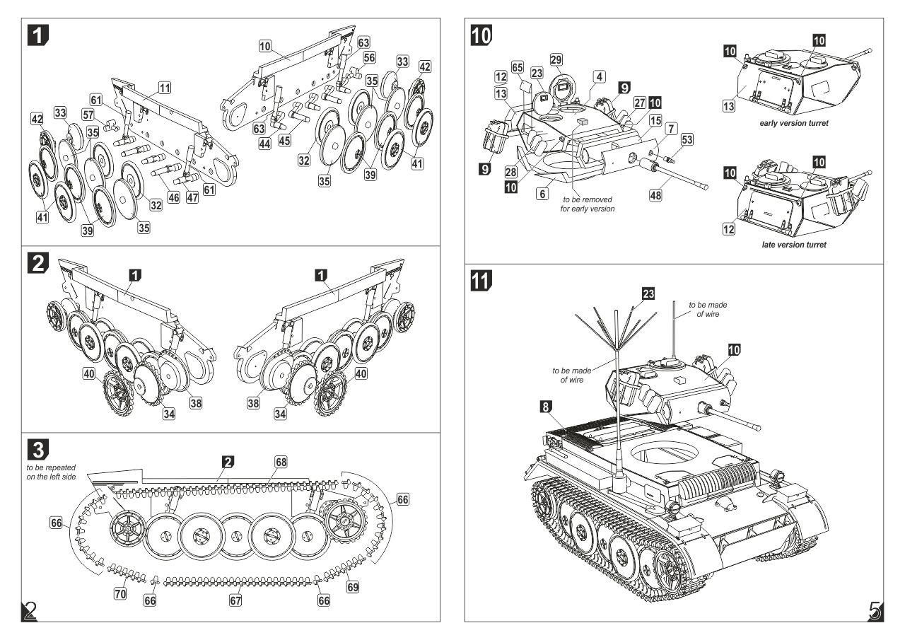 The PzKpfw II (Panzerkampfwagen II) was a German light tank from the Second World War. The first prototypes of the vehicle were created in 1934, and serial production continued in the period 1935-1944, ending with the production of about 1,850 cars. The A version of the tank was powered by a single Maybach HL 57 TR engine with a capacity of 130 HP. It was armed with 1 20mm KwK 30 gun and 1 7.92mm MG 34 machine gun. placed in the tower. PzKpfw II was created as a result of a competition announced by the German Armaments Bureau for a light tank weighing up to 10 tons, armed with a 20 mm gun. The competition was won by MAN in cooperation with Daimler-Benz. Serial production started in 1935, and many variants of the PzKpfw II tank were created during it. Chronologically, the first was version A, but it was produced in relatively small quantities. Soon after, version B was created, which already had a new, more powerful engine and a changed chassis. Already in 1937, the C version was created, with a substantially changed chassis and reinforced frontal hull armor. At the end of 1940, the F version was created, which had stronger armor and a better gearbox than the C version. In 1942, the production of the L ("Luchs") version began, which had a completely new chassis, a new 180 HP engine and significantly increased speed maximum - from 40 km / h to 60 km / h. Numerous other vehicles were also built on the chassis of the PzKpfw II, such as the Wespe self-propelled howitzer or the Marder II tank destroyer. PzKpfw II tanks were used on almost all fronts of World War II, and from 1942 they were assigned to secondary tasks.