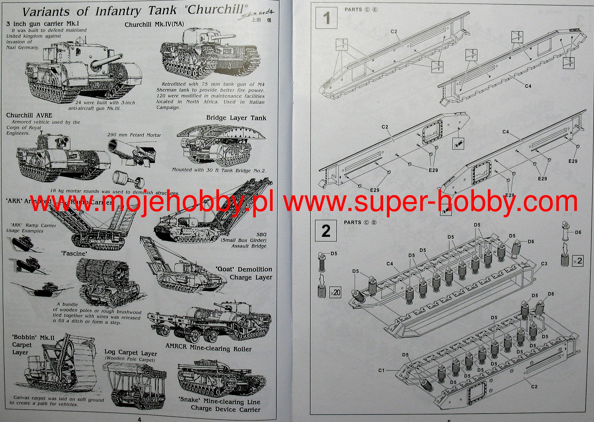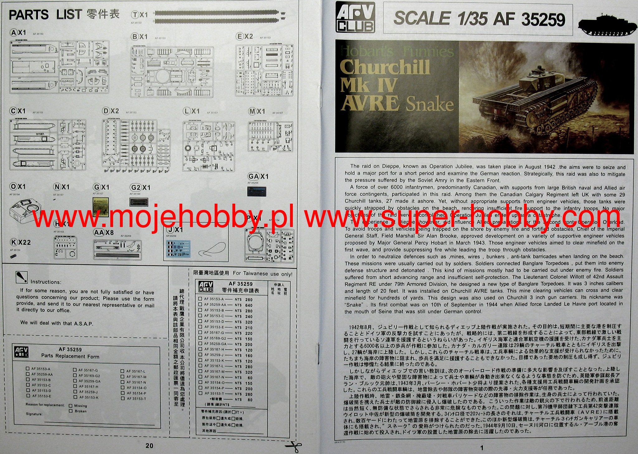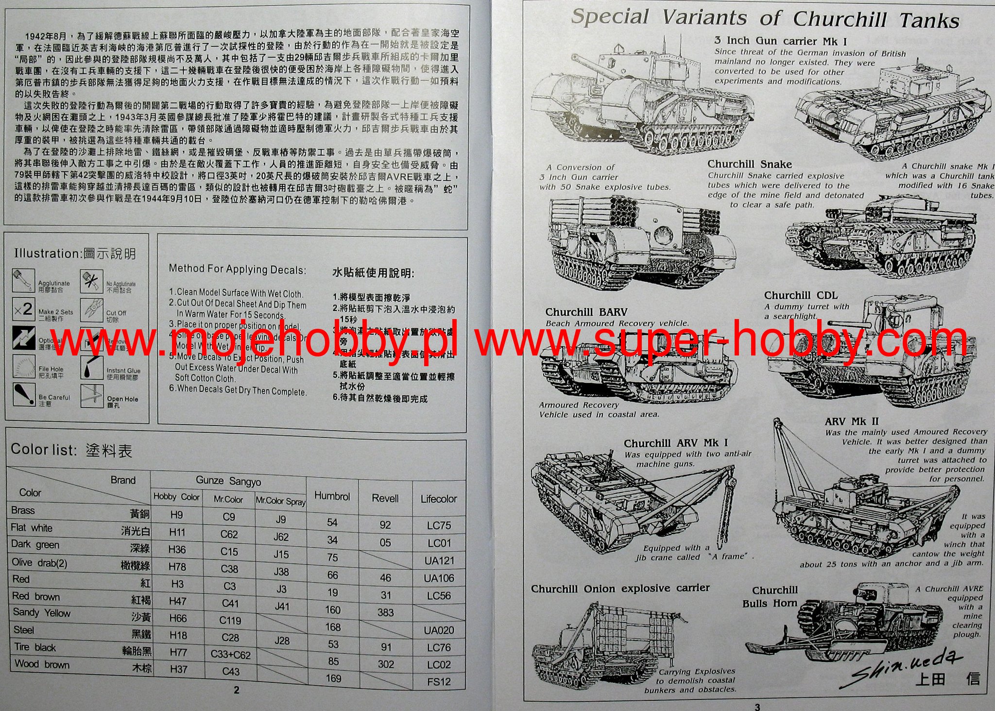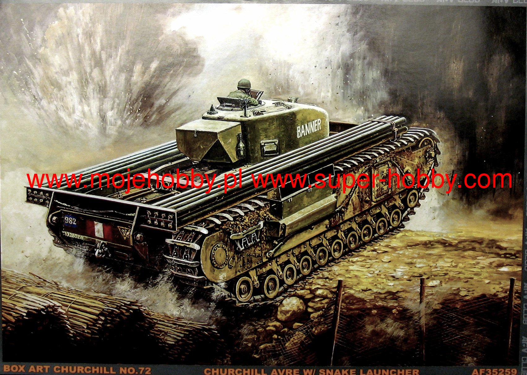The Churchill A22 was a British heavy infantry tank of the Second World War. The first prototypes were built in 1940, and serial production was carried out in the period 1941-1945. In total, about 7,400 copies of this tank of all versions were produced, which makes it one of the most produced British tanks during the Second World War. Churchill it was powered by an engine Bedford 350 hp. The armament of the vehicle is - depending on the version - a single 40mm, 57mm or 75mm cannon or a 95mm howitzer and two 7.92mm Besa machine guns. Tank Churchill was constructed on the basis of a modified design of the A20 tank, which was built before 1939. Due to the huge losses in equipment suffered by the British army in the French campaign in 1940, the new vehicle was quickly put into mass production. It turned out to be a big mistake, because the first versions of the tank Churchill were underdeveloped, emergency and not very friendly to their crews. However, by 1942 most of the tank's defects revealed in the course of its operation had been removed and it turned out that the Churchill was quite a successful design. It had strong armor, good ability to overcome terrain obstacles and a low silhouette that facilitated the camouflage of the car. The disadvantages were poor armament and low top speed - only 13 km / h in the field! A dozen or so versions of this tank were made in the course of serial production. Chronologically, the first was the Churchill I, armed with a 2-pounder 40 mm gun in the turret and 76.2 mm howitzer in the hull of the vehicle - but it was highly underdeveloped and had a high failure rate. Churchill III soon followed - it had only the new 57mm ROQF 6-pounder gun in the turret and better armor. The version IV was very similar to version III - the most widely produced version, differing only in the method of turret production. Another major change came with the Churchill VII version, which received a 75mm main gun and clearly reinforced frontal armor. There was also a version VIII with the main armament of the 95 mm caliber howitzer in the turret. Specialized versions of Churchill also appeared. One of the more interesting ones is the Churchill AVRE, armed with a powerful 290 mm Petard mortar and designed to destroy enemy fortifications, or the Churchill Crocodile with a flamethrower at the front of the hull. Churchill tanks were sent to the USSR as part of the Lend-and-Lease program, and they were also used by the Canadian army and the Polish Armed Forces in the West (PES).