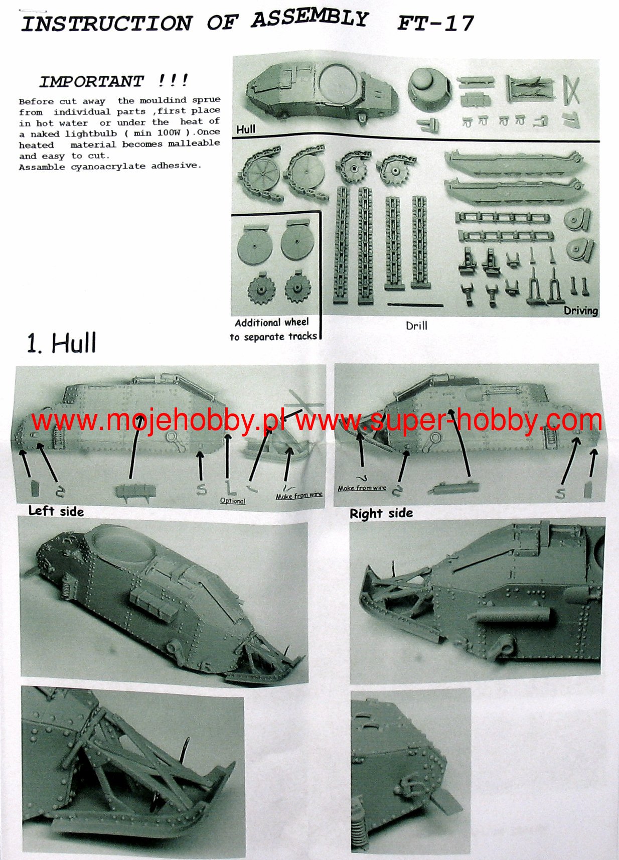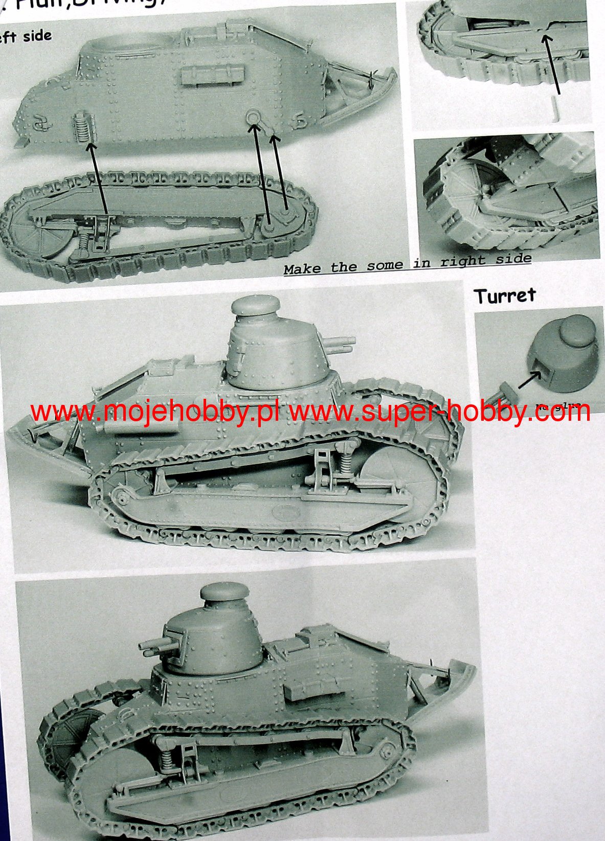 Renault FT-17 французский лёгкий танк времён Первой мировой войны. Первые опытные образцы автомобиля были созданы в конце 1916 г., а серийное производство началось в 1917 г. и продолжалось до 1919 г., завершившись выпуском около 3700-4000 автомобилей. Танк был оснащен одним карбюраторным двигателем Renault 18CV мощностью 35 л.с. Его основным вооружением была либо одна пушка Puteaux, 37мм L/21 или 1 7,92-мм пулемет Гочкиса. Вооружение устанавливалось в круглой литой башне фирмы Renault или конической клепаной башне фирмы Berliet. Renault FT-17 был одним из самых революционных проектов танков Первой мировой войны, так как это была первая в истории машина с классической танковой компоновкой: место механика-водителя располагалось спереди, боевое отделение с вращающейся башней сзади. разместили посередине, а моторный отсек сзади. Эта компоновка сохранилась в танках и по сей день, благодаря высокой функциональности. Renault FT-17 тоже был небольшого размера и имел экипаж всего из двух человек, что было неслыханно по сравнению с другими танками того периода! Renault FT-17 также получил специальный хвост в задней части фюзеляжа, облегчавший ему преодоление траншей на поле боя. Машина, дебютировавшая на поле боя 31 мая 1918 года, провоевала до конца войны, зарекомендовав себя как самый боеспособный и надежный танк французской армии. После 1918 года он широко экспортировался (например, в Польшу или США), часто являясь первым танком в истории вооруженных сил данной страны. Итальянский танк FIAT 3000 и советский МС-1 также были основаны на его конструкции. Renault FT-17 оставался на вооружении французской и польской армий вплоть до начала Второй мировой войны, но на тот момент воспринимался как полностью устаревшая конструкция.