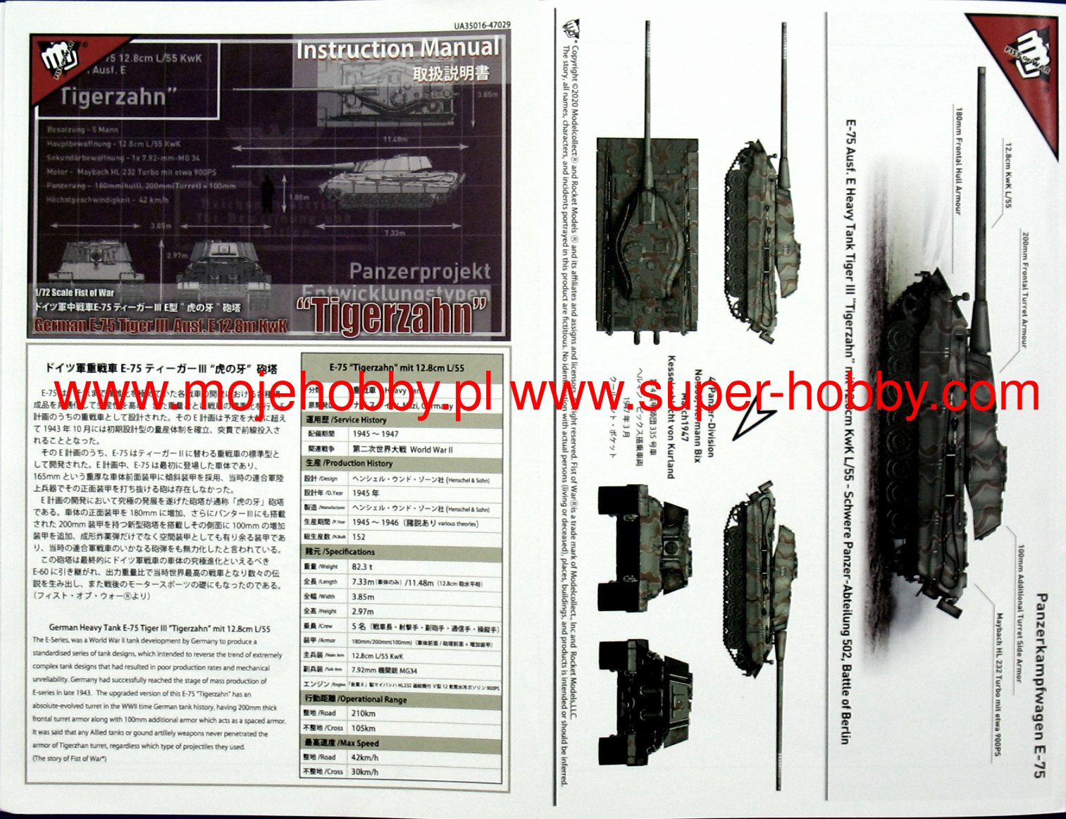 The E-75 was an experimental German heavy tank from the Second World War that never entered mass production. It was probably armed with the KwK 43 L / 71 or L / 100 88 mm cannon or the 105 mm long-range cannon and 1 or 2 machine guns MG34 cal. 7.92 mm. Design work on the E-75 tank was initiated in as part of the Entwicklungsserie program, i.e. a program for the development of German armor, which was to lead to the creation of a standardized design for a series of six combat vehicles of different weights, but using as many common components as possible. Analytical and conceptual work under this program was initiated in mid-1943. The E-75 tank in this project was to be a new heavy tank of the German army, in which particular emphasis was placed on possibly thick armor and the greatest possible ability to fight enemy armored vehicles. Most likely, the vehicle was to use an appropriately rebuilt and redesigned Schmallturm turret and - most likely - the hull and chassis of the Pz.Kpfw VI Tiger II, which it was to eventually replace in the line.