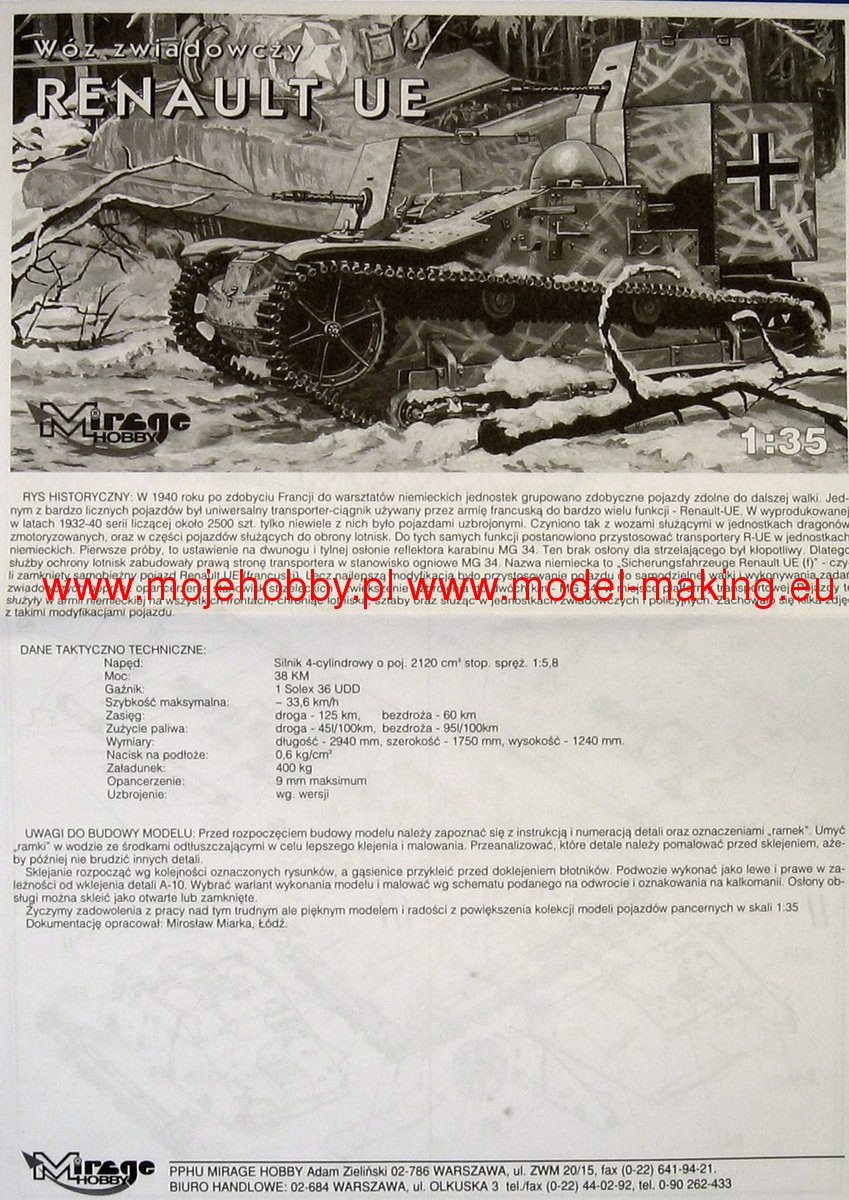 The Renault UE was a French universal tracked vehicle from the Second World War. The first prototypes of the vehicle were created in the early 1930s, and serial production began in 1932, ending with the production of approx. 4,500-5,000 vehicles. The basic version of the vehicle was powered by a Renault 85 engine with 38 HP. The basic Renault UE did not have fixed armament. At the end of the 1920s, the command of the French army decided to create a lightweight, universal tracked vehicle that could serve as both a tankette and an artillery tractor. After numerous field tests, it was decided to put the Renault UE vehicle into production. During the service, vehicles of this type were used primarily for the transport of 25 mm anti-tank guns and as ammunition vehicles. A symbolic amount of Renault UE was sold to China and Romania before the outbreak of World War II. After the defeat of France in 1940, many vehicles of this type fell into the hands of the Wehrmacht, which used them, for example, to protect bases or airports, but also as light artillery tractors. After 1945, the vehicles that survived the war were incorporated into the French army again. A number of Renault UEs were armed with a machine gun and shipped to Indochina.Download Mirage Hobby PDF catalogue